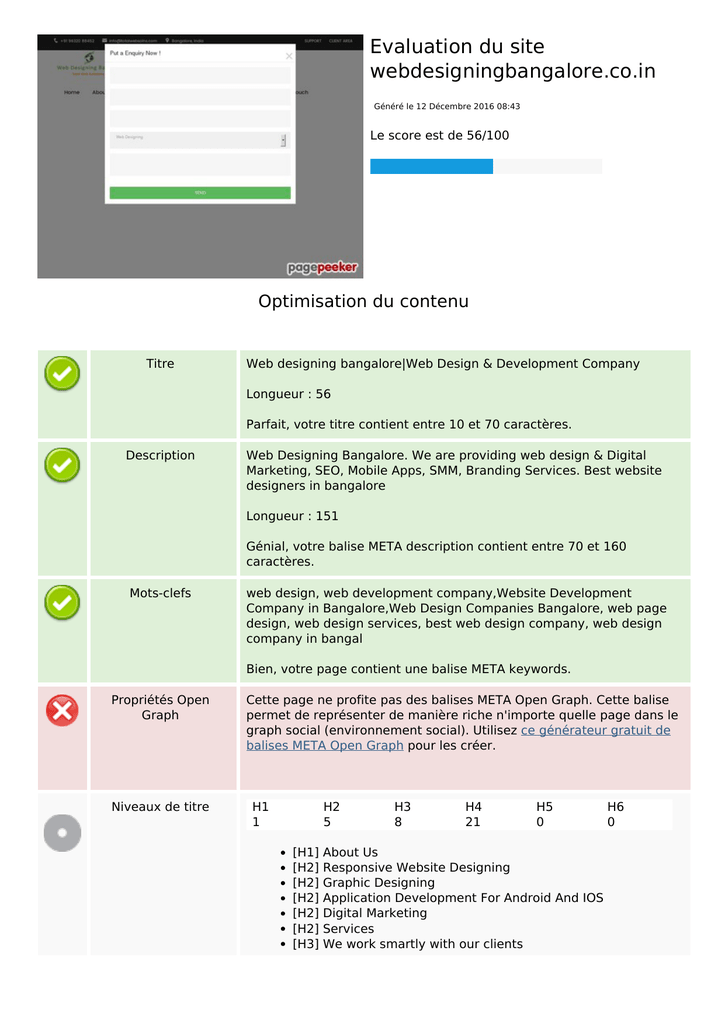 Evaluation du site webdesigningbangalore.co.in Généré le 12 Décembre 2016 08:43 Le score est de 56/100 Optimisation du contenu Titre Web designing bangalore|Web Design & Development Company Longueur : 56 Parfait, votre titre contient entre 10 et 70 caractères. Description Web Designing Bangalore. We are providing web design & Digital Marketing, SEO, Mobile Apps, SMM, Branding Services. Best website designers in bangalore Longueur : 151 Génial, votre balise META description contient entre 70 et 160 caractères. Mots-clefs web design, web development company,Website Development Company in Bangalore,Web Design Companies Bangalore, web page design, web design services, best web design company, web design company in bangal Bien, votre page contient une balise META keywords. Propriétés Open Graph Niveaux de titre Cette page ne profite pas des balises META Open Graph. Cette balise permet de représenter de manière riche n'importe quelle page dans le graph social (environnement social). Utilisez ce générateur gratuit de balises META Open Graph pour les créer. H1 1 H2 5 [H1] [H2] [H2] [H2] [H2] [H2] [H3] H3 8 H4 21 H5 0 About Us Responsive Website Designing Graphic Designing Application Development For Android And IOS Digital Marketing Services We work smartly with our clients H6 0 Optimisation du contenu [H3] [H3] [H3] [H3] [H3] [H3] [H3] [H4] [H4] [H4] [H4] [H4] [H4] [H4] [H4] [H4] [H4] [H4] [H4] [H4] [H4] [H4] [H4] [H4] [H4] [H4] [H4] [H4] Images Our portfolio Project Title C.S.HAWKLER Project Title Beach valley Project Title Theagan Fashion Project Title Metalkarma Our team What clients say about us how we work Research Design Launch team members team members Praneeth D Tarun Bhagat Ananad Kannan Sneha Mahalank Testimonials C.S.HAWKLER Theagan Fashion Beachvalley Resort StartTopia Pinks And Blues Arcadian Trade Address Contact Email Put a Enquiry Now ! Nous avons trouvé 16 image(s) sur cette page Web. 2 attribut(s) alt sont vides ou manquants. Ajouter un texte alternatif permet aux moteurs de recherche de mieux comprendre le contenu de vos images. Ratio texte/HTML Ratio : 17% Bien, le ratio de cette page texte/HTML est supérieur à 15, mais inférieur à 25 pour cent. Flash Iframe Parfait, aucun contenu FLASH n'a été détecté sur cette page. Génial, il n'y a pas d'Iframes détectés sur cette page. Liens Réécriture d'URLs Bien. Vos liens sont optimisés! Liens Tiret bas dans les URLs Nous avons détectés des soulignements dans vos URLs. Vous devriez plutôt utiliser des tirets pour optimiser votre référencement. Liens dans la page Nous avons trouvé un total de 19 lien(s) dont 0 lien(s) vers des fichiers Statistics Liens externes : noFollow 0% Liens externes : Passing Juice 31.58% Liens internes 68.42% Liens dans la page Texte d'ancre Type Juice support Interne Passing Juice Home Interne Passing Juice About Us Interne Passing Juice Services Interne Passing Juice Portfolio Interne Passing Juice Our Team Interne Passing Juice Contact us Interne Passing Juice Get In Touch Interne Passing Juice View More Interne Passing Juice C.S.HAWKLER Externe Passing Juice Theagan Fashion Externe Passing Juice Beachvalley Resort Externe Passing Juice StartTopia Externe Passing Juice Pinks And Blues Externe Passing Juice Arcadian Trade Externe Passing Juice About_Us Interne Passing Juice Services Interne Passing Juice Sign In Interne Passing Juice Liens dans la page Register Interne Passing Juice Mots-clefs Nuage de mots-clefs websites design team web quality now website sign clients content Cohérence des mots-clefs Mot-clef Contenu website 6 design 3 websites 3 content 3 web 3 Titre Mots-clefs Description Niveaux de titre Ergonomie Url Domaine : webdesigningbangalore.co.in Longueur : 27 Favicon Génial, votre site web dispose d'un favicon. Imprimabilité Aucun style CSS pour optimiser l'impression n'a pu être trouvé. Langue Bien. Votre langue est : en. Dublin Core Cette page ne profite pas des métadonnées Dublin Core. Document Doctype HTML 5 Encodage Parfait. Votre charset est UTF-8. Validité W3C Erreurs : 11 Avertissements : 1 E-mail confidentialité Attention! Au moins une adresse e-mail a été trouvée en texte clair. Utilisez une protection anti-spam gratuite pour cacher vos e-mails aux spammeurs. HTML obsolètes Tags obsolètes Occurrences <font> 3 Les balises HTML obsolètes sont des balises qui ne sont plus utilisés. Il est recommandé de supprimer ou de remplacer ces balises HTML, car elles sont désormais obsolètes. Astuces vitesse Excellent, votre site n'utilise pas de tableaux imbriqués. Mauvais, votre site web utilise des styles css inline. Mauvais, votre site web contient trop de fichiers CSS (plus de 4). Mauvais, votre site web contient trop de fichiers javascript (plus de 6). Parfait : votre site tire parti de gzip. Mobile Optimisation mobile Icône Apple Méta tags viewport Contenu FLASH Optimisation Sitemap XML Votre site web dispose d’une sitemap XML, ce qui est optimal. http://webdesigningbangalore.co.in/sitemap.xml Optimisation Robots.txt Manquant Votre site ne dispose pas d’un fichier robots.txt, ce qui peut poser problème. Un fichier robots.txt vous permet d’empêcher l’accès des moteurs de recherche à certains dossiers et pages spécifiques. Ce fichier précise également où se trouve la sitemap XML. Mesures d'audience Votre site web dispose d’une outil d'analytics, ce qui est optimal. Google Analytics Powered by TCPDF (www.tcpdf.org)