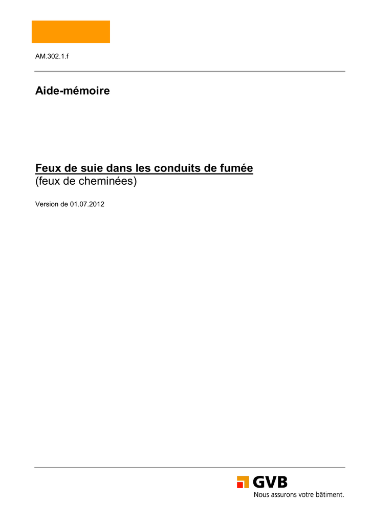 AM.302.1.f Aide-mémoire Feux de suie dans les conduits de fumée (feux de cheminées) Version de 01.07.2012 Inspectorat des sapeurs-pompiers du canton de Berne Domaine de l'intervention 1. Page 2 Bases légales - Loi sur la protection contre le feu et sur les sapeurs-pompiers (LPFSP) du 20 janvier 1994, article 13 - Ordonnance sur la protection contre le feu et sur les sapeurs-pompiers (OPFSP) du 11 mai 1994, annexe 2 : Feux de cheminée et de suie (RAM 1) 2. Détection - Flammes sortant par l'orifice de la cheminée Important jet de flammèches et développement de fumée par l'orifice de la cheminée Formation de flammes, flammèches et de braises dans la cheminée Canaux de fumée s'échauffant dans la zone intérieure (généralement perceptible avec un important décalage horaire sur la paroi extérieure de la cheminée) - Bruissements dans la cheminée et à l'intérieur du bâtiment => provoqués par les courants d'air 3. Dangers Propagation du feu par jets de flammèches, braises tombantes - Les feux de cheminées rappellent fréquemment une tempête (fort tirage dans la cheminée) - Les dépôts de suie et de goudron (suie cristallisée) dans la cheminée peuvent s'enflammer Propagation du feu par conduction thermique / rayonnement thermique - Danger existant, notamment en cas de défauts de construction de la cheminée tels que des raccordements directs au canal de fumée incorrects ou inutilisés, éléments de construction combustibles tangents - Début d'incendie possible plusieurs heures après la fin du feu de cheminée - Danger de surchauffe et d'éclatement de la cheminée Dangers dus à l'électricité - Installations électriques brûlées / fondues (conduites électriques, prises) - Surveillance des lignes aériennes au-dessus de la cheminée Détérioration de la cheminée sous l'effet de la chaleur - Danger d'écroulement de cheminée / conduit de fumée étiré - Formation de fissures et d'éclatements de la maçonnerie - Marquage des éventuelles fissures constatées sur la cheminée avec indication de l'heure (au moyen d'une craie, par exemple) - Calcination des conduits métalliques de fumée, fonte de l'isolation Rétrécissements de la section transversale - La suie brûlée se dilate et obstrue la section transversale de la cheminée (tirage de la cheminée) Assurance immobilière Berne (AIB), inspectorat des sapeurs-pompiers du canton de Berne, Papiermühlestrasse 130, 3063 Ittigen Inspectorat des sapeurs-pompiers du canton de Berne Domaine de l'intervention Page 3 - Propagation possible de la fumée par les ouvertures et les fentes - Danger de surchauffe et de formation de fentes de la cheminée (accumulation de chaleur dans le canal de cheminée) 4. Procédé, lors d'un événement - Mettre le ramoneur sur pied en tant que conseiller (par l'intermédiaire de la CER) - Éloigner tous les matériaux combustibles de la cheminée et de l'installation de chauffage (toiles d'araignées comprises) - Observer les environs et la sortie de cheminée (brandons, jets d'étincelles) - Éloigner le feu et les braises de l'installation de chauffage - Fermer l'apport d'air de l'installation de chauffage - Fermer les registres et clapets aux 2/3 (ne jamais les fermer complètement) - Dégager les alentours de la cheminée et les ouvertures de nettoyage (écarter les objets inflammables tels que des armoires, etc.). - Recouvrir le sol devant l'ouverture de nettoyage avec du matériel incombustible (p. ex., des couvertures d'extinction, sacs humides, etc.). - Disposer des sapeurs-pompiers à chaque étage avec de l'eau comme moyen d'extinction de sécurité en les protégeant contre des gaz toxiques s'échappant subitement (détérioration de la cheminée ou rabattement de la fumée par le vent) => protection respiratoire - Contrôler périodiquement l'installation de cheminée au moyen de la caméra thermique, en particulier les passages de plafonds (niveaux intermédiaires) - Préparer des ventilateurs - Fermer toutes les portes et fenêtres (en particulier les lucarnes) - Préparer des récipients métalliques pour l'élimination de la suie - Effectuer les essais d'extinction avec le seau-pompe / éventuellement un extincteur, seulement selon les indications du ramoneur et avec une grande prudence => il n'est éventuellement pas judicieux d'éteindre un feu de suie lorsqu'aucun danger particulier ne subsiste, étant donné que le ramoneur devra ensuite éventuellement procéder au brûlage complet de l'installation. C’est pourquoi, on laisse fréquemment brûler un feu de cheminée. 5. Conséquences possibles, lors de l'utilisation de moyens d'extinction Extinction avec de l'eau - Un feu de cheminée ne devrait être éteint par les sapeurs-pompiers qu'avec des soins extrêmes et exclusivement sur mandat du ramoneur. Le risque d'importants dégâts subséquents provient d'une intervention inappropriée avec de l'eau : des températures jusqu'à 1500 °C sont atteintes lors d'un feu de cheminée ; l'eau s'évapore immédiatement à l'intérieur de la cheminée ; la cheminée peut se fissurer suite à l'augmentation soudaine du volume (1 litre d'eau correspond à environ 1700 litres de vapeur) => propagation du feu. En outre, les briques des cheminées murées ne doivent pas être directement arrosées avec de l'eau (effet de choc avec fentes et éclatements). - Un effet d'extinction et de refroidissement peut être atteint, si nécessaire et sans dangers subséquents, lors d'une intervention d'extinction avec le jet diffusé d'un seau-pompe. Assurance immobilière Berne (AIB), inspectorat des sapeurs-pompiers du canton de Berne, Papiermühlestrasse 130, 3063 Ittigen Inspectorat des sapeurs-pompiers du canton de Berne Domaine de l'intervention Page 4 Extinction avec de la mousse - Voir le chapitre "Extinction avec de l'eau" Extinction avec de la poudre - L'extinction avec de la poudre n'est en principe pas proscrite même si elle est très délicate du point de vue de la