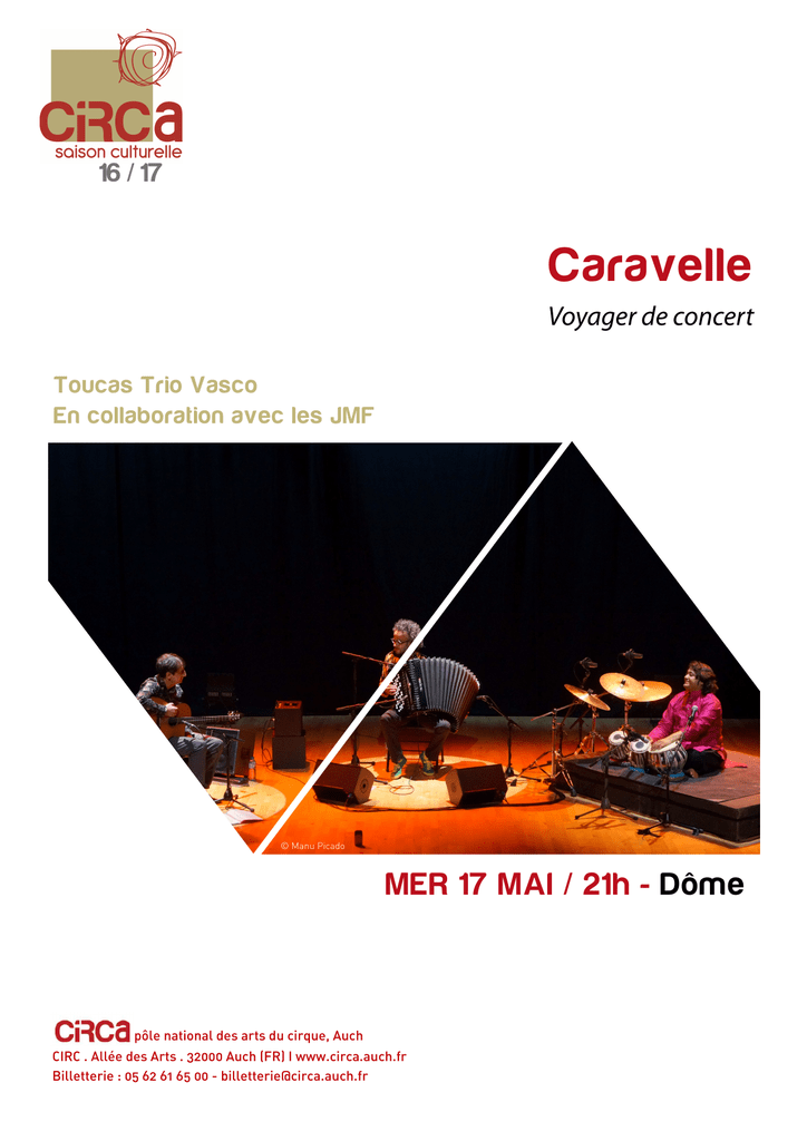16 / 17 Caravelle Voyager de concert Toucas Trio Vasco En collaboration avec les JMF © Manu Picado MER 17 MAI / 21h - Dôme pôle national des arts du cirque, Auch CIRC . Allée des Arts . 32000 Auch (FR) I www.circa.auch.fr Billetterie : 05 62 61 65 00 - [email protected] Le spectacle V oici une bien étrange réunion : une guitare, un accordéon et des tablas (percussions indiennes) embarqués ensemble dans un drôle de voyage ! Sur les traces du navigateur Vasco de Gama, telle une caravelle musicale, le Toucas Trio Vasco nous entraîne sur la route des Indes, de Lisbonne à Calicut, d’un fleuve à l’autre, de mers en océans, à la rencontre de traditions rythmiques et mélodiques pleines de vie. Fado, flamenco, musique tsigane, maqamat persans et ragas malais révèlent toute leur richesse sous les doigts de ces trois musiciens virtuoses aux horizons vastes comme le monde. D’origine ibérique, Crestiano Toucas, entouré de Thierry, jazzman féru de sons slaves, et d’Amrat l’Indien, nous offre un métissage musical original débordant de créativité et de lyrisme, qui fait rêver au souffle des alizés ! Ses racines Ibériques et son goût pour les musiques latines ont forgé le caractère de la musique de Crestiano Toucas. On y entend dans son trio, la guitare, l'accordéon et les tablas (percussions indiennes), qui laissent percevoir la fougue du jazz, la douceur de la saudade et les rythmes fous des musiques hispaniques, sud-américaines et indiennes. Toucas et ses musiciens étonnent par leur capacité à utiliser leurs instruments de manière inédite en investissant différents styles de musique, témoignant d'une ouverture d'esprit et d'une curiosité insatiable. Ainsi est-il courant d'entendre un tabliste s’exprimer dans une esthétique balkanique ou flamenco mais moins dans une approche sud-américaine. La musique du Toucas Trio Vasco est un exemple de métissage très large des musiques à dominantes rythmiques savantes, à savoir celles de l’Inde, de l’Espagne, du Portugal, des Balkans et du Brésil ainsi que de Cuba. Les musiciens, chacun originaire de l’une de ces régions (Crestiano Toucas, d'origine portugaise, Thierry Vaillot, d'origine espagnole et Amrat Hussain, d'origine indienne), nous livrent ici un habile mélange de toutes ces musiques et nous invitent à un voyage musical partant du sud de l'Europe et naviguant sur les mers et les océans pour explorer différents ports tel le navigateur Vasco de Gama. Durée 1h30 Âge conseillé Tout public Musique Compositions de Crestiano Toucas Création JM France Avec Crestiano Toucas (accordéon, voix) Amrat Hussain (percussions, voix) Thierry Vaillot (guitare) Régisseur général Franck Ducoron La presse en parle La musique de l’accordéoniste Toucas a l’accent du Sud « Colorée par ses racines portugaises, la musique de l’accordéoniste Toucas a l’accent du Sud : rythmes latins, notes nerveuses, échanges sur scène animés ponctuent son répertoire déjà très riche. » La Dépêche du Midi - juillet 2009 Tout simplement fabuleux « La musique du Toucas trio Vasco est un exemple de métissage des musiques à dominantes rythmiques savantes […]. Tout simplement fabuleux. » Mine de Jazz - mai 2013 Un voyage musical « La richesse (de ce spectacle) est si vaste qu’elle séduit immédiatement le spectateur : richesse rythmique, mélodies fusionnelles et improvisations débridées font de chaque concert un voyage musical proche de l’exploration de terres nouvelles. » La Dépêche du Midi - février 2014 Biographies - les musiciens Issu d’une famille d’origine portugaise, Crestiano Toucas commence à jouer de l’accordéon dès son plus jeune âge puis se tourne à l’adolescence vers le saxophone. La plupart des instruments à clavier et à vent n’ont aucun secret pour lui. C’est avant tout un musicien et un compositeur créatif. Il compose tout autant des musiques de films et d’illustrations que de l’improvisation de jazz ou de musiques savantes. Sur scène, c'est à travers l'accordéon qu'il s'exprime pleinement : cet instrument lui offre la possibilité de jouer la mélodie tout en exploitant le rythme et l'harmonie. Et tant mieux pour sa curiosité intarissable ! Avec le Trio Vasco, il a renoué avec ses origines et son imagination a décuplé son jeu. Le parcours de Toucas est marqué par la diversité. Artiste de la scène, il fait des tournées internationales avec le chanteur italien Angelo Branduardi (rock médiéval), Gilbert Laffaille (chanson française), et plus récemment aux États-Unis en tant qu'invité du groupe Yankele (musique Klezmer). Il accompagne des chanteurs tels que Charles Dumont, Francis Lemarque… et le Trio Elbasan, « Escales ». Prenant sa plume d'arrangeur, il a travaillé avec Leny Escudero… Grâce à son travail auprès des éditeurs / producteurs Encore Merci et Koka Média (1e librairie musicale de France / Universal Music Publishing), ses compositions sont régulièrement sélectionnées pour l'illustration musicale. Maestro de tabla, Amrat Hussain est issu d’une famille de musiciens qui perpétue l’art de la musique depuis 7 générations. La tradition musicale de sa famille, transmise de père en fils depuis l’origine, lui a donné l’élan nécessaire pour commencer sa carrière professionnelle internationale à l’âge de 13 ans, en jouant son premier concert à la télévision. Au début des années 2000, des rencontres importantes décident de sa carrière qui prend une dimension internationale, et l’installent pendant quelques années en Italie. Il jouera aux JO 2004 d’Athènes avec les Gitans Dhoad du Rajasthan ; le très remarqué LIVE AIDS 8 en 2005 avec l’Orchestra di Piazza Vittorio, et partagera les scènes des stars italiennes : Paolo Conte, Avion Travel, Jovanotti, Lucciodala… ainsi que l’univers de bien d’autres artistes cubains, argentins, tunisiens, camerounais… Onze cultures ainsi assidûme
