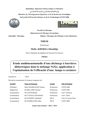 République Algérienne Démocratique et Populaire ﻭﺯﺍﺭﺓ ﺍﻟﺘﻌـــﻠﻴـــﻢ ﺍﻟﻌــﺎﻟـــﻲ ﻭ ﺍﻟﺒــﺤــــﺚ ﺍﻟﻌـــﻠﻤــــﻲ Ministère de l’Enseignement Supérieur et de la Recherche Scientifique Université d'Oran des Sciences et de la Technologie (USTO-MB) Faculté de Physique Département de Physique Energétique Spécialité : Physique Option : Physique des Plasmas et des Matériaux THESE Présenté par Melle. KHODJA Khadidja Pour l’obtention du diplôme de Doctorat Es Science Thème Etude unidimensionnelle d’une décharge à barrières diélectriques dans le mélange NeXe; application à l'optimisation de l'efficacité d'une lampe à excimère Soutenu le : / / 2014 Devant la commission d’examen composée de : Qualité Nom et Prénoms Grade Etb d’Origine U U U U Président Mme HAMDACHE Fatima Professeur USTO-MB Rapporteur Mr BELASRI Ahmed Professeur USTO-MB Examinateur Mr LIANI Bachir Professeur Univ Tlemcen Examinateur Mr YANALLAH Khelifa Professeur Univ Tiaret Examinateur Mr HASSINI Abdelatif MCA Univ Es-senia Oran Examinateur Mr HARRACHE Zahir MCA USTO-MB Année universitaire : 2013 / 2014 République Algérienne Démocratique et Populaire ﻭﺯﺍﺭﺓ ﺍﻟﺘﻌـــﻠﻴـــﻢ ﺍﻟﻌــﺎﻟـــﻲ ﻭ ﺍﻟﺒــﺤــــﺚ ﺍﻟﻌـــﻠﻤــــﻲ Ministère de l’Enseignement Supérieur et de la Recherche Scientifique Université d'Oran des Sciences et de la Technologie (USTO-MB) Faculté de Physique Département de Physique Energétique Spécialité : Physique Option : Physique des Plasmas et des Matériaux THESE Présenté par Melle. KHODJA Khadidja Pour l’obtention du diplôme de Doctorat Es Science Thème Etude unidimensionnelle d’une décharge à barrières diélectriques dans le mélange NeXe; application à l'optimisation de l'efficacité d'une lampe à excimère Soutenu le : / / 2014 Devant la commission d’examen composée de : Qualité Nom et Prénoms Grade Etb d’Origine U U U U Président Mme HAMDACHE Fatima Professeur USTO-MB Rapporteur Mr BELASRI Ahmed Professeur USTO-MB Examinateur Mr LIANI Bachir Professeur Univ Tlemcen Examinateur Mr YANALLAH Khelifa Professeur Univ Tiaret Examinateur Mr HASSINI Abdelatif MCA Univ Es-senia Oran Examinateur Mr HARRACHE Zahir MCA USTO-MB Année universitaire : 2013 / 2014 A mes Très chers parents A ma Sœur A ma famille A mes Ami(e)s Le savant est l'homme par lequel s'opère facilement la distinction entre la franchise et le mensonge dans les paroles, entre la vérité et l'erreur dans les convictions entre la beauté et la laideur dans les actes. "Abd El-Kader ", Artiste, écrivain, Homme politique, Philosophe, Poète, Scientifique, Théologien (1808 - 1883) Col. O'Neill: Oh, here we go. Another scientist General, please. Capt. Carter: Theoretical astrophysicist. Col. O'Neill: Which means? Gen. Hammond: Which means she's smarter than you are, Colonel. Especially in matters related to the Stargate. Stargate SG-1 Saison 1, Episode 1: "Children of gods" (1997) REMERCIEMENTS Mes remerciement vont tout premièrement à dieu tout puissant pour la volonté, la santé et la patience, qu’il ma donné durant toutes ces années d’études. Je remercie mes parents, ma sœur et toute ma famille, pour leur affection inégalable et leur soutien. Sans leurs encouragements, je n’aurai pu mener à bien ce travail. Ce travail a été effectué au sein de Laboratoire Physique des Plasmas, Matériaux Conducteurs et leurs Applications (LPPMCA). Ainsi je dois remercier infiniment mon directeur de thèse le Pr. A. Belasri, pour les précieux conseils, son soutien et son optimisme à tout crin. Mes remerciements lui sont surtout adressés pour son suivi continuel tout le long de la réalisation de cette thèse de doctorat avec la compétence que chacun de nous lui reconnaît. Mes sincères remerciements s’adressent à Madame la présidente du jury : le Pr. F. Hamdache de l'Université d'Oran des Sciences et de la Technologie Mohamed Boudiaf, de m’avoir fait l’honneur de présider le jury. Je tiens également à remercier, le Pr. B. Liani de l'Université de Tlemcen et le Pr. K. Yanallah de l'Université de Tiaret qui ont accepté de juger ce travail, ainsi de leur honorable présence. Je remercie aussi le Dr A. Hassini de l'Université Es-senia Oran et le Dr Z. Harrache de l'Université d'Oran des Science et de la Technologie Mohamed Boudiaf, pour avoir accepté de juger le présent travail et de me faire l’honneur de faire partie du jury. Mes remerciements vont aussi à mes ami(e)s et membres du laboratoire LPPMCA, Amer, Hocine, Soumia, Nadjet, Habiba, Mokhtaria, Barkahom et Fatiha. Un spéciale remerciement dédié à Halima, pour avoir répondu présente quand j'en avais le plus besoin, et à tous ceux que j’ai oublié. République Algérienne Démocratique et Populaire Ministère de l’Enseignement Supérieur et de la Recherche Scientifique Université d’Oran des Sciences et de la Technologie (USTO-MB) Faculté de Physique, Département de Physique Energétique Laboratoire LPPMCA : Physique des plasmas, matériaux Conducteurs et leurs applications. Résumé de thèse de Doctorat en Science de Melle KHODJA Khadidja Intitulé: Etude unidimensionnelle d’une décharge à barrières diélectriques dans le mélange NeXe; application à l'optimisation de l'efficacité d'une lampe à excimère Ce travail est consacré à une étude unidimensionnelle d'une décharge à barrière diélectrique dans le mélange NeXe pour une optimisation de l'efficacité d'une lampe à excimère. Dans ce travail nous nous intéressons plus particulièrement aux propriétés électrique et cinétique de la décharge à barrière diélectrique dans le mélange NeXe. Le xénon est choisi pour son importante luminescence dans la gamme de l'ultraviolet et de l'ultraviolet lointain aux alentours de 172nm avec une énergie de 7,2eV. La lumière 
