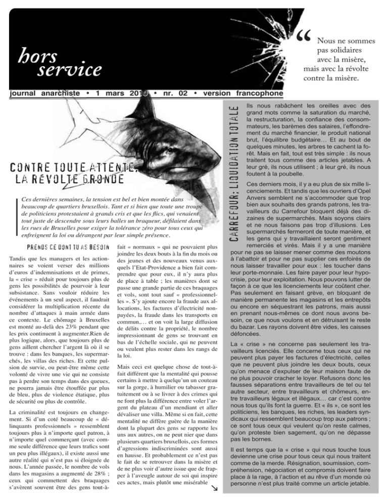 “ Nous ne sommes pas solidaires avec la misère, mais avec la révolte contre la misère. Contre toute attente, la révolte gronde Ces dernières semaines, la tension est bel et bien montée dans beaucoup de quartiers bruxellois. Tant et si bien que toute une troupe de politiciens protestaient à grands cris et que les flics, qui venaient tout juste de descendre sous leurs balles un braqueur, défilaient dans les rues de Bruxelles pour exiger la tolérance zéro pour tous ceux qui enfreignent la loi ou dérangent par leur simple présence. Prends ce dont tu as besoin Tandis que les managers et les actionnaires se voient verser des millions d’euros d’indemnisations et de primes, la « crise » réduit pour toujours plus de gens les possibilités de pourvoir à leur subsistance. Sans vouloir réduire les événements à un seul aspect, il faudrait considérer la multiplication récente du nombre d’attaques à main armée dans ce contexte. Le chômage à Bruxelles est monté au-delà des 23% pendant que les prix continuent à augmenter.Rien de plus logique, alors, que toujours plus de gens aillent chercher l’argent là où il se trouve : dans les banques, les supermarchés, les villas des riches. Et cette pulsion de survie, ou peut-être même cette volonté de vivre une vie qui ne consiste pas à perdre son temps dans des queues, ne pourra jamais être étouffée par plus de bleu, plus de violence étatique, plus de sécurité ou plus de contrôle. La criminalité est toujours en changement. Si d’un coté beaucoup de « délinquants professionnels » ressemblent toujours plus à n’importe quel patron, à n’importe quel commerçant (avec comme seule différence que leurs trafics sont un peu plus illégaux), il existe aussi une autre réalité qui n’est pas si éloignée de nous. L’année passée, le nombre de vols dans les magasins a augmenté de 28% ; ceux qui commettent des braquages s’avèrent souvent être des gens tout-à- fait « normaux » qui ne pouvaient plus joindre les deux bouts à la fin du mois ou des jeunes et des nouveaux venus auxquels l’Etat-Providence a bien fait comprendre que pour eux, il n’y aura plus de place à table ; les manières dont se passe une grande partie de ces braquages et vols, sont tout sauf « professionnelles ». S’y ajoute encore la fraude aux allocations, les factures d’électricité nonpayées, la fraude dans les transports en commun,… et on voit la large diffusion de délits contre la propriété, le nombre impressionnant de gens se trouvant en bas de l’échelle sociale, qui ne peuvent ou veulent plus rester dans les rangs de la loi. Mais ceci est quelque chose de tout-àfait différent que la mentalité qui pousse certains à mettre à quelqu’un un couteau sur la gorge, à humilier ou tabasser gratuitement ou à se livrer à des crimes qui ne font plus la différence entre voler l’argent du plateau d’un mendiant et aller dévaliser une villa. Même si en fait, cette mentalité ne diffère guère de la manière dont la plupart des gens se rapporte les uns aux autres, on ne peut nier que dans plusieurs quartiers bruxellois, ces formes d’agressions indiscriminées sont aussi en hausse. Et probablement ce n’est pas le fait de se retrouver dans la misère et de ne plus voir d’autre issue que de frapper à l’aveugle autour de soi qui inspire ces actes, mais plutôt une misérable m Carrefour; liquidation totale journal anarchiste • 1 mars 2010 • nr. 02 • version francophone Ils nous rabâchent les oreilles avec des grand mots comme la saturation du marché, la restructuration, la confiance des consommateurs, les barèmes des salaires, l’effondrement du marché financier, le produit national brut, l’équilibre budgétaire… Et au bout de quelques minutes, les arbres te cachent la forêt. Mais en fait, tout est très simple : ils nous traitent tous comme des articles jetables. A leur gré, ils nous utilisent ; à leur gré, ils nous foutent à la poubelle. Ces derniers mois, il y a eu plus de six mille licenciements. Et tandis que les ouvriers d’Opel Anvers semblent ne s’accommoder que trop bien aux souhaits des grands patrons, les travailleurs du Carrefour bloquent déjà des dizaines de supermarchés. Mais soyons clairs et ne nous faisons pas trop d’illusions. Les supermarchés fermeront de toute manière, et les gens qui y travaillaient seront gentiment remerciés et virés. Mais il y a une manière pour ne pas se laisser mener comme des moutons à l’abattoir et pour ne pas supplier ces enfoirés de nous laisser travailler pour eux : les toucher dans leur porte-monnaie. Les faire payer pour leur hypocrisie, pour leur exploitation. Nous pouvons lutter de façon à ce que les licenciements leur coûtent cher. Pas seulement en faisant grève, en bloquant de manière permanente les magasins et les entrepôts ou encore en séquestrant les patrons, mais aussi en prenant nous-mêmes ce dont nous avons besoin, ce que nous voulons et en détruisant le reste du bazar. Les rayons doivent être vides, les caisses défoncées. La « crise » ne concerne pas seulement les travailleurs licenciés. Elle concerne tous ceux qui ne peuvent plus payer les factures d’électricité, celles que ne peuvent plus joindre les deux bouts, ceux qu’on menace d’expulser de leur maison faute de ne plus pouvoir cracher le loyer. Refusons donc les fausses séparations entre travailleurs de tel ou tel autre secteur, entre travailleurs et chômeurs, entre travailleurs légaux et illégaux… car c’est contre nous tous qu’ils font la guerre. Et « ils », ce sont les politiciens, les banques, les riches, les leaders syndicaux qui ressemblent beaucoup trop aux patrons ; ce sont tous ceux qui veulent qu’on reste calmes, qu’on proteste bien sagement, qu’on ne dépasse pas les bornes. Il est temps que la « crise » qui nous touche tous devienne une crise pour tous ceux qui nous traitent comme de la merde. Rés