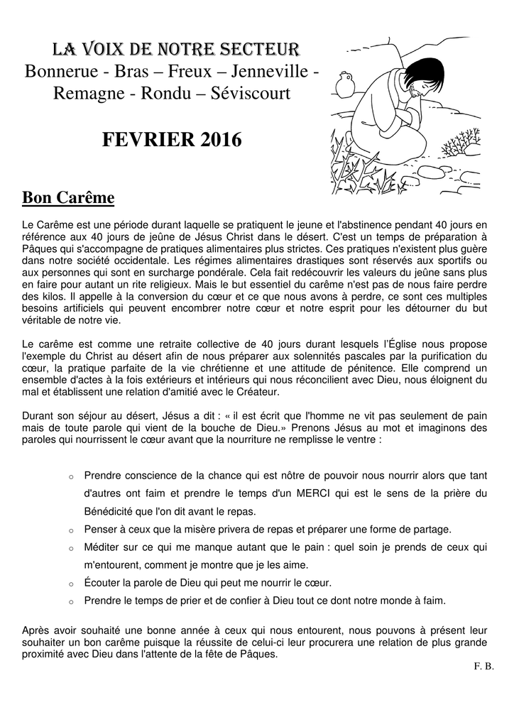 LA VOIX DE NOTRE SECTEUR Bonnerue - Bras – Freux – Jenneville Remagne - Rondu – Séviscourt FEVRIER 2016 Bon Carême Le Carême est une période durant laquelle se pratiquent le jeune et l'abstinence pendant 40 jours en référence aux 40 jours de jeûne de Jésus Christ dans le désert. C'est un temps de préparation à Pâques qui s'accompagne de pratiques alimentaires plus strictes. Ces pratiques n'existent plus guère dans notre société occidentale. Les régimes alimentaires drastiques sont réservés aux sportifs ou aux personnes qui sont en surcharge pondérale. Cela fait redécouvrir les valeurs du jeûne sans plus en faire pour autant un rite religieux. Mais le but essentiel du carême n'est pas de nous faire perdre des kilos. Il appelle à la conversion du cœur et ce que nous avons à perdre, ce sont ces multiples besoins artificiels qui peuvent encombrer notre cœur et notre esprit pour les détourner du but véritable de notre vie. Le carême est comme une retraite collective de 40 jours durant lesquels l’Église nous propose l'exemple du Christ au désert afin de nous préparer aux solennités pascales par la purification du cœur, la pratique parfaite de la vie chrétienne et une attitude de pénitence. Elle comprend un ensemble d'actes à la fois extérieurs et intérieurs qui nous réconcilient avec Dieu, nous éloignent du mal et établissent une relation d'amitié avec le Créateur. Durant son séjour au désert, Jésus a dit : « il est écrit que l'homme ne vit pas seulement de pain mais de toute parole qui vient de la bouche de Dieu.» Prenons Jésus au mot et imaginons des paroles qui nourrissent le cœur avant que la nourriture ne remplisse le ventre : o Prendre conscience de la chance qui est nôtre de pouvoir nous nourrir alors que tant d'autres ont faim et prendre le temps d'un MERCI qui est le sens de la prière du Bénédicité que l'on dit avant le repas. o Penser à ceux que la misère privera de repas et préparer une forme de partage. o Méditer sur ce qui me manque autant que le pain : quel soin je prends de ceux qui m'entourent, comment je montre que je les aime. o Écouter la parole de Dieu qui peut me nourrir le cœur. o Prendre le temps de prier et de confier à Dieu tout ce dont notre monde à faim. Après avoir souhaité une bonne année à ceux qui nous entourent, nous pouvons à présent leur souhaiter un bon carême puisque la réussite de celui-ci leur procurera une relation de plus grande proximité avec Dieu dans l'attente de la fête de Pâques. F. B. Samedi 06 février : Saint Paul Miki et ses compagnons, martyrs Freux : 18H00 : Messe pour Marc Sholtès (de la part de ses amis) ; pour Jean Legrand et les défunts de la famille Legrand-Fify ; pour Joseph Lambert Bras : 19H15 : Messe des familles : Présentation des enfants qui se préparent à la première Communion (suivie d’un partage « crêpes » : pour Adrien Louis et Aurélie Godenir Dimanche 07 février : 5ème dimanche du Temps Ordinaire : Remagne : 9H30 : Messe anniversaire Robert Hansen ; pour Hubert Strépenne ; pour Jean Van Biesen ; pour Amand et Gisèle Van Lierde ; pour les défunts Marchand-Strépenne Séviscourt : 10H45 : Messe anniversaire pour Augusta Thiry et Lucie Thiry Mercredi 10 février : Mercredi des cendres (entrée en carême) (journée de jeûne et de prière) MESSE EN SECTEUR : Freux : 18H30 : Messe pour Léonard-Branle (m.f.) Jeudi 11 février : Fête de Notre-Dame de Lourdes : Freux : 18H00 : Messe pour Victor Adam (m.f.) Vendredi 12 février : Séviscourt : 18H00 : Messe pour Joséphine Parent (m.f.) Samedi 13 février : Freux : 18H00 : Messe pour les parents défunts de la famille Guebs-Hamtiaux Bras : 19H15 : Messe anniversaire pour Louis François ; pour Yves Philippin et parents défunts de la famille Dimanche 14 février : 1er dimanche de Carême Rondu : 09H30 : Messe pour les défunts de la paroisse (m.f.) Jenneville : 10H45 : Messe 1er anniversaire Oscar Allard ; pour Emile Jacquemin et Marie Lambert Mercredi 17 février : Les sept saints fondateurs des Servites Bras : 18H00 : Messe pour Hubert Godenir et Hélène Charlier (m.f.) Jeudi 18 février : Sainte Bernadette Soubirous, vierge : Freux : 18H00 : Messe pour Branle-Martin (m.f.) Vendredi 19 février : Séviscourt : 18H00 : Messe pour les époux Noël-Giot (m.f.) « Comme les Mages, comme les Mages, de tout notre cœur, de toute notre foi. Comme les Mages, comme les Mages, Seigneur, nous marchons vers Toi ! » (chant communion messe de la Sainte famille 27/12/15) Samedi 20 février : Freux : 18H00 : Messe pour Marie Devahif (m.f.) Bras : 19H15 : Messe pour Jean-Benoît Macaux ; pour les défunts de la famille Lemaire-Louis ; aux intentions de la petite chapelle N.D. de Lourdes (Bras-Bas) Dimanche 21février : 2ème dimanche de Carême : Remagne : 9H30 : Messe pour Hubert Strépenne ; pour Blanche Simon ; pour Willy Van Lierde ; pour les défunts Poncelet-Strépenne ; pour les défunts Marchand-Marchal Séviscourt : 10H45 : Messe anniversaire Elisa Cornet, Armand Lamy et son épouse Maria Schmitz, André Léonard Mercredi 24 février : Bras : 18H00 : Messe pour Justin Seinlet-Thiry (m.f.) Jeudi 25 février : Freux : 18H00 : Messe pour Léa Lafontaine (m.f.) Vendredi 26 février : Séviscourt : 18H00 : Messe pour Justin Seinlet-Thiry (m.f.) Samedi 27 février : Freux : 18H00 : Messe pour les défunts Lambert-Lambert et Noël-Devillé ; pour la famille de Fierland-Dormer Bras : 19H15 : Messe pour Jean-Baptiste Toussaint ; pour Arolde François Dimanche 28 février : 3ème dimanche de Carême : Rondu : 9H30 : Messe pour les défunts de la paroisse (m.f.) Jenneville : 10H45 : Messe anniversaire pour Léon Dublet et famille Gatellier-Dublet ; pour Jean Ansaux (m.f.) Du 03 au 11 février - VESQUEVILLE NEUVAINE à NOTRE-DAME DE LOURDES 17H40 : Chapelet – 18H00 : Messe Année de la Miséricorde (08 décembre 2015 – 20 novembre 2016) Neuvaine de la Miséricorde à Séviscourt (à partir du Ven