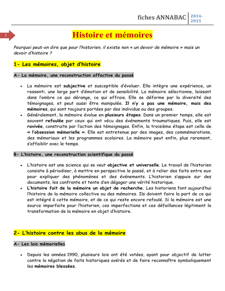 fiches ANNABAC 20142015 Histoire et mémoires 1 Pourquoi peut-on dire que pour l’historien, il existe non « un devoir de mémoire » mais un devoir d’histoire ? 1- Les mémoires, objet d’histoire A- La mémoire, une reconstruction affective du passé La mémoire est subjective et susceptible d’évoluer. Elle intègre une expérience, un ressenti, une large part d’émotion et de sensibilité. La mémoire sélectionne, laissant dans l’ombre ce qui dérange, ce qui effraie. Elle se déforme par la diversité des témoignages, et peut aussi être manipulée. Il n’y a pas une mémoire, mais des mémoires, qui sont toujours portées par des individus ou des groupes. Généralement, la mémoire évolue en plusieurs étapes. Dans un premier temps, elle est souvent refoulée par ceux qui ont vécu des événements traumatiques. Puis, elle est ravivée, construite par l’action des témoignages. Enfin, la troisième étape est celle de « l’obsession mémorielle ». Elle est entretenue par des images, des commémorations, des mémoriaux et les programmes scolaires. La mémoire peut enfin, plus rarement, s’affaiblir avec le temps. B- L’histoire, une reconstruction scientifique du passé L’histoire est une science qui se veut objective et universelle. Le travail de l’historien consiste à périodiser, à mettre en perspective le passé, et à relier des faits entre eux pour expliquer des phénomènes et des événements. L’historien s’appuie sur des documents, les confronte et tente d’en dégager une vérité historique. L’histoire fait de la mémoire un objet de recherche. Les historiens font aujourd’hui l’histoire de la mémoire collective ou des mémoires. Ils doivent faire la part de ce qui est intégré à cette mémoire, et de ce qui reste encore refoulé. Si la mémoire est une source imparfaite pour l’historien, ces imperfections et ces défaillances légitiment la transformation de la mémoire en objet d’histoire. 2- L’histoire contre les abus de la mémoire A- Les lois mémorielles Depuis les années 1990, plusieurs lois ont été votées, ayant pour objectif de lutter contre la négation de faits historiques avérés et de faire reconnaître symboliquement les mémoires blessées. fiches ANNABAC 2 20142015 Ainsi, la loi Gayssot du 13 juillet 1990 condamne le négationnisme, c’est-à-dire la négation de l’existence du génocide des Juifs par l’Allemagne nazie. En 2001, deux lois défendent la mémoire du génocide arménien de 1915 et reconnaissent la traite négrière et l’esclavage comme étant des crimes contre l’humanité. Enfin, les souffrances et les sacrifices endurés par les rapatriés à la suite de la décolonisation sont reconnus en février 2005. Les programmes scolaires évoluent sous cette pression législative. Ils doivent faire une place aux « aspects positifs de la colonisation » et au rôle joué par les harkis dans la guerre d’Algérie. B- Les historiens contre l’obsession mémorielle En 2005, dix-neuf historiens dénoncent ce qu’ils considèrent comme l’aboutissement de revendications catégorielles ou communautaristes. Selon eux, les mémoires de la Shoah, de la France de Vichy et de la guerre d’Algérie sont à étudier parce que ce sont des mémoires de crises nationales, et non parce que les sociétés et les politiques revendiquent ce devoir. Il n’existe pas pour les historiens de « devoir de mémoire » mais bien un « devoir d’histoire ». Ils parviennent à faire abolir la mention sur les « aspects positifs de la présence française outre-mer » en 2006. Donner la parole aux témoins d’un événement, c’est solliciter leurs mémoires et les considérer comme une source pour faire l’histoire. Mais la mémoire, prise globalement, avec ses vérités et ses mensonges, ses lumières et ses ombres, devient pour l’historien un objet d’étude à part entière. fiches ANNABAC 20142015 Les mémoires de la Seconde Guerre mondiale en France 3 Comment évoluent les mémoires de la Seconde Guerre mondiale en France depuis 1945 ? 1- Une mémoire officielle dans l’après-guerre A- Reconstruire l’unité nationale… Dès la Libération, le général de Gaulle laisse croire qu’une majorité de Français a résisté à l’occupant allemand. Il minimise le soutien au régime de Vichy et crée le « mythe résistancialiste », vision également véhiculée par le PCF. Les associations juives ne souhaitent pas alors se singulariser. Les rescapés des camps d’extermination, peu nombreux, sont difficilement entendus par la société. B- … passe par l’oubli des responsabilités de Vichy La collaboration est peu condamnée par l’État. Une loi de 1947 amnistie plus de 30 000 collaborateurs et ouvre une période de « refoulement » de la mémoire. Jusqu’aux années 1970, la thèse du « glaive et du bouclier » reste l’histoire officielle : De Gaulle aurait été l’épée de la France tandis que Pétain aurait accepté l’armistice et la collaboration pour atténuer les souffrances du pays. Une mémoire historique se met en place. C- … et la construction d’un objet de mémoire : le résistant Le retour du Général De Gaulle au pouvoir en 1958 marque l’apogée des mémoires de la résistance : les cendres de Jean Moulin, héros national, sont transférées au Panthéon en 1964. La mémoire du génocide des Juifs est alors englobée dans celle de la déportation en général, comme en témoigne le documentaire Nuit et Brouillard de 1956. 2- Le réveil des mémoires dans les années 60-70 A- L’affirmation de la mémoire juive… En 1961 se tient le procès d’Eichmann, responsable nazi. Dans le contexte des guerres israélo-arabes, la mémoire de la Shoah devient un élément déterminant de l’identité juive. En 1979, Robert Faurisson prétend que le génocide n’est qu’un « mensonge historique ». Des historiens se mobilisent contre ce courant négationniste. fiches A