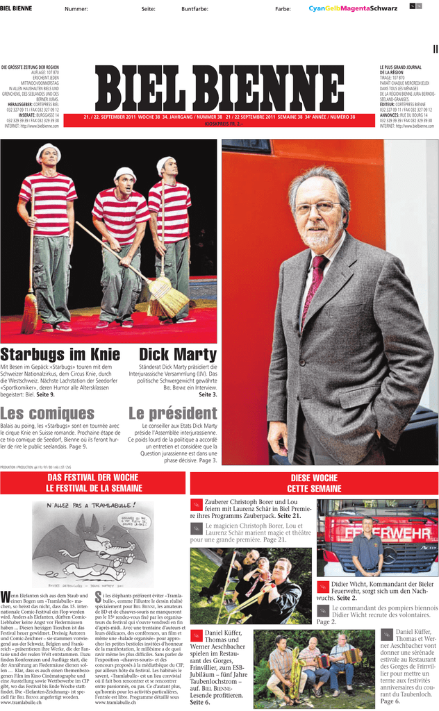 BIEL BIENNE Nummer: Seite: Buntfarbe: Farbe: CyanGelbMagentaSchwarz nn ll DIE GRÖSSTE ZEITUNG DER REGION AUFLAGE: 107 870 ERSCHEINT JEDEN MITTWOCH/DONNERSTAG IN ALLEN HAUSHALTEN BIELS UND GRENCHENS, DES SEELANDES UND DES BERNER JURAS. HERAUSGEBER: CORTEPRESS BIEL 032 327 09 11 / FAX 032 327 09 12 INSERATE: BURGGASSE 14 032 329 39 39 / FAX 032 329 39 38 INTERNET: http://www.bielbienne.com 21. / 22. SEPTEMBER 2011 WOCHE 38 34. JAHRGANG / NUMMER 38 21 / 22 SEPTEMBRE 2011 SEMAINE 38 34e ANNÉE / NUMÉRO 38 KIOSKPREIS FR. 2.– Starbugs im Knie LE PLUS GRAND JOURNAL DE LA RÉGION TIRAGE: 107 870 PARAÎT CHAQUE MERCREDI/JEUDI DANS TOUS LES MÉNAGES DE LA RÉGION BIENNE-JURA BERNOISSEELAND-GRANGES. ÉDITEUR: CORTEPRESS BIENNE 032 327 09 11 / FAX 032 327 09 12 ANNONCES: RUE DU BOURG 14 032 329 39 39 / FAX 032 329 39 38 INTERNET: http://www.bielbienne.com Dick Marty Mit Besen im Gepäck:«Starbugs» touren mit dem Schweizer Nationalzirkus, dem Circus Knie, durch die Westschweiz. Nächste Lachstation der Seedorfer «Sportkomiker», deren Humor alle Altersklassen begeistert: Biel. Seite 9. Ständerat Dick Marty präsidiert die Interjurassische Versammlung (IJV). Das politische Schwergewicht gewährte BIEL BIENNE ein Interview. Seite 3. Les comiques Le président Balais au poing, les «Starbugs» sont en tournée avec le cirque Knie en Suisse romande. Prochaine étape de ce trio comique de Seedorf, Bienne où ils feront hurler de rire le public seelandais. Page 9. Le conseiller aux Etats Dick Marty préside l’Assemblée interjurassienne. Ce poids lourd de la politique a accordé un entretien et considère que la Question jurassienne est dans une phase décisive. Page 3. PRODUKTION / PRODUCTION: ajé / RJ / RF / BD / mlö / JST / ZVG DAS FESTIVAL DER WOCHE LE FESTIVAL DE LA SEMAINE DIESE WOCHE CETTE SEMAINE n n Zauberer Christoph Borer und Lou feiern mit Laurenz Schär in Biel Premiere ihres Programms Zauberpack. Seite 21. Le magicien Christoph Borer, Lou et Laurenz Schär marient magie et théâtre pour une grande première. Page 21. W enn Elefanten sich aus dem Staub und einen Bogen um «Tramlabulle» machen, so heisst das nicht, dass das 15. internationale Comic-Festival ein Flop werden wird. Anders als Elefanten, dürften ComicLiebhaber keine Angst vor Fledermäusen haben ... Diesen herzigen Tierchen ist das Festival heuer gewidmet. Dreissig Autoren und Comic-Zeichner – sie stammen vorwiegend aus der Schweiz, Belgien und Frankreich – präsentieren ihre Werke, die der Fantasie und der realen Welt entstammen. Dazu finden Konferenzen und Ausflüge statt, die der Annährung an Fledermäuse dienen sollen … Klar, dass es auch einen themenbezogenen Film im Kino Cinématographe und eine Ausstellung sowie Wettbewerbe im CIP gibt, wo das Festival bis Ende Woche stattfindet. Die «Elefanten-Zeichnung» ist speziell für BIEL BIENNE angefertigt worden. www.tramlabulle.ch n n Didier Wicht, Kommandant der Bieler Feuerwehr, sorgt sich um den Nachwuchs. Seite 2. S i les éléphants préfèrent éviter «Tramlabulle», comme l’illustre le dessin réalisé spécialement pour BIEL BIENNE, les amateurs de BD et de chauves-souris ne manqueront pas le 15e rendez-vous fixé par les organisateurs du festival qui s’ouvre vendredi en fin d’après-midi. Avec une trentaine d’auteurs et leurs dédicaces, des conférences, un film et même une «balade organisée» pour approcher les petites bestioles invitées d’honneur de la manifestation, le millésime a de quoi ravir même les plus difficiles. Sans parler de l’exposition «chauves-souris» et des concours proposés à la médiathèque du CIP, par ailleurs hôte du festival. Les habitués le savent, «Tramlabulle» est un lieu convivial où il fait bon rencontrer et se rencontrer entre passionnés, ou pas. Ce d’autant plus, qu’hormis pour les activités particulières, l’entrée est libre. Programme détaillé sous www.tramlabulle.ch Le commandant des pompiers biennois Didier Wicht recrute des volontaires. Page 2. n Daniel Küffer, Thomas und Werner Aeschbacher spielen im Restaurant des Gorges, Frinvillier, zum ESBJubiläum – fünf Jahre Taubenlochstrom – auf. BIEL BIENNELesende profitieren. Seite 6. n Daniel Küffer, Thomas et Werner Aeschbacher vont donner une sérénade estivale au Restaurant des Gorges de Frinvillier pour mettre un terme aux festivités anniversaires du courant du Taubenloch. Page 6. BIEL BIENNE 2 Nummer: Seite: Buntfarbe: FEUERWEHR Ran an die Leiter «Es ist das erste Mal, dass wir für einen Informationsabend Werbung betreiben. Wir haben festgestellt, dass vielen Leuten gar nicht bewusst ist, dass es in Biel neben dem professionellen Korps auch freiwillige Feuerwehrleute gibt», erklärt Kommandant Didier Wicht. Pikett. In Biel kommen auf 28 Berufsfeuerwehrleute 108 Freiwillige. Letztere können entweder in den Pikettdienst oder in den Löschzug integriert werden. Die Männer und Frauen vom Pikett absolvieren eine Ausbildung, die jener der Profis kaum nachsteht. Jede dritte Woche müssen sie auf Abruf bereit sein. Der Löschzug absolviert sechs bis acht Übungen pro Jahr, dazu kommen die Fronteinsätze, «wesentlich mehr als in einem kleinen Dorf». «Unser Personalbestand ist stabil», bekundet Wicht. «Wir stellen indes fest, dass sich der Lebensstil verändert hat. Die Leute wohnen immer weiter vom Arbeitsplatz entfernt, oft müssen sie wegen der Arbeit ihren Wohnort wechseln. Daher bleiben sie heute weniger lange bei der Feuerwehr.» Dieselbe Feststellung machen auch die Kollegen im Seeland und im Berner Jura. «Es wird immer schwieriger, Leute zu finden, die tagsüber verfügbar sind. Sei es, weil sie auswärts arbeiten, sei es weil die Arbeitgeber nicht mitma- end: tions-Ab Informa 6. September 2 Montag, im Feuerwehrr h U hof19.30 Biel, Werk in z a g a m strasse 8 Sucht heisse Kandidaten für die Feuerwehr: Didier Wicht. chen,» bemerkt Claude Etienne, Kommandant der Feuerwehr von Tramelan. Ähnlich tönt es im Se