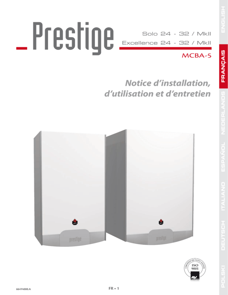MCBA-5 664Y4000.A FR • 1 English POLSKI deutsch ITALIANO español Notice d’installation, d’utilisation et d’entretien FRANÇAIS Excellence 24 - 32 / MkII NEDERLANDS Prestige Solo 24 - 32 / MkII English FRANÇAIS NEDERLANDS español ITALIANO deutsch INDEX Avertissements 3 Introduction 4 Guide de l’utilisateur 6 Caractéristiques techniques 7 Destinataires de cette notice Symboles Recommandations Certification Avertissements 3 3 3 3 3 Description du cahier des charges Protection antigel 4 4 Mode d’emploi Réglage des paramètres 6 6 Versions gaz naturel Versions gaz propane Prestation eau chaude sanitaire Catégories de gaz Graphiques des pertes de charges 7 8 8 9 10 Raccordement électrique 11 Consignes d’installation 12 Installation 14 Mise en service et Entretien 26 Paramètres mcba pour le spécialiste 28 Codes de blocages et d'erreurs du MCBA 38 Schéma électrique 11 Dimensions Local d’installation Fixation au mur de la chaudière Entraxes des raccordements hydrauliques 12 12 12 13 Raccordement à la cheminée Raccordement sanitaire : Prestige Excellence Raccordement sanitaire : Prestige Solo Raccordement chauffage central Raccordement gaz Installation d’un circuit chauffage simple avec régulation par thermostat d’ambiance ACV 15 Installation d’un circuit chauffage simple avec régulation par Room Unit Installation de deux circuits chauffage avec régulation par thermostat d’ambiance ACV 15 et module AM3-11 Installation de deux circuits chauffage avec régulation par thermostat Room Unit et module ZMC-1 Installation sans priorité sanitaire pour une Prestige excellence ou Prestige Solo + ballon préparateur d'eau chaude Mise en service de l’installation Entretien de la chaudière Résistance des sondes de température Démontage brûleur Démontage et contrôle de l’électrode Démontage de l’échangeur Nettoyage de l’échangeur 26 26 26 27 27 27 27 Mode Stand-by Réglages des paramètres Informations sur l’installation Saisie du code Réglage des paramètres : accessibles uniquement via le code Mode de communication Mode Erreur 28 29 30 31 32 37 37 POLSKI Liste des codes d’erreur + solutions Pièces détachées 664Y4000.A 14 15 16 17 17 18 19 20 22 24 38 à la fin de la notice FR • 2 • Règle particulière en Belgique: Le réglage du CO2, du débit de gaz, du débit d'air et l'apport air/gaz sont ajustés d'usine et ne peuvent pas être modifié en Belgique. Cette notice s’adresse: - à l’ingénieur chargé de la prescription - à l’utilisateur - à l’installateur - au technicien en charge de l’entretien • Avant toute intervention sur la chaudière, il est primordial de couper l’alimentation électrique depuis le coffret externe. Symboles Les symboles suivants sont utilisés dans le présent manuel: • L’utilisateur n’a pas à accéder aux composants internes de la chaudière et du tableau de commande. Instruction essentielle pour un fonctionnement correct de l’installation. Certification Les appareils sont porteurs de la marque “CE” conformément aux normes en vigueur dans les différents pays [Directives Européennes 92/42/CEE “Rendement”, 90/396/CEE “Appareils à gaz”]. Ces appareils portent également le label belge de qualité “HR-TOP” [chaudière à condensation au gaz]. Avertissements En cas de perception d’une odeur de gaz: • Lisez d’abord le présent manuel avec attention avant d’installer et de mettre en service la chaudière. - - - - • Il est interdit d’apporter toute modification à l’intérieur de l’appareil sans l’accord préalable écrit du fabricant. Cette notice fait partie des éléments livrés avec l’appareil et doit être remise à l’utilisateur qui la conservera avec soin! • L’installation doit être réalisée par un technicien qualifié et conforme avec les normes et codes locaux en vigueur. L’installation, la mise en service, l’entretien et la réparation de l’installation doivent être effectués par un installateur agréé, en conformité avec les normes en vigueur. • Le manque d’observation des instructions relatives aux opérations et procédures de contrôle peut entraîner des blessures aux personnes ou des risques de pollution de l’environnement. Le constructeur décline toute responsabilité pour tous dégâts consécutifs à une erreur d’installation ou en cas d’utilisation d’appareils ou accessoires qui ne sont pas spécifiés par le constructeur. • Afin de garantir un fonctionnement correct et sûr de l’appareil, il est important de le faire réviser et entretenir chaque année par un installateur ou une entreprise de maintenance agréée. Le constructeur se réserve le droit de modifier les caractéristiques techniques et les équipements de ses produits sans notification préalable. • En cas d’anomalie, veuillez contacter votre installateur. • Malgré les normes de qualité strictes qu’impose ACV à ses appareils pendant la production, le contrôle et le transport, il est possible que des pannes surviennent. Veuillez signaler ces pannes immédiatement à votre installateur agréé. N’oubliez pas de mentionner le code de la panne tel qu’il apparaît à l’écran. Le disponibilité de certains modèles ainsi que leurs accessoires peuvent varier selon les marchés. • Les pièces défectueuses ne peuvent être remplacées que par des pièces d’usine originales. Vous trouverez une liste des pièces détachées et de leur numéro de référence ACV à la fin de ce document. 664Y4000.A Fermer immédiatement l’arrivée de gaz. Aérer la pièce (Ouvrir les fenêtres) Ne pas utiliser d’appareils électriques et ne pas actionner d’interrupteurs. Prévenir immédiatement votre compagnie du gaz et/ou votre installateur. FR • 3 ITALIANO Recommandations deutsch Danger de brûlure. POLSKI Danger d’électrocution, faire appel à un technicien qualifié español NEDERLANDS Instruction essentielle pour la sécurit