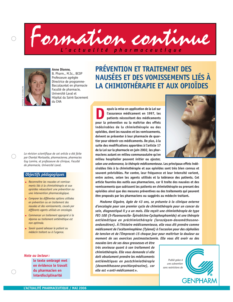 PHOTOS : D. DU SABLON Anne Dionne, B. Pharm., M.Sc., BCOP Professeure agrégée Directrice de programmeBaccalauréat en pharmacie Faculté de pharmacie, Université Laval et Hôpital du Saint-Sacrement du CHA PRÉVENTION ET TRAITEMENT DES NAUSÉES ET DES VOMISSEMENTS LIÉS À LA CHIMIOTHÉRAPIE ET AUX OPIOÏDES epuis la mise en application de la Loi sur l’assurance médicament en 1997, les patients nécessitant des médicaments pour la prévention ou la maîtrise des effets indésirables de la chimiothérapie ou des opioïdes, dont les nausées et les vomissements, doivent se présenter à leur pharmacie de quartier pour obtenir ces médicaments. De plus, à la suite des modifications apportées à l’article 17 de la Loi sur la pharmacie en juin 2002, les pharmaciens autant en milieu communautaire qu’en milieu hospitalier peuvent initier ou ajuster, selon une ordonnance, la thérapie médicamenteuse. Les principaux effets indésirables liés à la chimiothérapie et aux opioïdes sont très bien connus et souvent prévisibles. Par contre, leur fréquence et leur intensité varient, entre autres, selon les agents utilisés et la tolérance des patients. Cet article fournira des outils aux pharmaciens, car il traite des nausées et des vomissements que subissent les patients en chimiothérapie ou prenant des opioïdes ainsi que des mesures préventives ou des traitements qui peuvent être proposés par les pharmaciens ou suggérés au médecin traitant. D La révision scientifique de cet article a été faite par Chantal Morissette, pharmacienne, pharmacies Guy Lemire, et professeure de clinique, Faculté de pharmacie, Université Laval. Objectifs pédagogiques ■ Reconnaître les nausées et vomissements liés à la chimiothérapie et aux opioïdes nécessitant une prévention ou une intervention pharmacologique. ■ Comparer les différentes options utilisées en prévention ou en traitement des nausées et des vomissements, causés par différents agents utilisés en oncologie. ■ Commencer un traitement approprié si la réponse au traitement antiémétique est non optimale. ■ Savoir quand adresser le patient au médecin traitant ou à l’urgence. Note au lecteur : le texte ombragé met en évidence le travail du pharmacien en interdisciplinarité L’ACTUALITÉ PHARMACEUTIQUE / MAI 2006 1 Madame Giguère, âgée de 43 ans, se présente à la clinique externe d’oncologie pour son premier cycle de chimiothérapie pour un cancer du sein, diagnostiqué il y a un mois. Elle reçoit une chimiothérapie de type FEC-100 (5-Fluorouracile- Épirubicine-Cyclophosphamide) et une thérapie antiémétique en préchimiothérapie (lorazépam-dexaméthasoneondansétron). À l’histoire médicamenteuse, elle vous dit prendre comme médicament de l’acétaminophène (Tylenol) à l’occasion pour des céphalées de tension et de l’Empracet-15 chaque jour pour maîtriser la douleur au moment de ses exercices postmastectomie. Elle vous dit avoir eu des nausées lors de ses deux grossesses et être très anxieuse quant à son traitement de chimiothérapie. Elle vous demande si elle doit absolument prendre les médicaments Publié grâce à antiémétiques en postchimiothérapie une subvention (dexaméthasone-prochlorpérazine), car sans restrictions de elle est « anti-médicament ». Facteurs de risque Encore en 2005, on estime qu’environ 10 % à 40 % des patients présenteront des nausées ou des vomissements à la suite d’un traitement de chimiothérapie et ce, malgré la prise d’antiémétiques 13 . L’incidence, la gravité et la durée de l’émèse varient selon différents facteurs liés à la chimiothérapie administrée, comme le type d’antinéoplasique, la dose, le mode d’administration, l’expérience antérieure avec la chimiothérapie, le potentiel émétique et l’association ou non d’agents antinéoplasiques 1-3. Les agents antinéoplasiques sont classés en cinq groupes selon leur potentiel émétique, allant de hautement à faiblement émétisant. Par exemple, lors de l’administration d’agents ayant un potentiel émétique élevé, comme le cisplatine, le carboplatine ou l’association de la cyclophosphamide avec une anthracycline (épirubicine, doxorubicine), on estime que 60 % à 90 % des patients peuvent expérimenter de l’émèse en l’absence d’une prophylaxie antiémétique efficace 1-5. Différents facteurs liés au patient, tels que l’âge inférieur à 50 ans, le fait d’être une femme, les antécédents de nausées ou vomissements lors de la grossesse, le mal des transports, l’anxiété et les troubles d’adaptation, augmenteraient le risque de présenter des nausées et des vomissements après une chimiothérapie 1,2. De plus, la localisation de la tumeur, la présence de certains types de métastases, l’association de la radiothérapie et de la chimiothérapie, un débalancement électrolytique (hypercalcémie, hyperglycémie, hyponatrémie) et la prise de médicaments concomitants (comme les opioïdes) peuvent également expliquer la survenance ou l’augmentation de l’intensité des nausées et des vomissements postchimiothérapie 2. On rapporte que les nausées et les vomissements apparaissent chez environ un tiers à deux tiers des personnes recevant un opioïde 6. Un soulagement non optimal est susceptible d’entraîner des complications telles que l’anorexie, la déshydratation, la malnutrition, les débalancements électrolytiques et la fatigue. Ces complications peuvent engendrer des délais dans l’administration de la chimiothérapie et même, dans certains cas, un refus du patient à poursuivre des traitements ayant une visée curative 1,2. 2 Madame Giguère présente plusieurs facteurs de risque d’avoir des nausées et des vomissements liés à la chimiothérapie : elle reçoit un protocole de chimiothérapie à potentiel émétique élevé (association cyclophosphamideépirubicine), elle a des antécéden