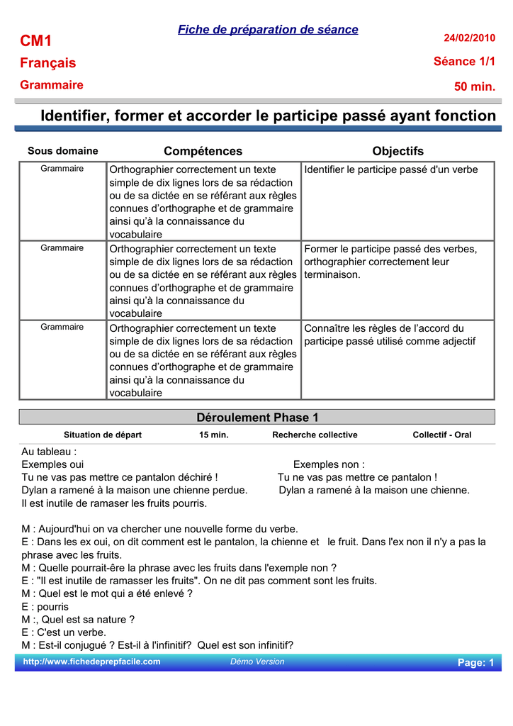 Fiche de préparation de séance CM1 24/02/2010 Séance 1/1 Français Grammaire 50 min. Identifier, former et accorder le participe passé ayant fonction Sous domaine Compétences Grammaire Orthographier correctement un texte simple de dix lignes lors de sa rédaction ou de sa dictée en se référant aux règles connues d’orthographe et de grammaire ainsi qu’à la connaissance du vocabulaire Orthographier correctement un texte simple de dix lignes lors de sa rédaction ou de sa dictée en se référant aux règles connues d’orthographe et de grammaire ainsi qu’à la connaissance du vocabulaire Orthographier correctement un texte simple de dix lignes lors de sa rédaction ou de sa dictée en se référant aux règles connues d’orthographe et de grammaire ainsi qu’à la connaissance du vocabulaire Grammaire Grammaire Objectifs Identifier le participe passé d'un verbe Former le participe passé des verbes, orthographier correctement leur terminaison. Connaître les règles de l’accord du participe passé utilisé comme adjectif Déroulement Phase 1 Situation de départ 15 min. Recherche collective Au tableau : Exemples oui Tu ne vas pas mettre ce pantalon déchiré ! Dylan a ramené à la maison une chienne perdue. Il est inutile de ramaser les fruits pourris. Collectif - Oral Exemples non : Tu ne vas pas mettre ce pantalon ! Dylan a ramené à la maison une chienne. M : Aujourd'hui on va chercher une nouvelle forme du verbe. E : Dans les ex oui, on dit comment est le pantalon, la chienne et le fruit. Dans l'ex non il n'y a pas la phrase avec les fruits. M : Quelle pourrait-êre la phrase avec les fruits dans l'exemple non ? E : "Il est inutile de ramasser les fruits". On ne dit pas comment sont les fruits. M : Quel est le mot qui a été enlevé ? E : pourris M :, Quel est sa nature ? E : C'est un verbe. M : Est-il conjugué ? Est-il à l'infinitif? Quel est son infinitif? http://www.fichedeprepfacile.com Démo Version Page: 1 E : C'est le verbe pourrir. Là il n'est pas conjugué. M : A quoi sert ce mot dans cette phrase ? E : A dire comment est le fruit. M : oui pourri dit comment est le fruit. Quel est la nature du mot fruit? E : Un nom commun. M : Comment appelle-t-on un un mot qui qualifie un nom? E : Un adjectif M : Et pourtant nous avons vu que pourri est une forme du verbe pourrir. Est-ce que pourri peut être un adjectif ? E : non, c'est le participe passé du verbe pourrir. Mais il s'utilise comme un adjectif. Il s'accorde comme un adjectif avec le nom qu'il qualifie : déchiré avec pantalon et perdue avec chienne. Déroulement phase 2 Validation des hypothèses 5 min. Recherche collective Collectif - Oral Au tableau Nous ne partirons pas sur ce chemin gelé. Nous ne partirons pas sur cette route gelée. Nous ne partirons pas sur ces routes gelées. M : Y a-t-il des participe passé dans ces phrases? E : gelé est le participe passé du verbe geler. Dans la première phrase il est au masculin singulier, dans la seconde au féminin singulier et dans la troisième au féminin pluriel. L'enseignant trace les balles d'accord au fur et à mesure au tableau. Puis l'E écrit au tableau le début de la phrase : Nous ne partirons pas sur ces chemins ....... et demande comment on doit écrire le mot gelé. Déroulement Phase 3 Phase de recherche 10 min. Recherche collective Collectif - Ecrit Maintenant nous allons chercher comment on trouve le participe passé d'un verbe. M : Quel est le participe passé du verbe prendre. E : pris. M : Peux-tu expliquer aux autres comment tu as fait pour trouver. E : J'ai placé devant le verbe il a ..... ou il a été ......... M Oui on peut dire il a pris ou il a été pris. M : Cherchons d'autres participe passé. M note au tableau les propositions puis propose d'autres verbes et les présente sous forme de tableau avec colonnes sans titres . - Verbes du 1er gr :jouer, chanter, parler, caresser, manger, aimer, créer, assiéger, payer - Verbes du 2ème gr : finir, grandir, réfléchir, éblouir - Verbes irréguliers . participe passé en -é : seulement pour aller et naître . participe passé en -i : la plupart des verbes en ir : sentir, partir, sortir, mentir,cueillir, dormir, fuir . participe passé en -u : tenir,vaincre, croire, boire, vivre, rendre, pondre, battre, venir, http://www.fichedeprepfacile.com Démo Version Page: 2 courir, recevoir, pouvoir, prévoir, voir, savoir, devoir (dû) . participe passé en -is : prendre, mettre, acquérir, asseoir, . participe passé en -t : ouvrir, faire, peindre, atteindre, craindre, couvrir, souffrir,mourir, écrire, décrire, cuire, confire, M dit : "J'ai rangé ces verbes en colonnes, pourquoi ? Déroulement Phase 4 Confrontation des solutions 5 min. Recherche collective Collectif - Oral Les élèves doivent repérer que les verbes sont classés par groupe. Puis dans la colonne 3ème groupe, les participe passés sont classés selon leur terminaison. M: Comment être sûr de la terminaison d'un participe passé d'un verbe du 3ème groupe ? E : On met le participe passé au féminin. Exemple : ouvert, ouverte - mis, mise - peint, peinte fait, faite - etc Déroulement Phase 5 Applications 5 min. Exercice d'application Individuel ardoise Consigne : Complète avec le verbe au participe passé puis accorde : Expliquer : une leçon ............................... Lire : des histoires ...................... Tondre : l'herbe ....................... tordre : une cheville ......................... construire : des maisons ........................ Mettre : la table ...................... Découvrir : des ossements ........................ Cuire : une viande ......................... Laver : des mains ........................ Noircir : des murs ............................ Déroulement Phase 6 Elaboration trace écrite 10 min. Synthèse Collectif - Ecrit Proposer un texte à trous au tableau que les enfants complèteront collectivement. Le participe passé Chaque verbe possède un participe passé . L
