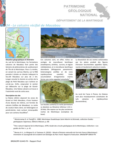 PATRIMOINE GÉOLOGIQUE NATIONAL DÉPARTEMENT DE LA MARTINIQUE 24 - Le calcaire récifal de Macabou Falaise calcaire de Grand Macabou Situation géographique et itinéraire Au sud de la Martinique, les formations calcaires de Macabou font partie des témoins de phénomènes de soulèvement de l’île de la Martinique. Pour s’y rendre, en venant du sud (au Marin), sur la RN6 prendre à droite un chemin indiquant le lieu-dit Macabou sur plus de 2 km. Longer ensuite le chemin en arrière de la plage de Petit Macabou qui s’achève en cul-de-sac. Enfin, emprunter le sentier qui débouche sur la plage de GrandMacabou. Une falaise calcaire se trouve à l’extrémité nord de cette anse. Description du site La falaise côtière séparant les anses de Grand et Petit Macabou, d’une hauteur d’une dizaine de mètres, est formée de calcaire (tuffites de Macabou). La roche de couleur blanc doré, est hétérogène et pulvérulente, mais surtout remarquable pour son contenu fossilifère2. Ces calcaires sont, en effet, riches en vestiges de macrofaune benthique (madrépores, cérithes, oursins, et algues mélobésiées), et à microfaune benthique abondante (Miogypsina panamensis, heterostegina antillea et de rares Lepidocyclinea canellei). Cette accumulation d’organismes marins forme une roche appelée lumachelle 1. La dissolution de ces roches carbonatées par les pluies produit des figures d’érosion tourmentées appelées lapiaz, rascles et localement calcaires à ravets. Lapiaz de Macabou 3 Au nord de l’anse à Plume, les falaises sont plus mozaïquement constituées de tufs calcaires à Lépidocyclines (foraminifère). Les fossiles contenus la roche permettent sa datation au Miocène inférieur (-22 à 20 Ma). Elle repose sur les plus anciennes roches de Martinique (complexe de base). 1 Westercamp D. et Tazieff H., 1980, Martinique Guadeloupe Saint-Martin la Désirade, collection Guides géologiques régionaux, Éditions Masson, p. 86. 2 Parc naturel régional de la Martinique, 1970, Guide des circuits géologiques de la Martinique, Collection « Les guides du Parc », p. 41. 3 Barras A-V., Le Moigne B. et Traineau H. (2010) – Musée d’histoire naturelle de Fort-de-France (Martinique) : Inventaire et sauvegarde de la Galerie de Géologie du Parc Foral. Rapport d’exécution. BRGM/RP-58933-FR. BRGM/RP-61443-FR – Rapport final