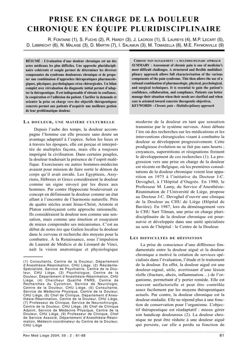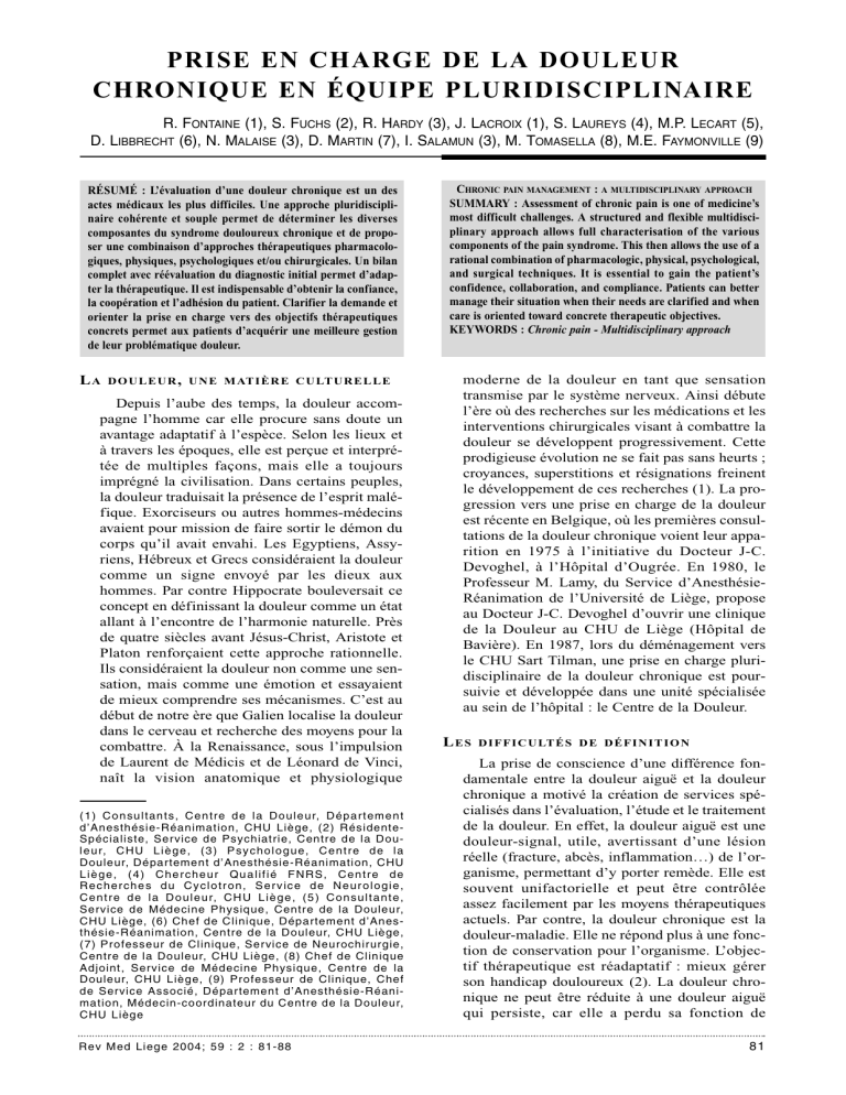 PRISE EN CHARGE DE LA DOULEUR CHRONIQUE EN ÉQUIPE PLURIDISCIPLINAIRE R. FONTAINE (1), S. FUCHS (2), R. HARDY (3), J. LACROIX (1), S. LAUREYS (4), M.P. LECART (5), D. LIBBRECHT (6), N. MALAISE (3), D. MARTIN (7), I. SALAMUN (3), M. TOMASELLA (8), M.E. FAYMONVILLE (9) RÉSUMÉ : L’évaluation d’une douleur chronique est un des actes médicaux les plus difficiles. Une approche pluridisciplinaire cohérente et souple permet de déterminer les diverses composantes du syndrome douloureux chronique et de proposer une combinaison d’approches thérapeutiques pharmacologiques, physiques, psychologiques et/ou chirurgicales. Un bilan complet avec réévaluation du diagnostic initial permet d’adapter la thérapeutique. Il est indispensable d’obtenir la confiance, la coopération et l’adhésion du patient. Clarifier la demande et orienter la prise en charge vers des objectifs thérapeutiques concrets permet aux patients d’acquérir une meilleure gestion de leur problématique douleur. LA D O U L E U R , U N E M AT I È R E C U LT U R E L L E Depuis l’aube des temps, la douleur accompagne l’homme car elle procure sans doute un avantage adaptatif à l’espèce. Selon les lieux et à travers les époques, elle est perçue et interprétée de multiples façons, mais elle a toujours imprégné la civilisation. Dans certains peuples, la douleur traduisait la présence de l’esprit maléfique. Exorciseurs ou autres hommes-médecins avaient pour mission de faire sortir le démon du corps qu’il avait envahi. Les Egyptiens, Assyriens, Hébreux et Grecs considéraient la douleur comme un signe envoyé par les dieux aux hommes. Par contre Hippocrate bouleversait ce concept en définissant la douleur comme un état allant à l’encontre de l’harmonie naturelle. Près de quatre siècles avant Jésus-Christ, Aristote et Platon renforçaient cette approche rationnelle. Ils considéraient la douleur non comme une sensation, mais comme une émotion et essayaient de mieux comprendre ses mécanismes. C’est au début de notre ère que Galien localise la douleur dans le cerveau et recherche des moyens pour la combattre. À la Renaissance, sous l’impulsion de Laurent de Médicis et de Léonard de Vinci, naît la vision anatomique et physiologique (1) Consultants, Centre de la Douleur, Département d’Anesthésie-Réanimation, CHU Liège, (2) RésidenteSpécialiste, Service de Psychiatrie, Centre de la Doul e u r, C H U L i è g e , ( 3 ) P s y c h o l o g u e , C e n t r e d e l a Douleur, Département d’Anesthésie-Réanimation, CHU Liège, (4) Chercheur Qualifié FNRS, Centre de Recherches du Cyclotron, Service de Neurologie, C e n t r e d e l a D o u l e u r, C H U L i è g e , ( 5 ) C o n s u l t a n t e , Service de Médecine Physique, Centre de la Douleur, CHU Liège, (6) Chef de Clinique, Département d’Anesthésie-Réanimation, Centre de la Douleur, CHU Liège, (7) Professeur de Clinique, Service de Neurochirurgie, Centre de la Douleur, CHU Liège, (8) Chef de Clinique Adjoint, Service de Médecine Physique, Centre de la Douleur, CHU Liège, (9) Professeur de Clinique, Chef de Service Associé, Département d’Anesthésie-Réanimation, Médecin-coordinateur du Centre de la Douleur, CHU Liège Rev Med Liege 2004; 59 : 2 : 81-88 CHRONIC PAIN MANAGEMENT : A MULTIDISCIPLINARY APPROACH SUMMARY : Assessment of chronic pain is one of medicine’s most difficult challenges. A structured and flexible multidisciplinary approach allows full characterisation of the various components of the pain syndrome. This then allows the use of a rational combination of pharmacologic, physical, psychological, and surgical techniques. It is essential to gain the patient’s confidence, collaboration, and compliance. Patients can better manage their situation when their needs are clarified and when care is oriented toward concrete therapeutic objectives. KEYWORDS : Chronic pain - Multidisciplinary approach moderne de la douleur en tant que sensation transmise par le système nerveux. Ainsi débute l’ère où des recherches sur les médications et les interventions chirurgicales visant à combattre la douleur se développent progressivement. Cette prodigieuse évolution ne se fait pas sans heurts ; croyances, superstitions et résignations freinent le développement de ces recherches (1). La progression vers une prise en charge de la douleur est récente en Belgique, où les premières consultations de la douleur chronique voient leur apparition en 1975 à l’initiative du Docteur J-C. Devoghel, à l’Hôpital d’Ougrée. En 1980, le Professeur M. Lamy, du Service d’AnesthésieRéanimation de l’Université de Liège, propose au Docteur J-C. Devoghel d’ouvrir une clinique de la Douleur au CHU de Liège (Hôpital de Bavière). En 1987, lors du déménagement vers le CHU Sart Tilman, une prise en charge pluridisciplinaire de la douleur chronique est poursuivie et développée dans une unité spécialisée au sein de l’hôpital : le Centre de la Douleur. LES D I F F I C U LT É S D E D É F I N I T I O N La prise de conscience d’une différence fondamentale entre la douleur aiguë et la douleur chronique a motivé la création de services spécialisés dans l’évaluation, l’étude et le traitement de la douleur. En effet, la douleur aiguë est une douleur-signal, utile, avertissant d’une lésion réelle (fracture, abcès, inflammation…) de l’organisme, permettant d’y porter remède. Elle est souvent unifactorielle et peut être contrôlée assez facilement par les moyens thérapeutiques actuels. Par contre, la douleur chronique est la douleur-maladie. Elle ne répond plus à une fonction de conservation pour l’organisme. L’objectif thérapeutique est réadaptatif : mieux gérer son handicap douloureux (2). La douleur chronique ne peut être réduite à une douleur aiguë qui persiste, car elle a perdu sa fonction de 81 R. FONTAINE ET COLL. symptôme d’alarme d’un dysfonctionne