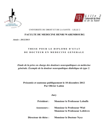 UNIVERSITE DU DROIT ET DE LA SANTE – LILLE 2 FACULTE DE MEDECINE HENRI WAREMBOURG Année : 2012/2013 THESE POUR LE DIPLOME D’ETAT DE DOCTEUR EN MEDECINE GENERALE Etude de la prise en charge des douleurs neuropathiques en médecine générale. Exemple de la douleur neuropathique diabétique de type 2. Présentée et soutenue publiquement le 10 décembre 2012 Par Olivier Ladon Jury Président : Monsieur le Professeur Lebuffe Assesseurs : Monsieur le Professeur Wiel Monsieur le Professeur Lefebvre Directeur de thèse : Monsieur le Docteur Nycz 0 1 UNIVERSITE DU DROIT ET DE LA SANTE – LILLE 2 FACULTE DE MEDECINE HENRI WAREMBOURG Année : 2012/2013 THESE POUR LE DIPLOME D’ETAT DE DOCTEUR EN MEDECINE GENERALE Etude de la prise en charge des douleurs neuropathiques en médecine générale. Exemple de la douleur neuropathique diabétique de type 2. Présentée et soutenue publiquement le 10 décembre 2012 Par Olivier Ladon Jury Président : Monsieur le Professeur Lebuffe Assesseurs : Monsieur le Professeur Wiel Monsieur le Professeur Lefebvre Directeur de thèse : Monsieur le Docteur Nycz 2 REMERCIEMENTS. A mon Président de Jury, Monsieur le Professeur Gilles LEBUFFE, Professeur des Universités – Praticien Hospitalier Anesthésiologie et Réanimation Chirurgicale – Médecine d’Urgence - Clinique d’Anesthésie-Réanimation Chirurgicale – Hôpital Claude Huriez – CHRU LILLE Merci de m’avoir fait l’honneur d’accepter la présidence de ma thèse. Veuillez recevoir mes sincères remerciements. A Monsieur le Professeur Eric WIEL, Professeur des Universités – Praticien Hospitalier Anesthésiologie et Réanimation Chirurgicale – Médecine d’Urgence - Chef de Pôle Adjoint du Pôle de l’Urgence - Coordonnateur Régional du DESC de Médecine d’Urgence - Vice-Président Fondateur de l’Association Francophone de Simulation en AnesthésieRéanimation et Médecine d’Urgence (AFSARMU) - Responsable de l’Unité Commune de Recherche du Pôle de l’Urgence – Pôle de l’Urgence – SAMU Régional de Lille – CHRU de LILLE Merci d’avoir accepté de juger ce travail. Veuillez recevoir l’expression de ma profonde reconnaissance. A Monsieur le Professeur Jean-Marc LEFEBVRE, Professeur des Universités Associé de Médecine Générale à mi-temps – Département de Médecine Générale – Pôle Formation – Faculté de Médecine de LILLE Merci d’avoir accepté de juger ce travail. Veuillez recevoir l’expression de ma profonde reconnaissance. 3 A mon Directeur de Thèse, Monsieur le Docteur Michel NYCZ, Praticien Hospitalier Anesthésiologie et Réanimation Chirurgicale - Anesthésie-Réanimation – Clinique des Acacias – CUCQ Anciennement Praticien Hospitalier – Service d’Anesthésie-Réanimation – CH BETHUNE Anciennement Médecin Responsable Qualité – CH BETHUNE Merci d’avoir accepté de diriger cette thèse. Merci pour vos précieux conseils et pour m’avoir guidé tout au long de ce travail. A Monsieur le Docteur Jérémy COQUART, - Faculté des Sports – CETAPS – Université de ROUEN Anciennement Attaché de Recherche Clinique à la Cellule Qualité – CH BETHUNE Merci de m’avoir aidé pendant la réalisation de cette thèse. Merci de votre travail lors de la réalisation des tests statistiques. A Madame le Docteur Christine LEMAIRE, Praticien Hospitalier - Chef de Service - Endocrinologie-Diabétologie – CH BETHUNE - Secrétaire de l’Association Prévention Artois (PrevArt) Merci pour votre aide apportée à l’élaboration du questionnaire. A Monsieur le Docteur Bernard LEROY Praticien Hospitalier - Anesthésie-Réanimation - Maternité Paul Gellé – CH ROUBAIX - Coordonnateur Consultation de la Douleur – Hôpital Victor Provo – CH Roubaix Merci pour votre aide et vos encouragements. 4 A mes Maîtres de Stage des Universités, Messieurs les Docteurs Guy PRUVOST, Jean-Marc SARELS et Olivier WESTEEL, Médecins Généralistes Enseignants - Faculté Libre de Médecine de LILLE Merci pour votre précieux enseignement et pour m’avoir conforté dans mon choix de spécialité de Médecine Générale. A tous les médecins généralistes de la région qui ont pris le temps de répondre au questionnaire envoyé. A ma mère et Francis, qui m’ont supporté et soutenu tout au long de mes études. Sans vous, je ne serais jamais arrivé là où je suis actuellement. A Aurélie, qui est restée à mes côtés, dans les bons moments comme les mauvais, pendant de nombreuses années. Merci pour ton amour et ta présence. A mes grands amis et futurs confrères, François, Jean-Baptiste et Sébastien. Merci pour tout ce temps passé en votre compagnie. Notre amitié reste primordiale pour moi. A tous ceux que j’apprécie, qui m’apprécient et que je n’ai pas cités, merci. 5 SOMMAIRE. I. INTRODUCTION...................................................................................9 1.1) Contexte...............................................................................................................9 1.1.1) Définition……………………………………………………………………….......9 1.1.2) Prévalence………………………………………………………………………..10 1.1.3) Connaissances actuelles…………………………………………………….....11 1.2) Justification…………………………………………………………………………..14 1.2.1) Morbi-mortalité de la neuropathie diabétique…………………………………15 1.2.2) Prise en charge difficile………………………………………………………….15 1.2.3) Altération de la qualité de vie…………………………………………………..16 1.3) Objectifs…………………………………………………………………………….....16 1.3.1) Objectif principal…………………………………………………………………16 1.3.2) Objectif 
