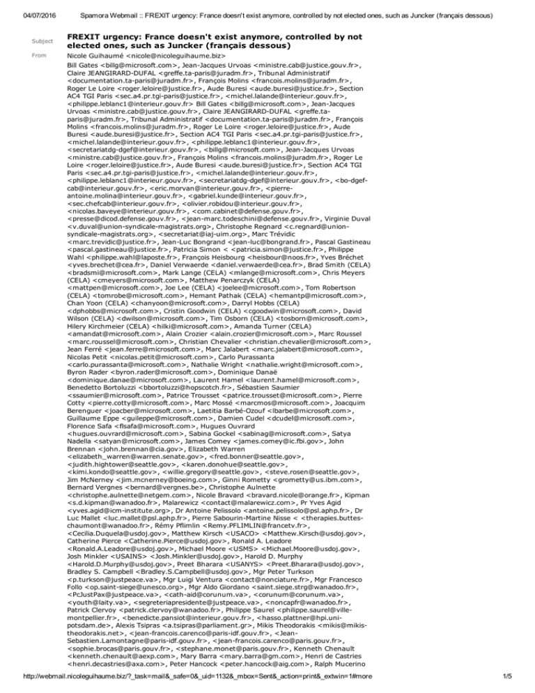 04/07/2016 Spamora Webmail :: FREXIT urgency: France doesn't exist anymore, controlled by not elected ones, such as Juncker (français dessous) Subject FREXIT urgency: France doesn't exist anymore, controlled by not elected ones, such as Juncker (français dessous) From Nicole Guihaumé <[email protected]> Bill Gates <[email protected]>, JeanJacques Urvoas <[email protected]>, Claire JEANGIRARDDUFAL <greffe.ta[email protected]>, Tribunal Administratif <documentation.ta[email protected]>, François Molins <[email protected]>, Roger Le Loire <[email protected]>, Aude Buresi <[email protected]>, Section AC4 TGI Paris <sec.a4.pr.tgi[email protected]>, <[email protected]>, <[email protected]> Bill Gates <[email protected]>, JeanJacques Urvoas <[email protected]>, Claire JEANGIRARDDUFAL <greffe.ta [email protected]>, Tribunal Administratif <documentation.ta[email protected]>, François Molins <[email protected]>, Roger Le Loire <[email protected]>, Aude Buresi <[email protected]>, Section AC4 TGI Paris <sec.a4.pr.tgi[email protected]>, <[email protected]>, <[email protected]>, <secretariatdg[email protected]>, <[email protected]>, JeanJacques Urvoas <[email protected]>, François Molins <[email protected]>, Roger Le Loire <[email protected]>, Aude Buresi <[email protected]>, Section AC4 TGI Paris <sec.a4.pr.tgi[email protected]>, <[email protected]>, <[email protected]>, <secretariatdg[email protected]>, <bodgef [email protected]>, <[email protected]>, <pierre [email protected]>, <[email protected]>, <[email protected]>, <[email protected]>, <[email protected]>, <[email protected]>, <[email protected]>, <jean[email protected]>, Virginie Duval <v.duval@unionsyndicalemagistrats.org>, Christophe Regnard <c.regnard@union syndicalemagistrats.org>, <secretariat@iajuim.org>, Marc Trévidic <[email protected]>, JeanLuc Bongrand <jean[email protected]>, Pascal Gastineau <[email protected]>, Patricia Simon < <[email protected]>, Philippe Wahl <[email protected]>, François Heisbourg <[email protected]>, Yves Bréchet <[email protected]>, Daniel Verwaerde <[email protected]>, Brad Smith (CELA) <[email protected]>, Mark Lange (CELA) <[email protected]>, Chris Meyers (CELA) <[email protected]>, Matthew Penarczyk (CELA) <[email protected]>, Joe Lee (CELA) <[email protected]>, Tom Robertson (CELA) <[email protected]>, Hemant Pathak (CELA) <[email protected]>, Chan Yoon (CELA) <[email protected]>, Darryl Hobbs (CELA) <[email protected]>, Cristin Goodwin (CELA) <[email protected]>, David Wilson (CELA) <[email protected]>, Tim Osborn (CELA) <[email protected]>, Hilery Kirchmeier (CELA) <[email protected]>, Amanda Turner (CELA) <[email protected]>, Alain Crozier <[email protected]>, Marc Roussel <[email protected]>, Christian Chevalier <[email protected]>, Jean Ferré <[email protected]>, Marc Jalabert <[email protected]>, Nicolas Petit <[email protected]>, Carlo Purassanta <[email protected]>, Nathalie Wright <[email protected]>, Byron Rader <[email protected]>, Dominique Danaë <[email protected]>, Laurent Hamel <[email protected]>, Benedetto Bortoluzzi <[email protected]>, Sébastien Saumier <[email protected]>, Patrice Trousset <[email protected]>, Pierre Cotty <[email protected]>, Marc Mossé <[email protected]>, Joacquim Berenguer <[email protected]>, Laetitia BarbéOzouf <[email protected]>, Guillaume Eppe <[email protected]>, Damien Cudel <[email protected]>, Florence Safa <[email protected]>, Hugues Ouvrard <[email protected]>, Sabina Gockel <[email protected]>, Satya Nadella <[email protected]>, James Comey <[email protected]>, John Brennan <[email protected]>, Elizabeth Warren <[email protected]>, <[email protected]>, <[email protected]>, <[email protected]>, <[email protected]>, <[email protected]>, <[email protected]>, Jim McNerney <[email protected]>, Ginni Rometty <[email protected]>, Bernard Vergnes <[email protected]>, Christophe Aulnette <[email protected]>, Nicole Bravard <[email protected]>, Kipman <[email protected]>, Malarewicz <[email protected]>, Pr Yves Agid <yves.agid@icminstitute.org>, Dr Antoine Pelissolo <[email protected]>, Dr Luc Mallet <[email protected]>, Pierre SabourinMartine Nisse < <therapies.buttes [email protected]>, Rémy Pflimlin <[email protected]>, <[email protected]>, Matthew Kirsch <USACO> <[email protected]>, Catherine Pierce <[email protected]>, Ronald A. Leadore <[email protected]>, Michael Moore <USMS> <[email protected]>, Josh Minkler <USAINS> <[email protected]>, Harold D. Murphy <[email protected]>, Preet Bharara <USANYS> <[email protected]>, Bradley S. Campbell <[email protected]>, Mgr Peter Turkson <[email protected]>, Mgr Luigi Ventura <[email protected]>, Mgr Francesco Follo <op.saint[email protected]>, Mgr Aldo Giordano <[email protected]>, <[email protected]>, <cath[email protected]>, <[email protected]>, <[email protected]>, <[email protected]>, <[email protected]>, Patrick Clervoy <[email protected]>, Philippe Saurel <philippe.saurel@ville montpellier.fr>, <[email protected]>, <[email protected] potsdam.de>, Alexis Tsipras <[email protected]>, Mikis Theodorakis <mikis@mikis theodorakis.net>, <jeanfrancois.carenco@parisidf.gouv.fr>, <Jean Sebastien.Lamontagne@parisidf.gouv.fr>, <jean[email protected]>, <[email protected]>, <[email protected]>, Kenneth Chenault <[email protected]>, Mary Barra <[email protected]>, Henri de Castries <[email protected]>, Peter Hancock <[email protected]>, Ralph Mucerino http://webmail.nicoleguihaume.biz/?_task=mail&_safe=0&_uid=1132&_mbox=Sent&_action=print&_extwin=1#more 1/5 04/07/2016 To Spamora Webmail :: FREXIT urgency: France doesn't exist anymore, controlled by not elected ones, such as Juncker (français dessous) <[email protected]>, Joachim Wenning <[email protected]>, Mario Greco <[email protected]>, Stephen Hemsley <[email protected]>, Pierre Nanterme <[email protected]>, Hasso Plattner <[email protected]>, Bill McDermott < <[email protected]>, Punit Renjen <[email protected]>, Doug McMillon <[email protected]>, Be
