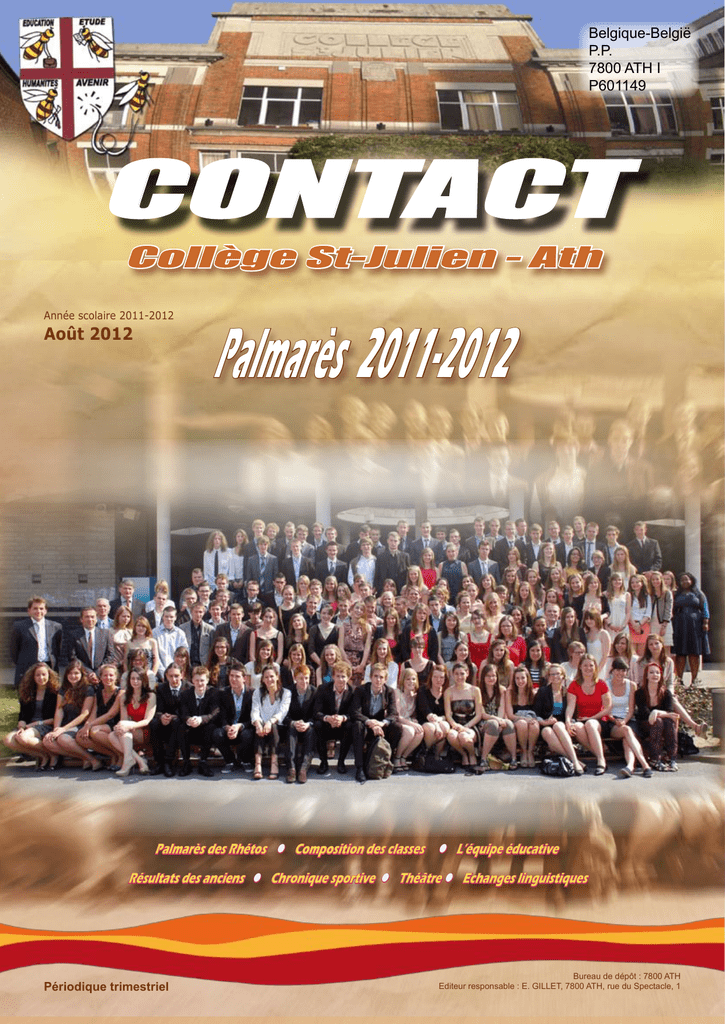Belgique-België P.P. 7800 ATH I P601149 CONTACT Collège St-Julien - Ath Année scolaire 2011-2012 Août 2012 Palmarès 2011-2012 Palmarès des Rhétos l Composition des classes l L’équipe éducative Résultats des anciens l Chronique sportive l Théâtre l Echanges linguistiques Périodique trimestriel CONTACT - août 2012 Bureau de dépôt : 7800 ATH Editeur responsable : E. GILLET, 7800 ATH, rue du Spectacle,1 1 édito L e « Contact » du mois d’août vous parvient à un moment charnière entre la fin de l’année scolaire 2011-2012 et le début de la suivante. C’est aussi pour bon nombre d’entre vous le temps des vacances qui petit à petit touche à sa fin. Vous découvrirez dans ce numéro le palmarès de nos 169 élèves des classes terminales que nous félicitons encore pour leur parcours au Collège SaintJulien. Si beaucoup sont fermement fixés quant à leur orientation future, certains sont plus indécis. Notre projet d’établissement a mis en évidence l’importance d’élaborer progressivement son projet personnel qu’il soit scolaire ou professionnel. Avec la collaboration de nombreux partenaires dont l’Association des Parents et l’Association des Anciens, nous nous attelons à rendre concret ce travail d’orientation progressive : apprendre à se connaître d’une part, à connaître les secteurs professionnels et les filières d’études, d’autre part. Dans cet exemplaire du « Contact » se trouvent également de nombreuses informations sur les classes, l’équipe éducative ou encore l’agenda des activités et les résultats sportifs de l’année qui s’est terminée. Vous trouverez en dernière page quelques informations pratiques au sujet de la prochaine rentrée 2012-2013. A chacune et chacun, enseignants, éducateurs, élèves et parents, je souhaite de vivre une année pleine de réussites, de découvertes et de succès. Bienvenue déjà à tous les nouveaux élèves qui rejoignent le Collège SaintJulien et bon vent aux jeunes anciens dans leur parcours futur ! Eric GILLET, Principal La rentrée au Collège St-Julien Septembre 2012 Mercredi 29 août Examens de passage : mathématique (08h15) - edm, grec, géo (12h45) - néerlandais (14h30) Jeudi 30 août Examens de passage : éco, ag, latin (08h15) - histoire, hist.art, bio, espagnol (10h15) - français (12h45) Vendredi 31 août Examens de passage : physique, sciences (08h15) - chimie, religion (10h15) 13h00-14h00 : Contacts pédagogiques pour les élèves de 1ère Lundi 3 septembre De 8h10 à 16h05 : rentrée des élèves de 1ère année Communication des décisions des conseils de classes aux élèves de 6e (16h15) et aux élèves de 2e - 5e (16h30) Mardi 4 septembre De 8h10 à 16h05: rentrée des élèves de 2e année Contacts pédagogiques individuels : élèves de 4e - 5e (10h-12h) et élèves de 2e - 3e (11h55-13h35) De 13h35 à 16h05 : rentrée des élèves de 3e - 4e Mercredi 5 septembre De 8h10 à 11h55: rentrée des élèves de 5e - 6e Service Livres : 2 lundi 3 (13h-17h) mercredi 5 (9h-12h) 2e 3e-4e jeudi 6 (9h-12h) 5e-6e CONTACT - août 2012 Palmarès des élèves de rhétorique PALMARES Enseignement secondaire général - Humanités - Année 2011-2012 Ont terminé avec succès : AUPAIX Anaïs, CHIEVRES CARLIER Valentin, MESLIN-L’EVEQUE CHANOINE Justine, CHIEVRES DEBBAH Victoria, REBAIX DELABRE Alexandre, FLOBECQ DE MARE Céline, PAPIGNIES DEMEY Sophie, OEUDEGHIEN DE RIEMACKER Florian, ATH MOULIN Maureen, DEUX-ACREN PORTOIS Annaïse, ORMEIGNIES VANSTALS Aurélien, FLOBECQ SIXIEME ECONOMIQUE-LANGUES Titulaire : Mme HOCEPIED Ont terminé avec succès : BEAUVILLAIN Diego, SILLY COUCKHUYT Aurélie, ELLEZELLES DELPUTTE Adèle, CAMBRON-CASTEAU DELROISSE Céline, MEVERGNIES-LEZ-LENS MOYART Nicolas, BUISSENAL VERHELST Marie-Line, LAHAMAIDE Ont terminé avec satisfaction : DEPROOTE Lucas, CHIEVRES DUVINAGE Simon, BELOEIL HUYLEBROECK Maverick, MESLIN-L’EVEQUE LAVIN Jérémy, ATH TAMA Anaïs, VAUDIGNIES VANDEMEULEBROECKE Thomas, VILLERS-SAINT-AMAND Ont terminé avec satisfaction : BLOMART Marine, ELLEZELLES FERON Noémie, ELLIGNIES-SAINTE-ANNE LISON Maïté, ELLEZELLES MOL Océane, MONTIGNIES-LEZ-LENS UKWIKUNDA Sabea De Carmel, QUEVAUCAMPS Ont obtenu le certificat de fin d’études «Economiques-Langues» : BEAUVILLAIN Diego, SILLY COUCKHUYT Aurélie, ELLEZELLES DELPUTTE Adèle, CAMBRON-CASTEAU DELROISSE Céline, MEVERGNIES-LEZ-LENS DEPROOTE Lucas, CHIEVRES HUYLEBROECK Maverick, MESLIN-L’EVEQUE MOYART Nicolas, BUISSENAL TAMA Anaïs, VAUDIGNIES VERHELST Marie-Line, LAHAMAIDE SIXIEME GREC-MATH-SCIENCES Titulaire : Melle VIVIER A terminé avec grande distinction : DEDEYCKER Louis, QUEVAUCAMPS Ont terminé avec distinction : DELITTE Colin, CHAPELLE-A-WATTINES MERSCH Amélie, WANNEBECQ Ont terminé avec satisfaction : GAUDISAUBOIS Zoé, MESLIN-L’EVEQUE VAN ERMEN Malika, GHISLENGHIEN Ont obtenu le certificat de fin d’études «Grec-Mathématique-Sciences» : DEDEYCKER Louis, QUEVAUCAMPS DELITTE Colin, CHAPELLE-A-WATTINES MERSCH Amélie, WANNEBECQ MORELLE Axel, BERNISSART VAN ERMEN Malika, GHISLENGHIEN SIXIEME LANGUES Titulaire : Mr UYLEBROECK Ont terminé avec distinction : BOURGEOIS Amandine, ATH CAMBIER Eléonore, FLOBECQ GHYSELINGS Cindy, ORMEIGNIES SMEYSTERS Rachel, ATH Ont obtenu le certificat de fin d’études «Langues» : BLOMART Marine, ELLEZELLES BOURGEOIS Amandine, ATH CAMBIER Eléonore, FLOBECQ CARLIER Valentin, MESLIN-L’EVEQUE CHANOINE Justine, CHIEVRES DEBBAH Victoria, REBAIX DELABRE Alexandre, FLOBECQ DE MARE Céline, PAPIGNIES DEMEY Sophie, OEUDEGHIEN DE RIEMACKER Florian, ATH FERON Noémie, ELLIGNIES-SAINTE-ANNE GHYSELINGS Cindy, ORMEIGNIES MOL Océane, MONTIGNIES-LEZ-LENS MOULIN Maureen, DEUX-ACREN PORTOIS Annaïse, ORMEIGNIES SMEYSTERS Rachel, ATH UKWIKUNDA Sabea De Carmel, QUEVAUCAMPS VANSTALS Aurélien, FLOBECQ SIXIEME LATIN-GREC Titulaire : Mme HOCEPIED Ont terminé avec grande distinction : GANDIBLEUX Laurie, CHIEVRES PITTAU Luna, BELOEIL TANGHE Alison