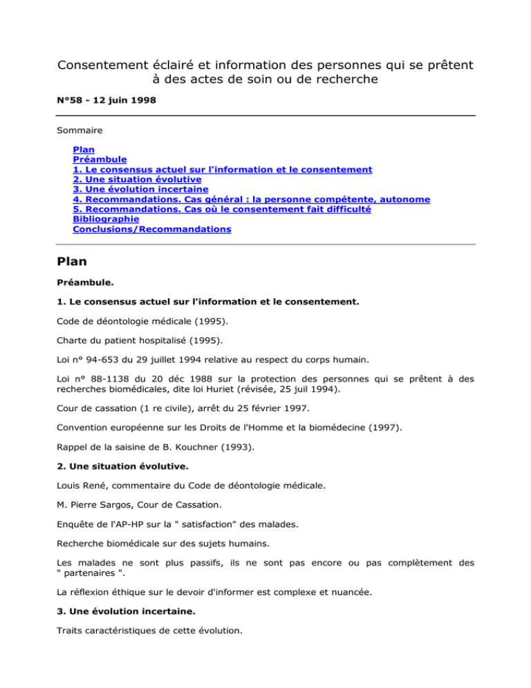 du CCNE, le 9 février 1993: "Que recouvre la notion du consentement éclairé? Comment