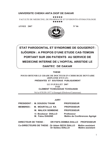 UNIVERSITE CHEIKH ANTA DIOP DE DAKAR FACULTE DE MEDECINE, DE PHARMACIE ET D’ODONTO-STOMATOLOGIE ANNEE 2007 N° 06 ETAT PARODONTAL ET SYNDROME DE GOUGEROTSJÖGREN : A PROPOS D’UNE ETUDE CAS-TEMOIN PORTANT SUR 206 PATIENTS AU SERVICE DE MEDECINE INTERNE DE L’HOPITAL ARISTIDE LE DANTEC DE DAKAR THESE POUR OBTENIR LE GRADE DE DOCTEUR EN CHIRURGIE DENTAIRE (DIPLOME D’ETAT) PRÉSENTÉE ET SOUTENUE PUBLIQUEMENT LE 19 JUILLET 2007 PAR CLEMENT TCHEUGOUE TCHOUASSI Né le 07JUIN 1977 à Enongal (Ebolowa/Cameroun) JURY PRESIDENT : M. DOUDOU THIAM PROFESSEUR MEMBRES : M. MOURTALLA KA PROFESSEUR M. MALICK SEMBENE PROFESSEUR M. Boubacar DIALLO M. Falou DIAGNE Professeur Maître de Conférences Agrégé DIRECTEUR DE THESE : DR PAPA DEMBA DIALLO Co-DIRECTEURS DE THESE : Dr Adam SECK DIALLO Dr Saïdou DIALLO PROFESSEUR Maître assistant Maître assistant 1 2 INTRODUCTION ............................................................................................ 1 CHAPITRE I : RAPPELS SUR LES GLANDES SALIVAIRES, LES GLANDES LACRYMALES ET LE PARODONTE 1-Physiologie des sécrétions salivaires et lacrymales............................................ 3 1.1- LES GLANDES SALIVAIRES ............................................................. 3 1.1.1- ANATOMIE DES GLANDES SALIVAIRES....................................... 3 1.1.1.1- Les glandes principales .......................................................... 3 1.1.1.2- Les glandes accessoires ........................................................ 4 1.1.2 - HISTOLOGIE DES GLANDES SALIVAIRES................................... 4 1.1.2.1- Les cellules acineuses............................................................ 5 1.1.2.2- Les cellules des canaux intercalaires ..................................... 6 1.1.2.3- Les cellules canaux striés....................................................... 6 1.1.2.4- Les cellules myoépithéliales ................................................... 7 1.1.3 - LA SECRETION SALIVAIRE ........................................................... 7 1.1.4 - Composition de la salive ................................................................... 9 1.1.5 - Rôle de la salive............................................................................... 10 1.1.5.1- Rôle digestif ............................................................................ 10 1.1.5.2- Rôle de lubrifiant..................................................................... 10 1.1.5.3- Rôle dans la reminéralisation ................................................. 10 1.1.5.4- Pouvoir tampon salivaire ........................................................ 11 1.1.5.5- Rôle antiseptique .................................................................... 11 1.1.5.5.1- Immunité cellulaire ...................................................... 11 1.1.5.5.2- Immunité humorale...................................................... 11 1.1.5.5.3- Les agglutinines salivaires .......................................... 12 1.1.5.5.4- Les cystatines.............................................................. 12 1.1.5.5.5- Les histatines .............................................................. 12 1.1.5.5.6- Les amylases .............................................................. 13 1.1.5.5.7- La lactoferrine.............................................................. 13 1.1.5.5.8- Le lysozyme ................................................................ 13 1.1.5.5.9- Les sialopéroxydases.................................................. 13 1.1.5.6- Le rôle d’épurateur.................................................................. 14 1.2- LES GLANDES LACRYMALES........................................................... 14 1.3- LES AUTRES GLANDES EXOCRINES ............................................... 15 2. Le Parodonte et les maladies parodontales ........................................................ 15 2.1- Définition ............................................................................................ 15 2.2-Anatomie ............................................................................................ 15 2.2.1- Gencive ............................................................................................ 15 2.2.1.1- Gencive libre........................................................................... 16 2.2.1.2- Gencive attachée.................................................................... 16 2.2.1.3- Gencive papillaire ................................................................... 16 2.2.2- Os alvéolaire ...................................................................................... 17 2.2.3- Desmodonte....................................................................................... 17 2.2.4- Cément ............................................................................................ 18 2.3- Physiologie du parodonte…………………………………………… ............... 18 2.4- Les maladies parodontales………………………………………….. .............. 19 2.4.1- classification des maladies parodontales ........................................... 20 2.4.2- Etiologie ............................................................................................ 22 2.4.2.1- Les facteurs locaux directs ..................................................... 22 2.4.2.2- Les facteurs locaux indirects................................................... 23 2.4.2.3- Les Facteurs de risque .......................................................... 23 3 2.4.2.3.1- L’âge ........................................................................... 23 2.4.2.3.2- Le sexe........................................................................ 24 2.4.2.3.3- Les facteurs socio-économiques ................................. 24 2.4.2.3.4- Les facteurs génétiques .............................................. 25 2.4.2.3.5- Le tabac ...................