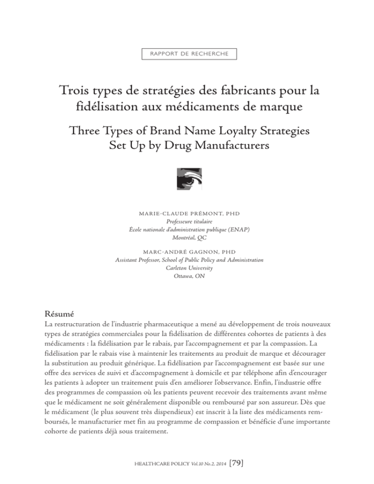 R A P P ORT DE REC H ERC H E Trois types de stratégies des fabricants pour la fidélisation aux médicaments de marque Three Types of Brand Name Loyalty Strategies Set Up by Drug Manufacturers M A R I E - C L AU D E P R É M O N T, P H D Professeure titulaire École nationale d’administration publique (ENAP) Montréal, QC M A RC - A N D R É G AG N O N, P H D Assistant Professor, School of Public Policy and Administration Carleton University Ottawa, ON Résumé La restructuration de l’industrie pharmaceutique a mené au développement de trois nouveaux types de stratégies commerciales pour la fidélisation de différentes cohortes de patients à des médicaments : la fidélisation par le rabais, par l’accompagnement et par la compassion. La fidélisation par le rabais vise à maintenir les traitements au produit de marque et décourager la substitution au produit générique. La fidélisation par l’accompagnement est basée sur une offre des services de suivi et d’accompagnement à domicile et par téléphone afin d’encourager les patients à adopter un traitement puis d’en améliorer l’observance. Enfin, l’industrie offre des programmes de compassion où les patients peuvent recevoir des traitements avant même que le médicament ne soit généralement disponible ou remboursé par son assureur. Dès que le médicament (le plus souvent très dispendieux) est inscrit à la liste des médicaments remboursés, le manufacturier met fin au programme de compassion et bénéficie d’une importante cohorte de patients déjà sous traitement. HEALTHCARE POLICY Vol.10 No.2, 2014 [79] Marie-Claude Prémont et Marc-André Gagnon L’impact de ces programmes sur les politiques publiques et les droits des patients soulève de nombreuses préoccupations, au nombre desquelles figurent au premier plan l’accès direct du fabricant au patient et ses données de santé et la pression à la hausse sur les coûts de l’assurance-médicaments. Abstract The recent restructuring of the pharmaceutical industry has led to three new types of promotional strategies to build patient loyalty to brand name drugs: loyalty through rebates, patient support, and compassion programs. Loyalty through rebates seeks to keep patients on a brand name drug and prevent their switch to the generic equivalent. Loyalty through patient support provides aftersales services to help and support patients (by phone or home visits) in order to improve adherence to their treatments. Finally, compassion programs offer patients access to drugs still awaiting regulatory approval or reimbursement by insurers. When and if the approval process is successful, the manufacturer puts an end to the compassion program and benefits from a significant cohort of patients already taking a very expensive drug for which reimbursement is assured. The impact of these programs on public policies and patients’ rights raises numerous concerns, among which the direct access to patients and their health information by drug manufacturers and upward pressure on costs for drug insurance plans. T Introduction Contexte général L’industrie pharmaceutique de médicaments novateurs1 est en profonde restructuration et ses pratiques de promotion du médicament en mutation. La convergence assez unique de fin de brevet de plusieurs médicaments vedettes dits « blockbusters » (générant un revenu supérieur à 1 milliard $ par année) sur une courte période de temps2, affecte une très grande part des revenus de l’industrie. De plus, contrairement aux décennies précédentes, l’industrie pharmaceutique ne dispose pas suffisamment de nouveaux médicaments novateurs en réserve pour prendre le relais. Un rapport d’enquête de la Commission européenne identifiait dès 2008 ces deux phénomènes comme étant à la source d’une restructuration importante de l’industrie pharmaceutique et comme cause de la mise en place par les fabricants de nouvelles stratégies, notamment pour prolonger la durée de vie de leurs médicaments vedettes arrivés en fin de course (European Commission 2008). Réagissant à son environnement, l’industrie pharmaceutique remodèle ses stratégies industrielles, mais aussi de commercialisation des médicaments (Abecassis et Coutinet 2008 et 2009). Même si la valeur commerciale d’un brevet ne prend pas fin dès l’expiration du brevet (Hudson 2000), les fabricants s’ajustaient à la réduction importante de leurs ventes, quoique [80] HEALTHCARE POLICY Vol.10 No.2, 2014 Trois types de stratégies des fabricants pour la fidélisation aux médicaments de marque graduelle, en présence de la concurrence des génériques (Avorn 2011). En effet, l’introduction à un prix inférieur des médicaments génériques bio-équivalents permet la substitution graduelle du médicament, se traduisant par des économies significatives pour les patients et leurs assureurs. L’industrie aurait maintenant décidé de modifier sa stratégie face à son nouvel environnement. Objet de l’article L’Ordre des pharmaciens du Québec nous a mandatés pour préparer et animer une journée de discussion tenue à Montréal le 27 novembre 2013 avec les principaux intervenants québécois du domaine de la santé et des médicaments, portant sur les stratégies de fidélisation de l’industrie pharmaceutique. Afin d’embrasser un cadre plus large que celui du Québec et mieux cerner les ressorts internationaux et systémiques du phénomène, nous avons fait une revue de la littérature sur les programmes de fidélisation au Canada, aux États-Unis et en France. Au-delà des publications académiques, nous avons incorporé à notre analyse divers documents gouvernementaux, corporatifs et promotionnels du Canada, publiés sur le web ou remis par l’Ordre. Nous présentons ici les premiers résultats de cette analyse sous la forme d’une typologie des principaux mécanismes de fidélisation mis en œuvre par l’industrie pharmaceuti