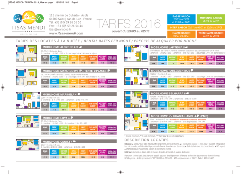 ITSAS MENDI • TARIFA4 2016_Mise en page 1 18/12/15 18:21 Page1 115 chemin de Duhartia - Acotz 64500 Saint-Jean-de-Luz - France Tél. +33 (0)5 59 26 56 50 Fax : +33 (0)5 59 26 54 44 [email protected] BASSE SAISON 23/03 au 25/06 et 27/08 au 02/11 TARIFS 2016 INTER SAISON 02/07 au 09/07 et 20/08 au 27/08 ouvert du 23/03 au 02/11 www.itsas-mendi.com MOYENNE SAISON 25/06 au 02/07 HAUTE SAISON 09/07 au 23/07 TRÈS HAUTE SAISON 23/07 au 20/08 TARIFS DES LOCATIFS À LA NUITÉE / RENTAL RATES PER NIGHT / PRECIOS DE ALQUILER POR NOCHE MOBILHOME ALCYONS 2/3 MOBILHOME LAFITENIA 5 27m2 I Moins de 4 ans I Chambre parentale spacieuse pouvant accueillir un lit bébé. 1 chambre : 1 lit 140 x 190 - 1 chambre : 2 lits 70 x 190 - 1 couchage 130 x 195 dans le séjour 19,77m2 I Moins de 4 ans 1 chambre : 1 lit 140 x 190 - 1 couchage 140 x 190 dans le séjour 1 Nuit *** BASSE SAISON* MOYENNE SAISON* INTER SAISON** HAUTE SAISON* 39 € 35 € 47 € 64 € 84 € MOBILHOME MAYARCO 2/3 TRÈS HAUTE WEEK-END FÉRIÉS SAISON** 3 nuits min. 99 € 45 € WEEK-END CLASSIQUE 1 Nuit *** BASSE SAISON* MOYENNE SAISON* INTER SAISON** HAUTE SAISON* 40 € 56 € 54 € 71 € 104 € 134 € BASSE SAISON* MOYENNE SAISON* INTER SAISON** HAUTE SAISON* 39 € 35 € 47 € 71 € 98 € TRÈS HAUTE WEEK-END FÉRIÉS SAISON** 3 nuits min. 112 € 45 € 151 € 71 € WEEK-END CLASSIQUE 62 € MOBILHOME PARLEMENTIA 6 + TENTE 2 PLACES 29,26m2 I Moins de 5 ans 1 chambre : 1 lit 140 x 190 - 1 chambre : 2 lits 80 x 190 - 1 couchage 130 x 195 dans le séjour 19,77m2 + 4,70m2 I Tente du 27/06 au 29/08 - Moins de 5 ans 1 chambre : 1 lit 140 x 190 - 1 couchage 140 x 190 dans le séjour + 1 tente 1 Nuit *** TRÈS HAUTE WEEK-END FÉRIÉS SAISON** 3 nuits min. WEEK-END CLASSIQUE 1 Nuit *** BASSE SAISON* MOYENNE SAISON* INTER SAISON** HAUTE SAISON* 40 € 64 € 62 € 81 € 112 € 149 € TRÈS HAUTE WEEK-END FÉRIÉS SAISON** 3 nuits min. 162 € 79 € WEEK-END CLASSIQUE 69 € MOBILHOME BELHARRA 6 MOBILHOME MARINELA 4 34,40m2 I Moins de 3 ans 1 chambre : 1 lit 140 x 190 - 2 chambres : 2 lits 70 x 190 2 23m I Moins de 4 ans 1 chambre : 1 lit 140 x 190 - 1 chambre : 2 lits 70 x 190 1 Nuit *** BASSE SAISON* MOYENNE SAISON* INTER SAISON** HAUTE SAISON* 47 € 45 € 58 € 85 € 110 € TRÈS HAUTE WEEK-END FÉRIÉS SAISON** 3 nuits min. 131 € 59 € WEEK-END CLASSIQUE 51 € 1 Nuit *** BASSE SAISON* MOYENNE SAISON* INTER SAISON** HAUTE SAISON* 80 € 78 € 89 € 119 € 156 € MOBILHOME MOBILHOME LOYA 4 BASSE SAISON* MOYENNE SAISON* INTER SAISON** HAUTE SAISON* 47 € 45 € 58 € 87 € 118 € 175 € 99 € WEEK-END CLASSIQUE 87 € (PMR) 35 m2 I Moins de 3 ans - Priorité aux détenteurs d’une carte d'invalidité 1 chambre : 2 lit 80 x 190 - 1 chambre : 2 lits superposés 70 x 190 21,80m2 I Moins de 2 ans 1 chambre : 1 lit 140 x 190 - 1 chambre : 2 lits 70 x 190 1 Nuit *** UHABIA-HANDI 4 TRÈS HAUTE WEEK-END FÉRIÉS SAISON** 3 nuits min. TRÈS HAUTE WEEK-END FÉRIÉS SAISON** 3 nuits min. 137 € 59 € WEEK-END CLASSIQUE 51 € 1 Nuit *** BASSE SAISON* MOYENNE SAISON* INTER SAISON** HAUTE SAISON* 47 € 45 € 58 € 93 € 123 € TRÈS HAUTE WEEK-END FÉRIÉS SAISON** 3 nuits min. 139 € 59 € WEEK-END CLASSIQUE 51 € * 2 nuits minimum, ** 7 nuits minimum, *** Tarif pour 1 nuit kit draps fourni DESCRIPTION LOCATIFS MOBILHOME CENITZ 4 23m2 I Moins de 5 ans 1 chambre : 1 lit 140 x 190 - 1 chambre : 2 lits 70 x 190 1 Nuit *** BASSE SAISON* MOYENNE SAISON* INTER SAISON** HAUTE SAISON* 47 € 45 € 58 € 93 € 123 € TRÈS HAUTE WEEK-END FÉRIÉS SAISON** 3 nuits min. 139 € 59 € WEEK-END CLASSIQUE 51 € Intérieur : ■ 1 séjour avec table et banquette, rangements, télévision fournie, ■ 1 coin cuisine équipée : 1 évier, 2 ou 4 feux gaz, réfrigérateur, four micro-ondes, cafetière électrique, vaisselle fournie (inventaire sur demande), ■ Salle de bain avec douche et lavabo, ■ WC séparé, ■ Chambre(s) avec rangements, oreillers et couvertures fournis. Extérieur : terrasse en dalles, table et chaises de jardin, 2 transats, 1 parasol, 1 étendoir. Plans non contractuels. Les plans de locatifs peuvent être légèrement différents en fonction des marques de mobilhomes. RCS Bayonne - Arrêté préfectoral n°98/TOU030 du 28/04/97 - 475 emplacements n° SIRET : TVA 47 415 026 475 ITSAS MENDI • TARIFA4 2016_Mise en page 1 18/12/15 18:22 Page2 TARIFS DES EMPLACEMENTS BASSE SAISON 23/03 au 25/06 et 27/08 au 02/11 MOYENNE SAISON 25/06 au 09/07 et 20/08 au 27/08 Tarifs à la nuitée de 14h à 12h HAUTE SAISON 09/07 au 20/08 LES PACKS ITSAS 13,50 € 26,20 € Forfait 2 + électricité 10A 21,00 € 34,00 € 47,00 € supplémentaire (≥ 10 ans) 4,50 € 5,50 € 8,00 € Enfant de 2 à 9 ans 3,00 € 4,50 € 5,50 € Animal 3,60 € 3,60 € 3,60 € Véhicule supplémentaire gratuit gratuit 3,50 € Visiteur (≥ 10 ans) 5,00 € 5,00 € 5,00 € Late check-out (départ 19h) 10,00 € Le Pack SURF Venez-vous initier au surf et à son environnement ! 1 cours de surf + transfert + matériel. Tarif : 40€(à partir de 3 personnes) Le Pack DÉCOUVERTE Venez découvrir le Pays Basque ! Un repas Basque au restaurant du camping et les entrées sur 3 sites incontournables que sont les grottes de Sare, le Musée Jean Vier et le Musée de la Mer aquarium de Biarritz. Tarif : 37€ pour les adultes et 21,80€ pour les enfants (4 à 12 ans). CONDITIONS DE L’OFFRE : Offres valables du 23/03/2016 au 25/06/2016 et du 27/08/2016 au 02/11/2016. Disponibles sur tous les hébergements et sans limite de durée. Attention aux jours d'ouvertures des musées si vous prenez le pack découverte. Les offres ne sont ni annulables, ni remboursables. WEEK-END MALIN ! 15% de remise immédiate pour un séjour d'une semaine de location en mobilhome Parlementia du : 02/04 au 17/04, du 17/05 au 17/06 et du 03/09 au 22/10. Le camping Itsas Mendi vous offre des journées de vacances ! Nous vous offrons des nuitées en emplace