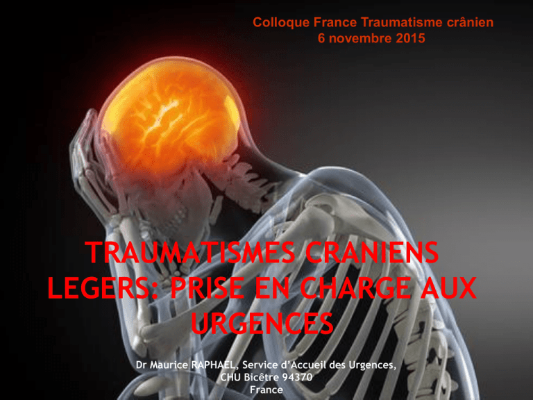 Colloque France Traumatisme crânien 6 novembre 2015 TRAUMATISMES CRANIENS LEGERS: PRISE EN CHARGE AUX URGENCES Dr Maurice RAPHAEL, Service d’Accueil des Urgences, CHU Bicêtre 94370 France Traumatisme crânien Fréquence élevée Absence de corrélation Clinico-lésionnelle formelle Retentissement Psycho-socio-affectif Une situation particulière Qui complique la démarche Diagnostique de l’urgentiste DE QUOI PARLE T-ON? • Un traumatisme crânien peut résulter d’un choc direct sur un crâne immobile, la face ou le cou ou survenir indirectement lors d’une secousse de la masse encéphalique, consécutive à une brusque accélération/décélération, rotation ou lors d’un blast. • Le qualificatif léger s’applique par convention pour les patients ayant un score de Glasgow compris entre 13 et 15, mesuré dans les 30 minutes suivant le traumatisme. • La quasi totalité des TC vus aux urgences ont un score de Glasgow à 15. Les scores < 14 sont orientés directement vers les réveils DE QUOI PARLE T-ON?(2) Quelque soit le mécanisme, l’énergie cinétique délivrée est à même de générer des lésions cérébrales de différentes natures et d’importance variable. Jusqu’à 8% des traumatismes crâniens légers auraient une lésion décelable sur l’imagerie ; contusion cérébrale, hémorragie sous arachnoïdienne, 1% sont opérés hématome sous dural ou intra 30% auraient des symptômes cérébral. persistants à 3 mois 15% à un an Coût direct et indirect au USA annuellement: 60 000 milliards $ DE QUOI PARLE T-ON?(3) • A la suite d’un TCL, un patient peut présenter des altérations transitoires des fonctions neurologiques, spontanément résolutives en quelques minutes à quelques heures, sans qu’aucune lésion ne soit détectable en imagerie. • On parle alors de commotion cérébrale. L’évolution est le plus souvent favorable, mais des troubles cognitifs invalidants peuvent perdurer. Ces symptômes seraient dus à des lésions axonales de cisaillement, responsables d’un dysfonctionnement métabolique transitoire impactant l’hémodynamique cérébrale et son autorégulation. • Une commotion cérébrale ne résulte pas systématiquement d’un choc direct sur la tête, mais peut résulter d’un impact sur un autre endroit du corps. L’énergie cinétique transmise à l’encéphale peut avoir les mêmes conséquences (coup du lapin ou whiplash par exemple). COMMOTION CEREBRALE • La lésion fantôme • Des troubles cognitifs potentiellement invalidant • Indépendant de la perte de connaissance • Parfois sans aucun symptôme clinique > N’est pratiquement jamais le motif de recours; il faut rechercher signes UNE SITUATION TRES FREQUENTE • 155 000 traumatismes crâniens annuellement en France • Ages moyens : 27 ans pour l’homme, 32 ans pour la femme • 4 causes principales: chutes, AVP, choc non intentionnel dont agressions et accidents sportifs LE SPORT: UN MODELE D’EXPERIENCE • 300 000 TCL/an aux Etats-Unis • 70% des footballeurs • 40% des hockeyeurs au Canada: 4 joueurs sur 5 ne reconnaissent pas les conséquences du TCL malgré la présence de symptômes • 35% des skieurs • Mais aussi rugby, boxe, football • Recrutement du week-end aux urgences TCL ET SPORT • On estime que 20% des athlètes pratiquant ces sports auront au moins un TCL durant une saison. • Chez les jeunes pratiquants en milieu scolaire et amateur, la fréquence des TCL est très certainement sous estimée. Elle varie de 5 à 45% selon qu’il s’agisse d’une déclaration officielle ou de confidence de joueurs. • Aux Etats-Unis et au Canada, chez les 8-19 ans, 50% des TCL sont dus à la pratique sportive. La répétition des TCL au cours de match le weekend, non suivie de consultation, expose des complications potentiellement invalidantes LES MILITAIRES ENGAGES DANS DES CONFLITS • Aux USA, 200 000 soldats engagés en Afghanistan et en Iraq ont été victimes de TCL • 30% souffrent de post concussion syndrome MAIS COMBIEN DANS LA POPULATION DES CONSULTANTS AUX URGENCES? DEUX ENJEUX MAJEURS POUR L’URGENTISTE • Ne pas méconnaître une lésion neurochirurgicale: rare mais grave • Dépister les complications cognitives séquellaires: fréquentes mais ignorées EVALUATION INITIALE Anamnèse Intoxication, anticoagulant? Signes de gravité Glasgow Examen physique Examen neurologique Amnésie post traumatique Symptomatologie ANAMNESE Cinétique du choc +++ Perte de connaissance? Terrain: intoxication? AVK? Convulsions post traumatiques? PERTE DE CONNAISSANCE Considérée comme un facteur déterminant de la prise en charge Manque 1 fois sur 2 en cas de lésion vue au TDM Compatible avec un TC léger jusqu’à 30’ Accroît le risque de complication intracrânienne de 4 fois Isolement n’est pas prédictive de gravité Falimirski ME, Gonzalez R, Rodriguez A et al. The need for head computed tomography in patients sustaining loss of consciousness after mild head injury. J Trauma 2003; 55:1-6 SCORE DE GLASGOW Corrélation formelle entre le GCS et la gravité La probabilité de lésion double lorsque le score passe de 15 à 14 et quadruple à 13 3 à 17% de lésions et jusqu’à 3,3% d’intervention avec un Glasgow à 15 L’évolution du score a beaucoup plus de valeur qu’une mesure initiale isolée AMNESIE POST TRAUMATIQUE Durée corrélée à la gravité des lésions et aux séquelles Une lésion est plus fréquente en cas de troubles de la mémoire (18% vs 5%) TRAUMATISME CRANIEN AMNESIE POST TRAUMATIQUE GLASGOW GRAVE >24 heures 3à8 MOYEN 30 min à 24 heures 9 à 12 LEGER < 20-30 min 13 à 15 SYMPTOMATOLOGIE Les signes régulièrement retrouvés sont: Céphalées Nausées Vomissements vertiges Isolément aucun d’entre eux n’est prédictif de lésion intracrânienne CE QU’IL FAUT RECHERCHER • Les symptômes principaux d’une commotion cérébrale sont une confusion et des troubles mnésiques antérogrades ou rétrogrades.