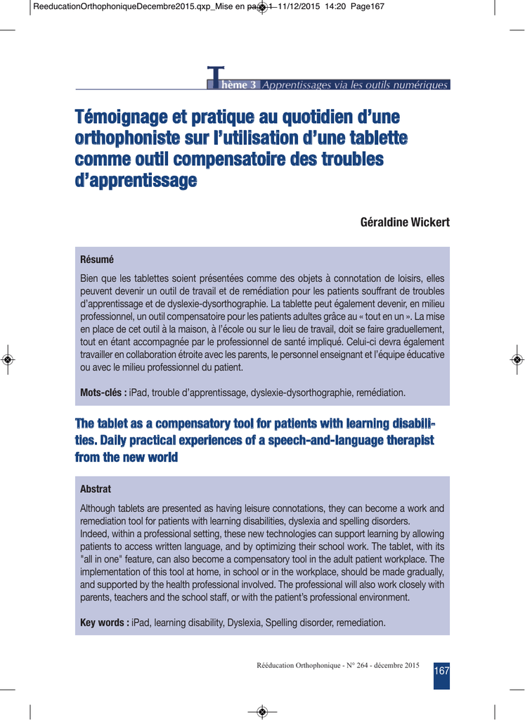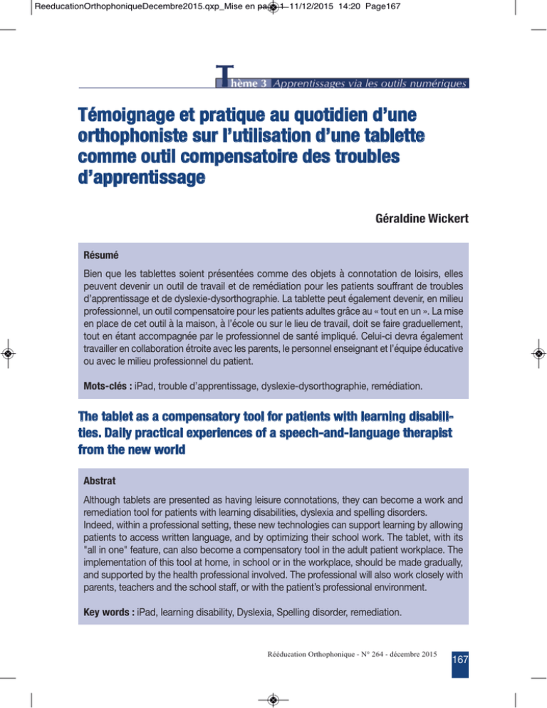 ReeducationOrthophoniqueDecembre2015.qxp_Mise en page 1 11/12/2015 14:20 Page167 Témoignage et pratique au quotidien d’une orthophoniste sur l’utilisation d’une tablette comme outil compensatoire des troubles d’apprentissage Géraldine Wickert Résumé #Y[X\DQ[\S[W\ZVGS[ZZ[W\WUY[XZ\OTJW[XZJ[W\PUMM[\R[W\UG5[ZW\=\PUXXUZVZYUX\R[\SUYWYTWH\[SS[W O[QI[XZ\R[I[XYT\QX\UQZYS\R[\ZTVIVYS\[Z\R[\T[MJRYVZYUX\OUQT\S[W\OVZY[XZW\WUQLLTVXZ\R[\ZTUQGS[W RBVOOT[XZYWWVK[\[Z\R[\RFWS[@Y[ARFWUTZNUKTVONY[E\>V\ZVGS[ZZ[\O[QZ\JKVS[M[XZ\R[I[XYTH\[X\MYSY[Q OTUL[WWYUXX[SH\QX\UQZYS\PUMO[XWVZUYT[\OUQT\S[W\OVZY[XZW\VRQSZ[W\KTP[\VQ\\ZUQZ\[X\QX\E\>V\MYW[ [X\OSVP[\R[\P[Z\UQZYS\=\SV\MVYWUXH\=\SBJPUS[\UQ\WQT\S[\SY[Q\R[\ZTVIVYSH\RUYZ\W[\LVYT[\KTVRQ[SS[M[XZH ZUQZ\[X\JZVXZ\VPPUMOVKXJ[\OVT\S[\OTUL[WWYUXX[S\R[\WVXZJ\YMOSYDQJE\;[SQYAPY\R[ITV\JKVS[M[XZ ZTVIVYSS[T\[X\PUSSVGUTVZYUX\JZTUYZ[\VI[P\S[W\OVT[XZWH\S[\O[TWUXX[S\[XW[YKXVXZ\[Z\SBJDQYO[\JRQPVZYI[ UQ\VI[P\S[\MYSY[Q\OTUL[WWYUXX[S\RQ\OVZY[XZE Mots-clés : Y7VRH\ZTUQGS[\RBVOOT[XZYWWVK[H\RFWS[@Y[ARFWUTZNUKTVONY[H\T[MJRYVZYUXE The tablet as a compensatory tool for patients with learning disabilities. Daily practical experiences of a speech-and-language therapist from the new world Abstrat 8SZNUQKN\ZVGS[ZW\VT[\OT[W[XZ[R\VW\NVIYXK\S[YWQT[\PUXXUZVZYUXWH\ZN[F\PVX\G[PUM[\V\CUT?\VXR T[M[RYVZYUX\ZUUS\LUT\OVZY[XZW\CYZN\S[VTXYXK\RYWVGYSYZY[WH\RFWS[@YV\VXR\WO[SSYXK\RYWUTR[TWE 4XR[[RH\CYZNYX\V\OTUL[WWYUXVS\W[ZZYXKH\ZN[W[\X[C\Z[PNXUSUKY[W\PVX\WQOOUTZ\S[VTXYXK\GF\VSSUCYXK OVZY[XZW\ZU\VPP[WW\CTYZZ[X\SVXKQVK[H\VXR\GF\UOZYMY-YXK\ZN[YT\WPNUUS\CUT?E\<N[\ZVGS[ZH\CYZN\YZW VSS\YX\UX[\L[VZQT[H\PVX\VSWU\G[PUM[\V\PUMO[XWVZUTF\ZUUS\YX\ZN[\VRQSZ\OVZY[XZ\CUT?OSVP[E\<N[ YMOS[M[XZVZYUX\UL\ZNYW\ZUUS\VZ\NUM[H\YX\WPNUUS\UT\YX\ZN[\CUT?OSVP[H\WNUQSR\G[\MVR[\KTVRQVSSFH VXR\WQOOUTZ[R\GF\ZN[\N[VSZN\OTUL[WWYUXVS\YXIUSI[RE\<N[\OTUL[WWYUXVS\CYSS\VSWU\CUT?\PSUW[SF\CYZN OVT[XZWH\Z[VPN[TW\VXR\ZN[\WPNUUS\WZVLLH\UT\CYZN\ZN[\OVZY[XZBW\OTUL[WWYUXVS\[XIYTUXM[XZE\ Key words : Y7VRH\S[VTXYXK\RYWVGYSYZFH\3FWS[@YVH\:O[SSYXK\RYWUTR[TH\T[M[RYVZYUXE Rééducation Orthophonique - N° 264 - décembre 2015 )] ReeducationOrthophoniqueDecembre2015.qxp_Mise en page 1 11/12/2015 14:20 Page168 T hème 3 Apprentissages via les outils numériques Géraldine WICkERT Orthophoniste 65 rue du Patrimoine Gatineau, QC J9H 3P1 Courriel : [email protected] Illustration de la citation d’Albert Einstein : nos patients dyslexiques, dysorthographiques ou présentant des troubles d’apprentissage vivent régulièrement en salle de classe des situations insurmontables pour eux, développant chez eux un sentiment d’incompétence. Historique d’une découverte Les aides technologiques et logicielles utilisables par nos patients dyslexiquesdysorthographiques (DL-DO, par la suite) sont de plus en plus accessibles, que ce soit par les familles, le milieu scolaire ou professionnel. C’est en m’exilant au Canada, il y a plus de vingt ans1, que j’ai découvert que le concept d’outil compensatoire venant palier un trouble, pouvait s’appliquer aux troubles dyslexiques. L’idée de permettre au patient d’accéder à l’autonomie, ou 1. Je remercie Agnès Witko pour sa relecture et pour nos échanges me permettant de vous livrer ma réflexion et mes découvertes autour de l’Ipad. ) ReeducationOrthophoniqueDecembre2015.qxp_Mise en page 1 11/12/2015 14:21 Page169 mieux, à la performance scolaire ou professionnelle à la hauteur de ses compétences, et ce malgré les troubles, fut révélatrice pour moi. Comme le ferait une ergothérapeute pour des troubles physiques, j’ai appris à inclure des recommandations technologiques dans mes comptes rendus de bilan, et à travailler sur deux modalités : la rééducation classique associée à la réadaptation fonctionnelle. Mon chemin professionnel m’a menée à travailler en milieu franco-français, dans des Lycées dépendant du Ministère de l’Éducation de France, rattachés à une académie française. Le succès obtenu par mes jeunes patients jusqu’au baccalauréat, grâce à la mise en place de ces outils, dans le cadre d’un PAI2 ou d’un PPS3 (maintenant nommé PAP4) m’a convaincue de la nécessité première d’outiller ces jeunes dès le début de la prise en charge, parallèlement à la rééducation. Étant donné la structure des soins de santé dans mon nouveau pays, et la difficulté d’accès aux soins orthophoniques pour les patients par rapport à la France, j’ai dû développer des connaissances au sujet de ces outils. L’objectif principal était de les proposer très rapidement en début de prise en charge, tout en soutenant la mise en place au foyer, mais aussi en milieu scolaire, et notamment pour les études et les examens. Le tout premier outil compensatoire dans mon escarcelle d’orthophoniste, il y a vingt ans, a été « Dragon naturally speaking », une dictée vocale permettant d’écrire en parlant, sans toucher au clavier. Cet outil était considéré comme extraordinaire pour les patients dysorthographiques à l’époque, alors qu’il était « lourd », sur des ordinateurs peu puissants. De plus, il exigeait un entraînement de l’outil en lisant à haute voix de longs textes pour calibrer le logiciel créé en premier lieu pour le secrétariat, et non pour les personnes ayant des troubles d’apprentissage. En ces temps (pas tellement) éloignés, peu d’ordinateurs portables étaient accessibles. Les environnements de travail étaient très statiques et peu pratiques dans le cadre d’un Collège ou d’un Lycée. La technologie évoluant très vite, les outils ont suivi ce développement dans le sens de la convivialité, de l’amélioration de la performance, de la personnalisation de plus en plus pointue. Au fil des années, nous avons vu fleurir des synthèses vocales, des prédicteurs de mots, des dictionnaires interactifs, des correcteurs d’orthographe performants, des livres audio, des dictées vocales avec un entraînement simplifié, e