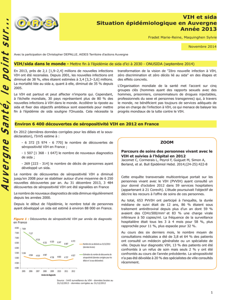Auvergne Santé, le point sur... VIH et sida Situation épidémiologique en Auvergne Année 2013 Fradet Marie-Reine, Maquinghen Sylvie Novembre 2014 Avec la participation de Christopher DEPALLE, AIDES Territoire d'actions Auvergne VIH/sida dans le monde - Mettre fin à l’épidémie de sida d’ici à 2030 - ONUSIDA (septembre 2014) En 2013, près de 2,1 [1,9–2,4] millions de nouvelles infections VIH ont été recensées. Depuis 2001, les nouvelles infections ont diminué de 38 %, elles étaient estimées à 3,4 [3,3–3,6] millions. La mortalité liée au sida a, quant à elle, diminué de 35 % depuis 2005. Le VIH est partout et peut affecter n’importe qui. Cependant, à l’échelle mondiale, 30 pays représentent plus de 80 % des nouvelles infections à VIH dans le monde. Accélérer la riposte au sida et fixer des objectifs ambitieux sont essentiels pour mettre fin à l’épidémie de sida souligne l'Onusida. Cela nécessite la transformation de la vision de "Zéro nouvelle infection à VIH, zéro discrimination et zéro décès lié au sida" en des étapes et des effets concrets. L'Organisation mondiale de la santé met l'accent sur cinq groupes clés (hommes ayant des rapports sexuels avec des hommes, prisonniers, consommateurs de drogues injectables, professionnels du sexe et personnes transgenres) qui, à travers le monde, ne bénéficient pas toujours de services adéquats de prise en charge de l’infection à VIH, ce qui menace de balayer les progrès mondiaux de la lutte contre le VIH. Environ 6 400 découvertes de séropositivité VIH en 2012 en France En 2012 (dernières données corrigées pour les délais et la sousdéclaration), l'InVS estime à : - 6 372 [5 974 - 6 770] le nombre de découvertes de séropositivité VIH en France ; - 1 507 [1 368 - 1 647] le nombre de nouveaux diagnostics de sida ; - 269 [223 - 314] le nombre de décès de personnes ayant développé un sida. Le nombre de découvertes de séropositivité VIH a diminué jusqu'en 2008 pour se stabiliser autour d'une moyenne de 6 250 nouvelles découvertes par an. Au 31 décembre 2013, 3 484 découvertes de séropositivité VIH ont été signalées en France Le nombre de nouveaux diagnostics de sida diminue régulièrement depuis les années 2000. Depuis le début de l'épidémie, le nombre total de personnes ayant développé un sida est estimé à environ 88 000 en France. Figure 1 : Découvertes de séropositivité VIH par année de diagnostic en France 8 000 7 604 7 500 7 127 7 000 6 516 6 500 6 221 6 320 6 247 4 738 4 803 4 737 2009 2010 2011 6 087 6 372 6 000 5 500 5 166 5 000 4 964 4 919 2006 2007 4 987 4 927 4 500 Nombre de cas déclarés au 31/12/2013 (données brutes) Estimation du nombre de découvertes de séropositivité (données corrigées pour les délais et la sous-déclaration) ZOOM Parcours de soins des personnes vivant avec le VIH et suivies à l'hôpital en 2012 Jacomet C, Cormerais L, Peyrol F, Guiguet M, Simon A, Berland, et al. Bull Epidémiol Hebd. 2014;(24-25):422-8 Cette enquête transversale multicentrique portait sur les personnes vivant avec le VIH (PVVIH) ayant consulté un jour donné d'octobre 2012 dans 59 services hospitaliers (appartenant à 21 Corevih). L'étude poursuivait l'objectif de décrire les recours à l'offre de soins de ces personnes. Au total, 653 PVVIH ont participé à l'enquête, la durée médiane de suivi était de 12 ans, 86 % étaient sous traitement antirétroviral depuis plus d'un an dont 59 % avaient des CD4≥500/mm3 et 83 % une charge virale inférieure à 50 copies/ml. La fréquence de la surveillance hospitalière était tous les 3 à 4 mois pour 58 %, plus rapprochée pour 11 %, plus espacée pour 32 %. Au cours des six derniers mois, le nombre moyen de consultations médicales a été de 3,8 et 64 % des patients ont consulté un médecin généraliste ou un spécialiste de ville. Depuis leur diagnostic VIH, 13 % des patients ont été confrontés à un refus de soin mais seuls 2 % y ont été confrontés au cours de l'année précédente. La séropositivité n'a pas été dévoilée à 20 % des spécialistes de ville consultés récemment. 4 000 2005 2008 2012 Année de diagnostic Source : InVS surveillance du VIH - données brutes au 31/12/2013 - données corrigées au 31/12/2012 1 Auvergne : 447 personnes diagnostiquées séropositives VIH depuis 2003 En 2012, 47 personnes, domiciliées en Auvergne, ont été déclarées séropositives VIH en 2012 et 20 personnes en 2013 (tableau 1). Parmi ces découvertes réalisées en 2012 et 2013, 62 % sont domiciliées dans le département du Puy-de-Dôme (66 % sur l'ensemble de la période). Sexe, âge et pays de naissance En 2013, comme sur l'ensemble de la période, trois découvertes de séropositivité sur 4 concernent un homme. Quel que soit le sexe, la majorité des personnes qui découvrent leur séropositivité VIH sont trentenaires (Figure 2). Sur l'ensemble de la période, 9 personnes avaient moins de 20 ans au moment de la découverte de leur séropositivité VIH et 22 avaient plus de 59 ans (dont 4 avaient 70 ans ou plus). Chez les femmes, 41 % des découvertes ont concerné des femmes nées en Afrique subsaharienne et 46 % des femmes nées en France. Il semble toutefois que cette répartition se modifie et que la part de femmes nées en Afrique subsaharienne diminue depuis 2010. Chez les hommes, ce sont 87 % des personnes découvrant leur séropositivité VIH qui sont nées en France. Tableau 1 : Découvertes de séropositivité VIH par département de domicile et par année de diagnostic - Auvergne 2009 2010 2012* 2013* Allier 8 8 12 7 5 Cantal 3 0 1 3 0 Haute-Loire 5 3 2 8 2 Puy-de-Dôme 36 18 20 29 13 Auvergne 52 29 35 47 20 Figure 2: Répartition des découvertes de séropositivité VIH selon l'âge et le sexe sur la période 2003-2013 - Auvergne 40 35 30 25 20 Hommes 15 Femmes 10 5 0 10 à 19 20 à 29 Mode de contamination probable Chez les femmes, dans 94 % des découvertes de s