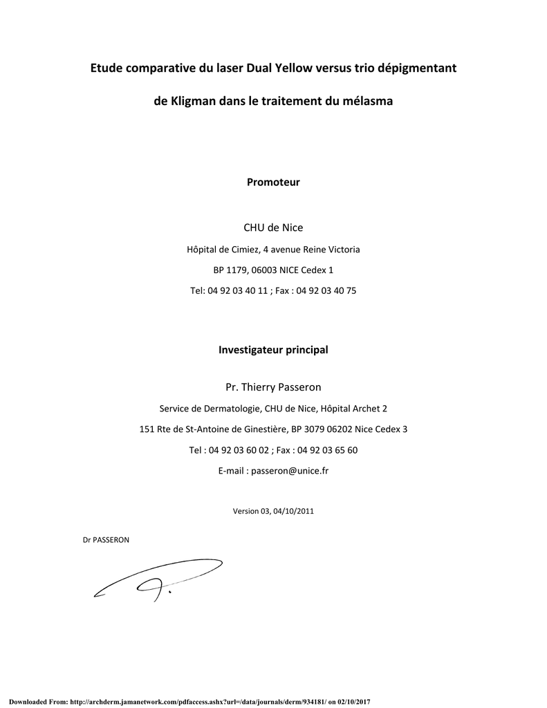 Etude comparative du laser Dual Yellow versus trio dépigmentant de Kligman dans le traitement du mélasma Promoteur CHU de Nice Hôpital de Cimiez, 4 avenue Reine Victoria BP 1179, 06003 NICE Cedex 1 Tel: 04 92 03 40 11 ; Fax : 04 92 03 40 75 Investigateur principal Pr. Thierry Passeron Service de Dermatologie, CHU de Nice, Hôpital Archet 2 151 Rte de St‐Antoine de Ginestière, BP 3079 06202 Nice Cedex 3 Tel : 04 92 03 60 02 ; Fax : 04 92 03 65 60 E‐mail : [email protected] Version 03, 04/10/2011 Dr PASSERON Downloaded From: http://archderm.jamanetwork.com/pdfaccess.ashx?url=/data/journals/derm/934181/ on 02/10/2017 Sommaire (reprendre numérotation) Résumé 1/ Rationnel de l’étude 2/ Objectifs de l’étude 3/ Critères d’évaluation 4/ Type d’étude 5/ Sélection des patients 6/ Balance bénéfice / risque 7/ Critère de succès 8/ Nombre de sujets nécessaires 9/ Déroulement de l’étude 10/ Traitement 11/ Effets indésirables 12/ Randomisation 13/ Recueil des données 14/ Analyse statistique 15/ Faisabilité 16/ Modalités administratives 16/ Références Annexes 3 4 8 8 9 9 10 11 11 12 13 14 16 16 17 18 19 24 28 Downloaded From: http://archderm.jamanetwork.com/pdfaccess.ashx?url=/data/journals/derm/934181/ on 02/10/2017 Résumé Rationnel de l’étude : Le mélasma est une dermatose fréquente et de traitement difficile. Les crèmes dépigmentantes restent le traitement de référence mais leur efficacité est inconstante et les récidives quasi constantes à l’arrêt du traitement. Parmi les agents dépigmentant les préparations magistrales associant de l’hydroquinone, de l’acide rétinoïque et un dermocorticoïde (Trio dépigmentant dit de Kligman) sont les plus efficaces et sont considérées comme le traitement de référence. Des données récentes soulignent le rôle de la vascularisation dans le mélasma et une étude récente a montré l’intérêt de cibler cette composante vasculaire par laser à colorant pulsé. Le laser Dual Yellow est un laser argon de dernière génération qui émet une double longueur d’one (une verte à 511nm et une jaune à 578nm). Ce laser permet de cibler à la fois la composante vasculaire mais aussi la composante pigmentaire du mélasma. Une étude préliminaire a montré son efficacité et son excellente tolérance dans le traitement du mélasma. Cette étude nécessite cependant d’être confirmée par une étude comparative versus traitement de référence. Objectif principal et objectifs secondaires : Objectif principal : Comparer dans une étude intra‐patient l’efficacité dans le mélasma du laser Dual Yellow précédé de 1 mois de trio de Kligman par rapport au trio de Kligman en monothérapie pendant 3 mois. Objectifs secondaires : Etudier la fréquence des PPI. Comparer le taux et l’importance des récidives 6 mois après la fin du traitement. Population : Le nombre de patients à inclure dans l’étude a été calculé pour pouvoir mettre en évidence entre les deux traitements une différence de 5 points sur le score de MASI avec une puissance de 80% au risque α=0.05 en situation bilatérale. Le nombre de patients à inclure est donc, selon les termes de notre hypothèse, de 20 par groupe de traitement pour un essai en groupes parallèles. Dans le design prévu pour cette étude, « split face design », le sujet est son propre témoin. Durée de l’étude : Début de l’étude Décembre 2011. Durée d’inclusion 6 mois. Durée de l’étude 9 mois (visite de pré‐inclusion ; visite d’inclusion et de début d’application des crèmes (V0) ; traitement pendant 4 mois. Visites de suivi à 1, 3 et 6 mois. Fin de l’étude Février 2013. Analyse des résultats Mars 2013. Lieu de l’étude : Etude monocentrique dans le service de Dermatologie du CHU de Nice (Pr. JP Ortonne). Méthodologie : Etude prospective contrôlée comparative en intra‐individuel (« split face ») avec évaluation en aveugle. Critères d’inclusion : Mélasma de diagnostic clinique ; Age de 18 à 75 ans ; Phototypes 1 à 4 ; Affiliation au régime de la Sécurité Sociale ; Consentement éclairé signé par le patient Critères de non inclusion : Patientes enceintes ou allaitante ; Phototype 5 ; Intolérance ou allergie aux composés du trio de Kligman stabilisé ; Refus d’utiliser un écran solaire d’indice 50+ pendant toute la durée de l’étude en cas d’exposition solaire Déroulement de l’étude : Tous les patients seront traités par trio de Kligman à raison de 1 application le soir seulement les 4ères semaines pour le côté laser et pendant 3 mois du côté crème. Après 4 semaines de traitement le côté du visage tiré au sort pour être traité par laser Dual Yellow recevra 4 séances (les 2 premières à 2 semaines d’intervalle et les autres à 3 semaines d’intervalle). Toutes les patients devront appliquer un écran solaire indice 50+ pendant toute la durée de l’étude. Critères d’évaluation : L’évaluation sera faite en aveugle par un observateur indépendant sur photographies standardisées en lumière directe et UV. Le score de MASI (score validé d’évaluation des mélasmas sous traitements) sera calculé et les éventuels effets secondaires notés lors de chaque visite. Une évaluation par microscopie confocale in vivo sera également réalisée. Enfin une évaluation subjective par les patients sera effectuée à la fin de l’étude. Analyse statistique : Les données issues de l’étude seront analysées avec l’aide du Dr Fontas (Recherche Médicale, Hôpital de Cimiez, CHU de Nice). Downloaded From: http://archderm.jamanetwork.com/pdfaccess.ashx?url=/data/journals/derm/934181/ on 02/10/2017 1/ Rationnel de l’étude Le mélasma est une hypermélanose de la face. Il est encore appelé chloasma ou masque de grossesse 1 . Bien que décrit chez l’homme, la femme est très préférentiellement atteinte. Les asiatiques et les femmes d’origine ibériques sont les plu