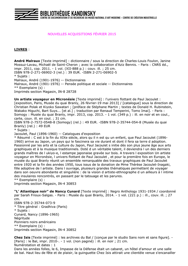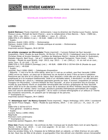 NOUVELLES ACQUISITIONS FÉVRIER 2015 LIVRES : André Malraux [Texte imprimé] : dictionnaire / sous la direction de Charles-Louis Foulon, Janine Mossuz-Lavau, Michaël de Saint-Cheron ; avec la collaboration d'Aziz Bennis. - Paris : CNRS éd., impr. 2011, cop. 2011. - 1 vol. (XII-888 p.) : couv. ill. ; 25 cm. ISBN 978-2-271-06902-3 (rel.) : 39 EUR. -ISBN 2-271-06902-5 * Sujets : Malraux, André (1901-1976) -- Dictionnaires Malraux, André (1901-1976) -- Pensée politique et sociale -- Dictionnaires ** Exemplaire (s) : Imprimés section Magasin, IN-8 28728 Un artiste voyageur en Micronésie [Texte imprimé] : l'univers flottant de Paul Jacoulet : [exposition, Paris, Musée du quai Branly, 26 février-19 mai 2013] / [catalogue] sous la direction de Christian Polak et Kiyoko Sawatari ; [préface de Stéphane Martin ; textes de Donald H. Rubinstein, Wakako Higuchi, Bart Suys... [et al.] ; traduction par Renaud Temperini, Tomo Imai]. - Paris : Somogy : Musée du quai Branly, impr. 2013, cop. 2013. - 1 vol. (349 p.) : ill. en noir et en coul., carte, couv. ill. en coul. ; 31 cm. ISBN 978-2-7572-0548-8 (Somogy) (rel.) : 49 EUR. -ISBN 978-2-35744-054-8 (Musée du quai Branly) (rel.) : 49 EUR * Sujets : Jacoulet, Paul (1896-1960) -- Catalogues d'exposition * Résumé : C est à la fin du XIXe siècle, alors qu il n est qu un enfant, que Paul Jacoulet (18961960) arrive au Japon, un pays qui le fascinera sa vie durant et dont il fera sa terre d adoption. Passionné par les arts et la culture du Japon, Paul Jacoulet s initie dès son plus jeune âge aux arts graphiques et à la musique traditionnels. Doté d un véritable talent, il deviendra l un des derniers grands maîtres de l ukiyo-e, l estampe japonaise gravée sur bois. A travers l exposition Un artiste voyageur en Micronésie, l univers flottant de Paul Jacoulet , et pour la première fois en Europe, le musée du quai Branly réunit un ensemble remarquable des travaux graphiques de Paul Jacoulet entre 1920 et la fin des années 1950, tous issus de la donation de Mme Thérèse Jacoulet-Inagaki, fille adoptive de l artiste. Dans l ouvrage, plusieurs grandes thématiques permettent de voyager dans son oeuvre abondante et singulière : de la vision d artiste-ethnographe d un ailleurs à l intime des insulaires rencontrés, en passant par le tatouage et les parures. ** Exemplaire (s) : Imprimés section Magasin, IN-4 30853 "L' Atlantique noir" de Nancy Cunard [Texte imprimé] : Negro Anthology 1931-1934 / coordonné par Sarah Frioux-Salgas. - Paris : Musée du quai Branly, 2014. - 1 vol. (221 p.) : ill., couv. ill. ; 27 cm. ISBN 978-2-35744-073-9 * Titre général : Gradhiva (Paris) * Sujets : Cunard, Nancy (1896-1965) Négritude Pionniers noirs américains ** Exemplaire (s) : Imprimés section Magasin, IN-4 30852 Chez Isis [Texte imprimé] : les archives du Bal / [conçue par le studio Sans nom et sans figure]. [Paris] : le Bal, impr. 2010-. - 1 vol. (non paginé) : ill. en noir ; 21 cm. Numérotation et dates : 1 Dans les années folles, le 6, Impasse de la Défense était un cabaret, un hôtel d'amour et une salle de bal. Haut lieu de fête et de plaisir, la guinguette Chez Isis attirait une clientèle venue s'encanailler aux portes de Paris. Malgré nos recherches, nous n'avons retrouvé aucune photographie datant de cette période. Nous avons donc décidé de collectionner des photographies originales d autres bals, cabarets et bordels de la même époque à Paris et dans d'autres villes. Ces 'vraies/fausses' archives représentent notre projection imaginaire de l'histoire du lieu. La collection des archives a ensuite été vendue aux enchères le 30 juin 2010 lors d une grande soirée au BAL et a fait l'objet d'une publication (note de l'éditeur). ** Exemplaire (s) : Imprimés section Magasin, IN-8 28275 Imprimés section Réserve, RLPF 11851 Cinéma muséum : le musée d'après le cinéma : [Brian De Palma, Ryan Gander, Jean-Luc Godard, Dominique Gonzalez-Foerster, Fabrice Lauterjung, Mark Lewis, André Malraux, Chris Marker, Tony Smith] / textes de Bruno Nassim Aboudrar, Teresa Castro, Térésa Faucon... [et al.] ; sous la direction de Barbara Le Maître et Jennifer Verraes. - Saint-Denis : Presses Universitaires de Vincennes, impr. 2013, cop. 2013. - 1 vol. (195 p.) : ill. en noir et en coul., plans, couv. ill. en coul. ; 22 cm. (Esthétiques hors cadre, 1248-4679) ISBN 978-2-84292-372-3 (br.) : 21 EUR * Sujets : Scénographie d'exposition Musées et cinéma Art vidéo * Résumé : "Les oeuvres de Brian De Palma, Ryan Gander, Jean-Luc Godard, Dominique GonzalezFoerster, Fabrice Lauterjung, Mark Lewis, André Malraux, Chris Marker, Tony Smith invitent à méditer le caractère imaginaire du patrimoine cinématographique, et du musée aussi bien. Il s'agit de se demander ce que le cinéma fait au musée, c'est-à-dire ce qu'il y fait et ce qu'il lui fait - et, réciproquement, ce que le musée fait au cinéma." (4e de couv.). ** Exemplaire (s) : Imprimés section Magasin, IN-8 28691 Cy Twombly [Texte imprimé] : drawings : cat. rais. vol. 3, 1961-1963 / [edited by] Nicola del Roscio. - München : Schimer/Mosel ; [New York] : Gagosian Gallery, cop. 2013. - 1 vol. (215 p.) : ill. en coul. ; 35 cm. Notes biographiques p. 210-215. ISBN 978-3-8296-0487-1 (rel. avec jaquette). -ISBN 3-8296-0487-4 (rel. avec jaquette) * Sujets : Twombly, Cy (1928-2011) -- Oeuvres -- Catalogues raisonnés Dessin -- Etats-Unis -- 1945-1970 -- Catalogues raisonnés ** Exemplaire (s) : Imprimés section Salle, CAT.RAI. TWOMBLY 5 vol.3 Cy Twombly [Texte imprimé] : catalogue raisonné of the paintings. Volume VI, 2008-2011 / edited by Heiner Bastian. - Munchen : Schirmer/Mosel, 2014. - 1 vol. (184 p.) : Ill. en noir et en coul., jaquette ill. en coul., portr. ; 32 cm. Notes biographiques p.114-127. ISBN 978-3-8296-0688-2 (rel. avec jaquette). -ISBN 3-8296-0688-5 (rel. avec jaquette) * Sujets : Twombly, Cy (1928-2011) -- Catalogues raisonnés Peinture -- Etats-Unis --