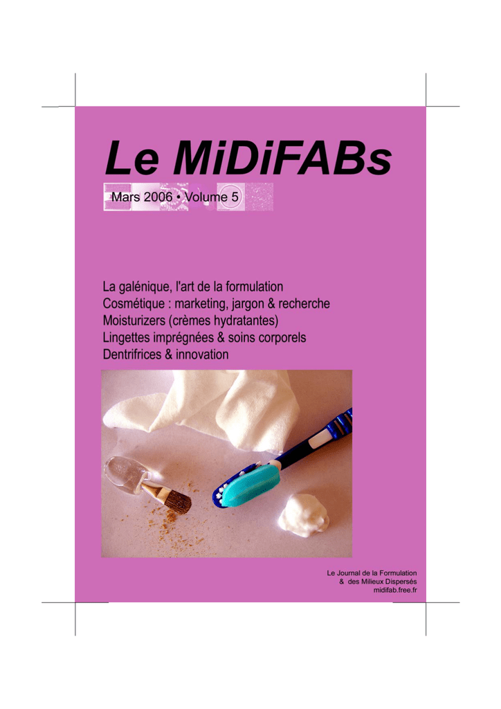Le MiDiFABs Editeur : Tanja Pott Editeurs associés : Philippe Méléard, Marina Jolivet, Hélène Bouvrais Pour toute information concernant Le MiDiFABs, adressez-vous à : [email protected] sujet : Le MiDiFABs Le MiDiFABs est un journal de vulgarisation scientifique pour chimistes et physico-chimistes qui publie des articles en liaison avec les milieux dispersés, les colloïdes, la matière molle et la formulation. Le but clairement affiché de ce journal est de faire plus largement connaître les aspects fascinants de ces milieux complexes, en allant de la physico-chimie pure et dure aux applications industrielles et aux produits de grande consommation. Chimistes et physico-chimistes, étudiants et chercheurs, peuvent ainsi trouver une foultitude d'informations relativement basiques ou bien un peu insolites et surtout en libre accès. Dans cette optique, Le MiDiFABs publie des revues et a priori pas de travaux originaux de recherche. L'éditeur détermine si un manuscrit soumis pour publication entre dans le cadre du journal. Un comité de lecture décide ensuite de la publication des manuscrits (pour plus de détails, voir http://midifab.free.fr/journal.htm). Le MiDiFABs est un "open access journal " publié "on-line". Le MiDiFABs est publié deux fois par an, des exemplaires papier sont tirés en très petit nombre, essentiellement pour que les auteurs en disposent. Copyright Chaque individu peut faire une unique copie de l'un des articles de Le MiDiFABs pour ses besoins personnels et privés. Les enseignants du public peuvent faire usage des copies d'articles dans le cadre de leurs enseignements, en mentionnant explicitement la source du document. La reproduction pour d'autres usages nécessite la permission des détenteurs du copyright (auteurs et Le MiDiFABs, plus éventuellement une institution d'enseignement supérieure). Editorial Voici un numéro bien centré sur le bien-être, que ce soit par rapport à la santé ou la beauté. En effet, les dentifrices (M.-L. Brandy & P. Robert) gardent les dents en bonne santé, mais de jolies dents bien blanches sont aussi une marque de beauté. Argumentaire similaire pour les lingettes dans le contexte des soins corporels (E. Courbon & A. Doron). La cosmétique, qui joue fortement sur les aspects beauté, bien-être et soins, est vue sous deux angles différents, par le marketing et le jargon des campagnes publicitaires (E. Guerrini & A. H e u r t e m a t t e ) et par les soins dermatologiques et la science sur laquelle elle s'appuie (moi-même). Les innovations dans la formulation des anti-douleurs (J. Pommay & H. Bouvrais) se situent très clairement dans le secteur de la santé. Par contre, les propriétés colligatives (P. Méléard) ne font penser, a priori, ni à santé, ni à beauté, mais on y trouve néanmoins quelques mentions en rapport avec la santé. A propos de santé, l'équipe éditoriale remercie très chaleureusement le médecin qui nous a secourus pour soigner les quelques problèmes qu'auteurs, rapporteur et éditeurs ont eu avec les termes médicaux dans le contexte des anti-douleurs. Bien-être, beauté et physico-chimie alors, des choses surprenantes et intéressantes et en plus, une touche d'humour avec les illustrations de Marina, qui adouciront peut-être le lecteur allergique aux équations (pathologie rare mais persistante) de l'article de Philippe ☺ … Tous les curieux des milieux dispersés devraient donc trouver de quoi les amuser. Bonne lecture alors ! Tanja Pott Table des Matières En bref… La galénique, l'art de la formulation Ce qui ne dépend pas de la structure chimique des molécules… Pourquoi la recherche fondamentale ? Industrie cosmétique : Du marketing à la recherche Soins corporels : Essuyez, brossez et consommez ! 3 3 3 4 5-6 6 Contributions libres P. Méléard, Quand les petites tailles font les grands nombres… T. Pott, "Moisturizers" (Hydratants) & Cosmétique - Entre mythe, réalité et controverse T. Pott, La recherche des compagnies cosmétiques sur le stratum corneum 7 7-20 21-43 44-48 Projets Binômés E. Guerrini & A. Heurtematte, Jargon cosmétique J. Pommay & H. Bouvrais, Formulation, administration et libération des anti-douleurs E. Courbon & A. Doron, Les lingettes imprégnées M.-L. Brandy & P. Robert, Les dentifrices 49 49-58 59-74 75-85 87-96 Le MiDiFABs | Vol 5 | Mars 2006 | midifab.free.fr/journal.htm 1 2 Le MiDiFABs | Vol 5 | Mars 2006 | midifab.free.fr/journal.html En bref… La galénique, l'art de la formulation En effet, la définition du terme galénique la plus souvent donnée, c'est ça : la galénique est l'art de la formulation (pharmaceutique, bien entendu). La forme galénique correspond à la forme selon laquelle on prend un médicament (gélule, comprimé, sirop, pommade, patch, aérosol, etc…). C'est le médecin Claudius Galenus de Pergamon (aujourd'hui Bergama en Turquie), mieux connu comme Galen ou encore Galien pour les francophones (131-201), qui a été à l'origine de la galénique. Après son installation à Rome (autour de l'an 162), il devient le médecin de la cour de l'empereur Marcus Aurelius. Galen écrira quelques 500 œuvres concernant la médicine, la philosophie et l'éthique et pratiqua de nombreuses expériences anatomiques (vivisection sur animaux). Son autorité médicale domina la médecine jusqu'au 16e siècle. Aujourd'hui, le Prix Galien, prestigieux prix de renommée internationale, discerne les produits innovants offrant des avantages thérapeutiques par rapport aux traitements existants. Ce prix a été créé en 1969 en France par le pharmacien R. Mehl et a été depuis adopté par de nombreux pays. Passons donc de l'origine du mot galénique à l'art de la formulation. J. Pommay et H. Bouvrais (page 59-74) nous la présente dans le contexte des médicaments anti-douleurs et plus Claudius Galenus de Pergamon (Galen, ≈ 131-201). C'est son nom qui a été retenue pour l'art de la formulation pharmaceutique, la galéniqu