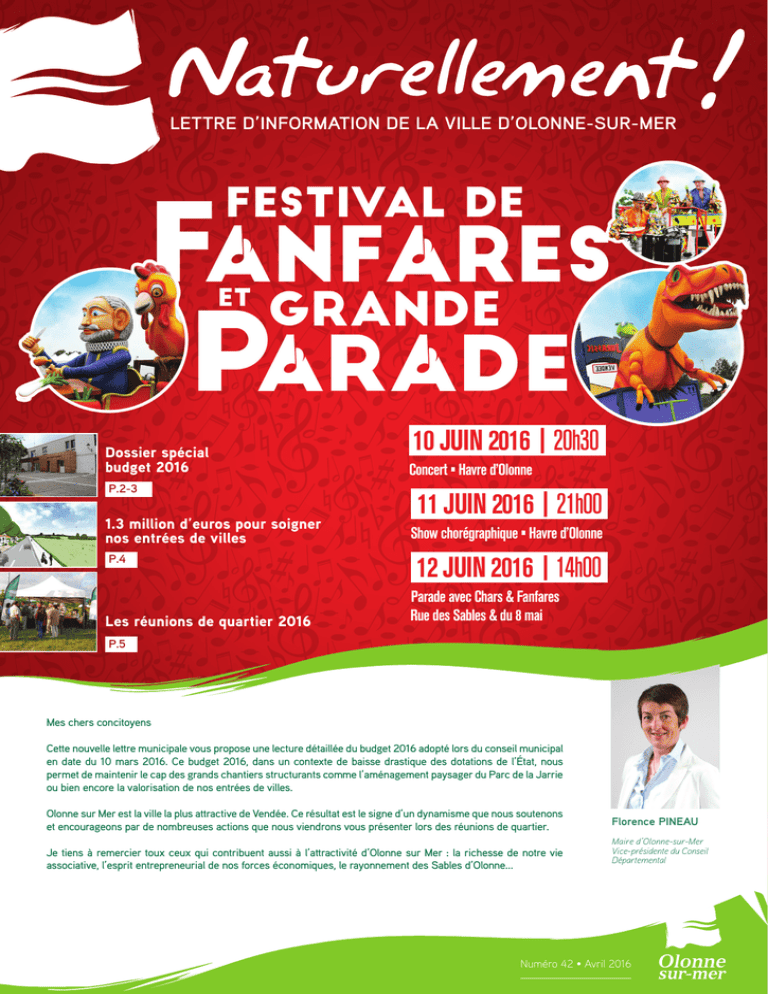 LETTRE D’INFORMATION DE LA VILLE D’OLONNE-SUR-MER Dossier spécial budget 2016 P.2-3 1.3 million d’euros pour soigner nos entrées de villes P.4 Les réunions de quartier 2016 10 JUIN 2016 20h30 Concert • Havre d’Olonne 11 JUIN 2016 21h00 Show chorégraphique • Havre d’Olonne 12 JUIN 2016 14h00 Parade avec Chars & Fanfares Rue des Sables & du 8 mai P.5 Mes chers concitoyens Cette nouvelle lettre municipale vous propose une lecture détaillée du budget 2016 adopté lors du conseil municipal en date du 10 mars 2016. Ce budget 2016, dans un contexte de baisse drastique des dotations de l’État, nous permet de maintenir le cap des grands chantiers structurants comme l’aménagement paysager du Parc de la Jarrie ou bien encore la valorisation de nos entrées de villes. Olonne sur Mer est la ville la plus attractive de Vendée. Ce résultat est le signe d’un dynamisme que nous soutenons et encourageons par de nombreuses actions que nous viendrons vous présenter lors des réunions de quartier. Je tiens à remercier toux ceux qui contribuent aussi à l’attractivité d’Olonne sur Mer : la richesse de notre vie associative, l’esprit entrepreneurial de nos forces économiques, le rayonnement des Sables d’Olonne... Florence PINEAU Maire d’Olonne-sur-Mer Vice-présidente du Conseil Départemental Numéro 42 • Avril 2016 DOSSIER SPÉCIAL : LE BUDGET MUNICIPAL 2016 SECTION DE FONCTIONNEMENT Elle regroupe les dépenses et recettes qui concernent les activités et services «quotidiens» de la ville, ainsi que les dépenses indispensables à son fonctionnement. RECETTES 13,5 MILLIONS D’EUROS Fiscalité directe... En recettes de fonctionnement, marquées par le retrait significatif des dotations de l’État, l’équipe municipal respecte les engagements du «Pacte de Modération Fiscale» pris devant les Olonnais au Printemps 2014 : sur le mandat 2014-2020, l’évolution annuelle moyenne des taux imôts locaux sera limité à environ 1%. Rappelons que cette augmentation a été contenue à 1,1% sur le mandat 2008-2014 (contre 2,1% sur le mandat 2001-2008). TAUX 2015 2016 Taxe d’habitation (TH) 14,56% 14,63% Taxe sur le foncier bâti (TFb) 16,83% 16,98% Taxe sur le foncier non bâti (TFnb) 53,14% 53,14% 8,84 M¤ ...et indirecte • Taxe communale d’électricité (350 000 ¤) • Taxe de séjour (due par les visiteurs qui séjournent à Olonne : 180 000 ¤) • Droits de mutation (550 000 ¤) Le niveau des droits de mutation est fixé par l’État. Leur produit fluctue fortement en fonction du marché immobilier. Les marges de manœuvre financières dont disposent les collectivités locales sont significativement réduites à cause de la réduction drastique et durable des dotations de l’État (-3,67 milliards de DGF en 2015) : cette tendance se traduit à Olonne par une baisse de la dotation globale de fonctionnement supérieure à 223 000¤ par rapport à 2015. Dotations et subventions 2,55 M¤ Autres ressources 2,11 M¤ dont DGF (1 520 868 ¤) • Revenus d’immeubles ou de propriétés loués • Revenus des services SECTION D’INVESTISSEMENT Elle regroupe les dépenses et recettes qui concernent les activités et services «quotidiens» de la ville, ainsi que les dépenses indispensables à son fonctionnement. RECETTES 7,38 MILLIONS D’EUROS Excédent de fonctionnement capitalisé 2,27 M¤ Épargne brute 2016 1,50 M¤ Recettes d’équipement • Fonds de compensation de la TVA • Taxe d’aménagement • Ammortissements d’immobilisations 0,59 M¤ 2 n° 42 - Avril 2016 L’EMPRUNT NOUVEAU 3,02 M¤ DÉPENSES 13,5 MILLIONS D’EUROS Charges à caractère général 3,47 M¤ 1,04 M¤ • Fluides (électricité, gaz, téléphone...) • Fourniture • Maintenance Autres charges de gestion SUR LE TABLEAU DE BORD... au 31 décembre 2015 La bonne gestion d’une ville répond à certains critères chiffrés. Voici ce qui apparaît sur le tableau de bord de la Ville d’Olonne. • Subventions aux associations • Participation scolarité des enfants olonnais • Subvention CCAS 0,38 M¤ Frais financiers (intérêts de la dette) 0,17 M¤ Atténuation de produits Reversement de recettes à des tiers (ex : une partie de la taxe sur l’électricité est reversée au SyDEV) DETTE/HABITANT 5,92 M¤ 1,02 M¤ 1,5 M¤ Charges de personnel Les charges de personnel de la ville d’Olonne sur Mer sont inférieures à la moyenne de la strate des viles dont la population est comprise entre 10 000 et 20 000 habitants. Étalement du coût des dépenses d’investissement sur la durée de leur utilisation. L’ÉPARGNE BRUTE La différence entre recettes et dépenses de fonctionnement constitue ce qu’on appelle l’épargne brute de la ville. Le montant est reversé en section d’investissement où il contribue à financer les investissements. Programme d’investissement de l’année Sur la période 2008 - 2013, la ville d’Olonne-sur-Mer avait investi 36 millions d’euros au service d’Olonne et des Olonnais. Le taux de réalisation moyen des investissements avoisine les 70%, ce qui est bon indicateur, notamment en matière de soutien effectif à l’économie. La ville continue à investir pour Olonne et les Olonnais et à soutenir l’activité économique avec un programme d’équipements et d’acquisitions foncières supérieur à 6,2 M¤ en 2016. Les principaux programmes d’investissement sont : • les restaurants scolaires • le PAVE (Plan de mise en accessibilité de la voirie et des aménagements des espaces publics) pour la mise en conformité des bâtiments • la rue des Amis de la nature • l’aménagement paysager du parc de la Jarrie • la rue du 8 mai 1,11 M¤ contre une dette moyenne/hab pour des villes de la même strate est de 958 euros Amortissement DÉPENSES 7,38 MILLIONS D’EUROS 6,27 M¤ 811 ¤ FRAIS PERSONNEL/DÉPENSES RÉELLES DE FONCTIONNEMENT 393¤/HAB contre 661 euros/hab pour des villes de la même strate RATIO/DETTES/RECETTES R