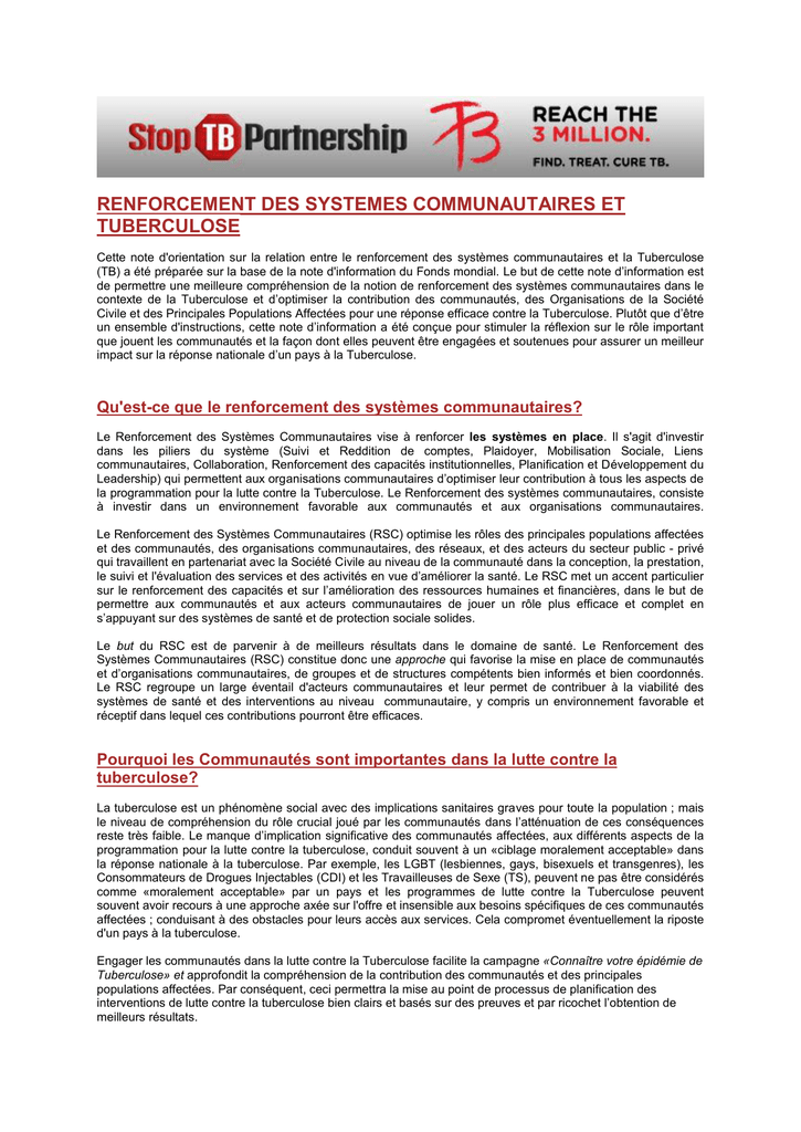 RENFORCEMENT DES SYSTEMES COMMUNAUTAIRES ET TUBERCULOSE Cette note d'orientation sur la relation entre le renforcement des systèmes communautaires et la Tuberculose (TB) a été préparée sur la base de la note d'information du Fonds mondial. Le but de cette note d’information est de permettre une meilleure compréhension de la notion de renforcement des systèmes communautaires dans le contexte de la Tuberculose et d’optimiser la contribution des communautés, des Organisations de la Société Civile et des Principales Populations Affectées pour une réponse efficace contre la Tuberculose. Plutôt que d’être un ensemble d'instructions, cette note d’information a été conçue pour stimuler la réflexion sur le rôle important que jouent les communautés et la façon dont elles peuvent être engagées et soutenues pour assurer un meilleur impact sur la réponse nationale d’un pays à la Tuberculose. Qu'est-ce que le renforcement des systèmes communautaires? Le Renforcement des Systèmes Communautaires vise à renforcer les systèmes en place. Il s'agit d'investir dans les piliers du système (Suivi et Reddition de comptes, Plaidoyer, Mobilisation Sociale, Liens communautaires, Collaboration, Renforcement des capacités institutionnelles, Planification et Développement du Leadership) qui permettent aux organisations communautaires d’optimiser leur contribution à tous les aspects de la programmation pour la lutte contre la Tuberculose. Le Renforcement des systèmes communautaires, consiste à investir dans un environnement favorable aux communautés et aux organisations communautaires. Le Renforcement des Systèmes Communautaires (RSC) optimise les rôles des principales populations affectées et des communautés, des organisations communautaires, des réseaux, et des acteurs du secteur public - privé qui travaillent en partenariat avec la Société Civile au niveau de la communauté dans la conception, la prestation, le suivi et l'évaluation des services et des activités en vue d’améliorer la santé. Le RSC met un accent particulier sur le renforcement des capacités et sur l’amélioration des ressources humaines et financières, dans le but de permettre aux communautés et aux acteurs communautaires de jouer un rôle plus efficace et complet en s’appuyant sur des systèmes de santé et de protection sociale solides. Le but du RSC est de parvenir à de meilleurs résultats dans le domaine de santé. Le Renforcement des Systèmes Communautaires (RSC) constitue donc une approche qui favorise la mise en place de communautés et d’organisations communautaires, de groupes et de structures compétents bien informés et bien coordonnés. Le RSC regroupe un large éventail d'acteurs communautaires et leur permet de contribuer à la viabilité des systèmes de santé et des interventions au niveau communautaire, y compris un environnement favorable et réceptif dans lequel ces contributions pourront être efficaces. Pourquoi les Communautés sont importantes dans la lutte contre la tuberculose? La tuberculose est un phénomène social avec des implications sanitaires graves pour toute la population ; mais le niveau de compréhension du rôle crucial joué par les communautés dans l’atténuation de ces conséquences reste très faible. Le manque d’implication significative des communautés affectées, aux différents aspects de la programmation pour la lutte contre la tuberculose, conduit souvent à un «ciblage moralement acceptable» dans la réponse nationale à la tuberculose. Par exemple, les LGBT (lesbiennes, gays, bisexuels et transgenres), les Consommateurs de Drogues Injectables (CDI) et les Travailleuses de Sexe (TS), peuvent ne pas être considérés comme «moralement acceptable» par un pays et les programmes de lutte contre la Tuberculose peuvent souvent avoir recours à une approche axée sur l'offre et insensible aux besoins spécifiques de ces communautés affectées ; conduisant à des obstacles pour leurs accès aux services. Cela compromet éventuellement la riposte d'un pays à la tuberculose. Engager les communautés dans la lutte contre la Tuberculose facilite la campagne «Connaître votre épidémie de Tuberculose» et approfondit la compréhension de la contribution des communautés et des principales populations affectées. Par conséquent, ceci permettra la mise au point de processus de planification des interventions de lutte contre la tuberculose bien clairs et basés sur des preuves et par ricochet l’obtention de meilleurs résultats. Quelle que soit l'approche utilisée, il est essentiel de faire une analyse critique de la situation afin de soutenir le processus de changement dans la réponse à la tuberculose; «Essentiel» pour éviter la stagnation et propulser la riposte antituberculeuse vers la réussite et «critique» parce que les systèmes de santé ne suffisent pas à elles seules pour renverser la tendance et ont besoin de compétences, de connaissances et de l’apport des communautés afin de maximiser la portée et l'efficacité des plans nationaux et ainsi permettre une réponse globale à la tuberculose. Qui sont les principales populations affectées dans le contexte de la Tuberculose? La note d'information du Fonds mondial sur le RSC (Février 2014) décrit les principales populations affectées comme suit: Les Principales Populations Affectées se définissent généralement comme celles «qui sont le plus souvent marginalisées et qui ont les plus grandes difficultés dans l’exercice de leurs droits à la santé». La population est confrontée à un risque élevé et à la lourde charge d'au moins une des trois maladies. - L'accès des populations aux services concernés est nettement plus faible que pour le reste de la population, et de ce fait, des efforts dévoués et des investissements stratégiques sont nécessaires pour étendre la couverture, l'équité et l'accessibilité. - La population est confr