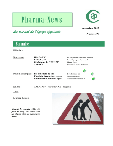 Pharma-News novembre 2012 Le journal de l'équipe officinale Numéro 99 Sommaire Editorial : Nouveautés : PRADAXA° RESOLOR° Génériques du NEXIUM° ZABAK° Pour en savoir plus : Les bouchons de cire L’anémie durant la grossesse Chute chez la personne âgée En bref : La coagulation dans tous ses états Laxatif pas pour hommes ! Fin de règne Devinez la forme du flacon… Bouchons de son Toutes aux fers ! Graves conséquences ? XALATAN° - RENNIE° ICE - rougeole Tests L’image du mois : Bientôt le numéro 100 ! Et pour le coup, un article sur les chutes chez les personnes âgées… Editorial Donnez-nous votre avis Vous tenez sous vos yeux la dernière couverture du Pharma-News ancien look. Comme nous changerons probablement aussi le mode de présentation du contenu, il est temps pour vous de nous donner un petit feed-back. Dans la mise en page, qu’avez-vous aimé, pas aimé, détesté ? Les images du mois ont parfois choqué ou dérangé. Nous en tiendrons compte à l’avenir, sans pour autant tomber dans la banalité. Nous vous remercions pour votre fidélité et vous encourageons à nous donner votre avis sur l’email du CAP : [email protected]. Bonne lecture à tous! Jérôme Berger Pierre Bossert Séverine Huguenin Julia Farina Caroline Mir Marie-Thérèse Guanter Germanier Martine Ruggli Nouveautés PRADAXA° (dabigatran) La gamme des anticoagulants oraux s’est fortement étoffée ces deux dernières années . Après l’arrivée de XARELTO°, de BRILIQUE°, puis d’ELIQUIS°, voici le dernier venu, PRADAXA°. PRADAXA° contient du dabigatran, un inhibiteur spécifique de la thrombine. Il est commercialisé sous forme de capsules à deux dosages : 110 et 150 mg. La dose de 110 mg est réservée aux patients à risque hémorragique élevé, ou dont la fonction rénale est diminuée ainsi qu’aux patients très âgés (plus de 80 ans). PRADAXA° a pour indications officielles la prévention d’AVC et d’embolie (thrombus) chez les patients avec fibrillation auriculaire ayant des risques thrombotiques modérés à importants. Officiellement, il ne devrait être utilisé que chez les personnes de plus de 75 ans ou de plus de 65 ans si elles ont des co-pathologies (diabète, © Pharma-News page 2 Numéro 99, novembre 2011 hypertension, atteinte coronarienne) 1. Cette limitation aux patients âgés vient du fait que c’est la population-cible des études réalisées avec le dabigatran, à voir en pratique comment elle sera interprétée! Son efficacité est démontrée aux deux dosages : les essais versus warfarine (anticoagulant de référence non commercialisé en Suisse – de la même famille que SINTROM° ou MARCOUMAR°) montrent une efficacité similaire sur la diminution de mortalité. La forte dose est un peu plus efficace pour réduire le risque d’AVC que la dose plus faible. A noter que dans ces études près de 20% des patients ont arrêté leur traitement, ce qui est un peu plus fréquent que sous warfarine (env 16%) 2,3. Les patients sous PRADAXA° n’ont pas besoin de contrôle sanguin durant leur traitement (mesure de l’INR ou temps de Quick pour mesurer l’anticoagulation) au contraire des patients sous SINTROM° ou MARCOUMAR°. Si cela semble un grand avantage, il faut le contrebalancer par le fait qu’il n’existe aucun antidote en cas de saignements ou d'hémorragie (KONAKION° pour les deux autres produits) 2. Les effets indésirables les plus redoutés sont bien sûr les hémorragies graves. Dans les études, elles n’ont pas été plus fréquentes que sous warfarine pour le dosage élevé et même moins fréquentes sous le dosage à 110 mg 2,3. Encore un vampire sous PRADAXA… Cependant, à la fin octobre le fabriquant a fait savoir que les données de pharmacovigilance postmarketing montrent des décès suite à une hémorragie et recommande de ce fait un contrôle de la fonction rénale avant et durant le traitement (le médicament est éliminé au niveau rénal et s’il y a une atteinte de cet organe il peut y avoir une augmentation de l’anticoagulation) 4. Les autres effets indésirables sont les troubles digestifs (surtout dyspepsies et nausées), l’anémie et les saignements du nez. Si les dyspepsies (qui touchent environ 6% des patients) sont sévères, il est préférable de prendre les comprimés avec les repas et si cette mesure s’avère insuffisante, il est possible d’administrer conjointement un anti-H2 (ZANTIC° ou autres) ou un IPP (ANTRA°, NEXIUM°, ZURCAL°, AGOPTON° et leurs génériques) 5. Le traitement concomitant par antiplaquettaires oraux (dont l'aspirine et le clopidogrel), AINS ou autre anticoagulant augmente le risque hémorragique. La dose recommandée de PRADAXA° est de 150 mg deux fois par jour, de préférence à 12 heures d’intervalle et pendant les repas. Si le patient oublie une dose, il doit la prendre dès que possible le même jour pour autant qu’il reste encore 6 heures jusqu’à la dose suivante. Si par contre le patient se rend compte de son oubli juste avant la dose suivante, il ne doit pas rattraper la dose oubliée, ni vouloir la compenser par une double dose. 1 Compendium Suisse des médicaments 2012 La Revue Prescrire 2011 ; 31 (338) : 888-892 3 Arznei-telegramm 2011,42(9): 74-77 4 Fda.gov: Pradaxa (dabigatran etexilate mesylate): Drug Safety Communication - Safety Review of Post-Market Reports of Serious Bleeding Events) 5 Pharmacist’s letter 2010;# 261101 2 © Pharma-News page 3 Numéro 99, novembre 2011 Si le patient était précédemment sous un traitement par antivitamine K (p.ex. SINTROM°), il ne doit commencer le PRADAXA° que quand il a stoppé l’ancienne thérapie et que l’INR est < 2. Encore un point très important à dire au patient : il ne faut pas sortir les capsules du blister avant leur utilisation car l’humidité diminue l’efficacité du produit 6! PRADAXA° - A retenir pour le conseil : nouvel anticoagulant oral prise deux fois par jour, de préfé