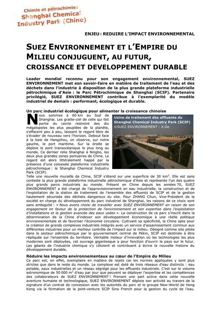 ENJEU : REDUIRE L’IMPACT ENVIRONNEMENTAL SUEZ ENVIRONNEMENT ET L’EMPIRE DU MILIEU CONJUGUENT, AU FUTUR, CROISSANCE ET DEVELOPPEMENT DURABLE Leader mondial reconnu pour son engagement environnemental, SUEZ ENVIRONNEMENT met son savoir-faire en matière de traitement de l’eau et des déchets dans l’industrie à disposition de la plus grande plateforme industrielle pétrochimique d’Asie : le Parc Pétrochimique de Shanghai (SCIP). Partenaire privilégié, SUEZ ENVIRONNEMENT contribue à l’exemplarité du modèle industriel de demain : performant, écologique et durable. Un parc industriel écologique pour alimenter la croissance chinoise N ous sommes à 60 km au Sud de Usine de traitement des effluents du Shanghai. Les gratte-ciel de celle qui fait partie du cercle restreint des dix Shanghai Chemical Industry Park (SCIP) mégalopoles les plus peuplées de la planète, ©SUEZ ENVIRONNEMENT - X.Ge s’effacent peu à peu, laissant le regard libre de s’évader de nouveau vers l’horizon. Debout face à la baie de Hangzhou, on observe, sur notre gauche, le port maritime. Sur la droite se déploie le pont transocéanique le plus long au monde. Ce dernier relie Shanghai à Ningbo, les deux plus grandes zones portuaires de Chine. Le regard est alors littéralement happé par la présence d’une colossale plateforme industrielle pétrochimique : le Shanghai Chemical Industry Park (SCIP). Telle une nouvelle muraille de Chine, SCIP s’étend sur une superficie de 30 km 2. Elle est sans conteste la plus grande plateforme industrielle pétrochimique d’Asie et représente l’un des quatre plus grands parcs industriels au monde. Présent en Chine depuis les années 70, SUEZ ENVIRONNEMENT a été chargé de l’approvisionnement en eau industrielle, la construction et de l’exploitation de la station de traitement de l’ensemble des effluents de SCIP et de la gestion hautement sécurisée des déchets dangereux du site. Pour ZHANG Chun, Vice-Président de la société en charge du développement du parc industriel de Shanghai, les raisons de ce choix sont sans ambiguïté : « Nous avons choisi de travailler avec SUEZ ENVIRONNEMENT en raison de son engagement en faveur de la protection de l’environnement et son expertise dans l’exploitation d’installations et la gestion avancée des eaux usées ». La construction de ce parc s’inscrit dans la détermination de la Chine d’indexer son développement économique à une réelle politique environnementale et de favoriser l’économie circulaire. Cultivant sa spécificité, la Chine opte pour la création de grands complexes industriels intégrés avec un service d’assainissement commun aux différentes industries pour un meilleur contrôle de l’impact sur le milieu. Désigné comme site pilote dans le secteur pétrochimique par le gouvernement central de Pékin, SCIP est destinée à être répliquée sur l’ensemble du territoire. Véritable moteur d’innovation où les technologies les plus modernes sont déployées, cet ouvrage gigantesque a pour fonction d’ouvrir le pays sur le futur. Les géants de l’industrie chimique s’y côtoient et contribuent à écrire la nouvelle histoire du développement durable. Réduire les impacts environnementaux au cœur de l’Empire du Milieu Ce parc est, en effet, exemplaire en matière de rejets car les normes appliquées y sont plus strictes que dans le reste du monde. Le complexe est doté de trois réseaux d'eau distincts : eau potable, eaux industrielles et un réseau ségrégé pour les effluents industriels. C’est sur le volume astronomique de 50 000 m3 d’eau par jour que peuvent se déployer l’expertise et les compétences des collaborateurs de SUEZ ENVIRONNEMENT ! Prenant une part active dans cette nouvelle aventure humaine et technologique, SUEZ ENVIRONNEMENT déploie son activité au travers de la signature d’un contrat de concession avec les autorités du parc et le groupe New-World de Hong Kong via la formation de la joint-venture SCIP Sino French pour la gestion du cycle de l’eau. Construite par Degrémont, l’installation de Usine de traitement des effluents du traitement des effluents a été conçue pour Shanghai Chemical Industry Park (SCIP) recevoir une large variété d’effluents. L’eau rejetée est conforme aux exigences très ©SUEZ ENVIRONNEMENT - X.Ge strictes du parc et une partie de ces effluents est recyclée en eau déminéralisée. Présent également via sa filiale SITA Waste Services, SUEZ ENVIRONNEMENT exploite l’incinérateur de déchets dangereux de SCIP. A l’instar des écosystèmes naturels, la coordination des flux eaux et déchets de plusieurs industries a conduit au renforcement du concept d’économie circulaire du parc (recyclage des eaux usées, valorisation des boues et valorisation énergétique des déchets, production de vapeur, etc.). Les effluents et déchets des uns servent à alimenter en eau ou en énergie les autres. Grâce à la technologie mise en place par SUEZ ENVIRONNEMENT, le cycle de l’eau et des déchets est optimisé pour les entreprises présentes au sein du parc industriel, contribuant ainsi à diminuer l’impact sur l’environnement tout en réduisant de façon significative la consommation d’eau et d’énergie. Devenu rapidement un modèle écologique pour le continent asiatique, il est la vitrine par excellence de ce que SUEZ ENVIRONNEMENT est capable d’apporter à la construction d’une industrie meilleure où croissance et protection de l’environnement ne seraient plus des entités antinomiques. Il n’est dès lors pas étonnant que SUEZ ENVIRONNEMENT se soit vu confier la gestion des eaux industrielles de sept autres parcs en Chine. Recherche et innovation : la clé du futur Si la fonction première d’une station d’épuration consiste à traiter les eaux usées afin qu’elles puissent être restituées sans nuire aux écosystèmes, force est de constater que SUEZ ENVIRONNE
