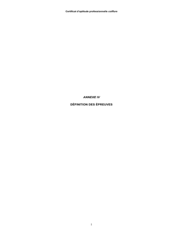 Certificat d’aptitude professionnelle coiffure ANNEXE IV DÉFINITION DES ÉPREUVES 1 Certificat d’aptitude professionnelle coiffure DÉFINITION DES ÉPREUVES EP1 : COUPE ET COIFFAGE « HOMME » UP1 Coefficient 4 (dont 1 pour la VSP) • 2 h (dont 1 h pour la VSP) Finalités et objectifs de l’épreuve Elle a pour objectif de vérifier les compétences liées aux activités professionnelles suivantes : - coupe de cheveux - mise en forme temporaire de la chevelure et coiffage • Contenu L’épreuve permet d’évaluer tout ou partie des compétences terminales suivantes : C33 Exécuter des coupes C34 Mettre en forme la chevelure, coiffer C36 Mettre en œuvre les techniques d’hygiène professionnelle • Évaluation Elle porte sur : - la préparation et la disposition du poste de travail, le respect des règles d’ergonomie, d’hygiène et de sécurité, - la maîtrise des techniques mises en œuvre, - la qualité du résultat. • Mode d’évaluation : Ponctuelle : pratique – Durée : 1 h + 1 h pour la VSP L’épreuve est réalisée sur un modèle masculin de 15 ans ou plus, pourvu de cheveux sur l’ensemble du cuir chevelu dont la longueur pour le tour d’oreilles et la nuque est au minimum de 2 cm avant la coupe. Sur cheveux propres, secs ou mouillés, le candidat réalise une coupe et un coiffage mettant en œuvre des techniques masculines : coupe dégradée avec fondu de nuque,tour d’oreilles et raccourcissement de l’ensemble de la chevelure. Le résultat de la coupe doit permettre d’évaluer le candidat sur la mise en forme et la finition du coiffage. Pour la coupe, la mise en forme et la finition, toutes les techniques, tous les matériels et produits sont admis à l’exception des sabots de tondeuses. Contrôle en cours de formation L’évaluation des acquis des candidats s’effectue sur la base d’un contrôle en cours de formation à l’occasion de deux situations d’évaluation, d’égale valeur, organisées au cours de l’année de formation qui précède l’examen. L’une des situations d’évaluation a lieu dans l’établissement de formation. L’autre situation d’évaluation a lieu en entreprise : 2 Certificat d’aptitude professionnelle coiffure - au cours de la dernière période de formation en milieu professionnel, pour les candidats scolaires des établissements publics et privés sous contrat, - au cours du trimestre qui précède l’examen, pour les apprentis des CFA et sections d'apprentissage habilités. Les candidats de la formation professionnelle continue en situation de première formation ou de reconversion et en formation dans des établissements publics sont évalués soit au cours de la dernière période de formation en milieu professionnel soit au cours du trimestre qui précède l’examen en fonction des modalités d’organisation de leur formation en milieu professionnel. a) Évaluation en établissement de formation Organisée dans le cadre des activités habituelles de formation, elle doit permettre d’évaluer les compétences terminales spécifiques de l’unité. L’épreuve est réalisée sur un modèle masculin de 15 ans ou plus, pourvu de cheveux sur l’ensemble du cuir chevelu dont la longueur pour le tour d’oreilles et la nuque est au minimum de 2 cm avant la coupe. Sur cheveux propres, secs ou mouillés, le candidat réalise une coupe et un coiffage mettant en œuvre des techniques masculines : coupe dégradée avec fondu de nuque, tour d’oreilles et raccourcissement de l’ensemble de la chevelure. Le résultat de la coupe doit permettre d’évaluer le candidat sur la mise en forme et la finition du coiffage. Pour la coupe, la mise en forme et la finition, toutes les techniques, tous les matériels et produits sont admis à l’exception des sabots de tondeuses. Les professionnels sont associés à l’évaluation en établissement de formation (élaboration des supports de l’évaluation, évaluation des candidats…). Les exigences sont les mêmes que celles de l’épreuve ponctuelle. b) Evaluation en milieu professionnel Le candidat est évalué par le tuteur ou le maître d’apprentissage au cours des activités réalisées dans l’entreprise, à partir d’un support fourni par l’établissement de formation permettant l’évaluation des compétences terminales spécifiques de l’épreuve. Un quart de la note attribuée en entreprise correspond à l’évaluation des attitudes professionnelles (exemples : présentation, expression orale et registre de langage, conscience professionnelle, ponctualité et assiduité, intégration dans l'équipe, efficacité et initiative, respect et attention portés aux clients ...). Trois quarts de cette note correspondent à l’évaluation du résultat de la coupe et du coiffage mettant en œuvre des techniques masculines. La proposition de note de l’évaluation en milieu professionnel est établie conjointement par le tuteur ou le maître d’apprentissage et un membre de l’équipe pédagogique. Ces dispositions s’appliquent aux candidats des établissements publics et privés sous contrat, aux apprentis des CFA habilités et aux candidats de la formation professionnelle continue en situation de première formation ou de reconversion et en formation dans des établissements publics. Les candidats de la formation professionnelle (en formation dans des établissements publics) qui sont en situation de perfectionnement sont dispensés de l’évaluation de la formation en milieu professionnel ; une évaluation sous forme d’un contrôle en cours de formation correspondant à cette évaluation est effectuée dans l’établissement de formation : elle prend la forme de l’épreuve ponctuelle en présence d’un professionnel. 3 Certificat d’aptitude professionnelle coiffure L’inspecteur de l’éducation nationale de la spécialité veille au bon déroulement des évaluations (en particulier réalisation des supports d’évaluation) orga