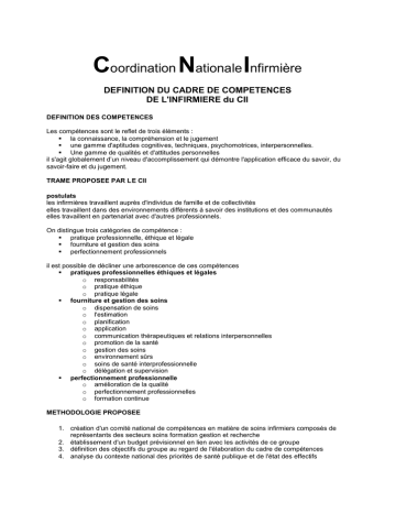 Coordination Nationale Infirmière DEFINITION DU CADRE DE COMPETENCES DE L'INFIRMIERE du CII DEFINITION DES COMPETENCES Les compétences sont le reflet de trois éléments : la connaissance, la compréhension et le jugement une gamme d'aptitudes cognitives, techniques, psychomotrices, interpersonnelles. Une gamme de qualités et d'attitudes personnelles il s'agit globalement d’un niveau d'accomplissement qui démontre l'application efficace du savoir, du savoir-faire et du jugement. TRAME PROPOSEE PAR LE CII postulats les infirmières travaillent auprès d'individus de famille et de collectivités elles travaillent dans des environnements différents à savoir des institutions et des communautés elles travaillent en partenariat avec d'autres professionnels. On distingue trois catégories de compétence : pratique professionnelle, éthique et légale fourniture et gestion des soins perfectionnement professionnels il est possible de décliner une arborescence de ces compétences pratiques professionnelles éthiques et légales o responsabilités o pratique éthique o pratique légale fourniture et gestion des soins o dispensation de soins o l'estimation o planification o application o communication thérapeutiques et relations interpersonnelles o promotion de la santé o gestion des soins o environnement sûrs o soins de santé interprofessionnelle o délégation et supervision perfectionnement professionnelle o amélioration de la qualité o perfectionnement professionnelles o formation continue METHODOLOGIE PROPOSEE 1. création d'un comité national de compétences en matière de soins infirmiers composés de représentants des secteurs soins formation gestion et recherche 2. établissement d'un budget prévisionnel en lien avec les activités de ce groupe 3. définition des objectifs du groupe au regard de l'élaboration du cadre de compétences 4. analyse du contexte national des priorités de santé publique et de l'état des effectifs 5. examen des définitions et du cadre proposé par le Conseil International des Infirmières, comparaison des terminologies employées, contextualisation et mise en conformité des compétences (avec adjonction éventuelle de compétences) 6. étude de la littérature pertinente au thème 7. préparation du projet de cadre de compétences national 8. consultation des professionnels (cette consultation pouvant être réalisée en s’aidant de la méthode DELPHI, la méthodologie ainsi que le suivi du projet devront faire l'objet d'une large diffusion 2 à 3 tours DELPHI sont à envisager 9. la rédaction du cadre final 10. diffusion du cadre et détermination de la périodicité de réévaluation périodique ainsi que du plan d'application 11. programme d'évaluation globale du projet OUTILS décret de février 93 sur les règles professionnelles le décret de février 2002 sur les actes et sur l'exercice de la profession infirmière définition de l’infirmière programme de formation de 92 lois du 4 mars 2002 manuel d'accréditation les règles de bonnes pratiques dans le domaine des soins infirmiers CADRE DE COMPETENCE DE L’INFIRMIERE 1. Pratiques professionnelles éthiques et légales 1.1. responsabilités l'infirmière assume la responsabilité de ses actes et jugements dans le cadre professionnel elle a conscience des limites inhérentes à son rôle et à sa compétence elle n’hésite pas à demander sont des villes d'infirmières plus expérimentées quand les soins infirmiers qu'elle doit dispenser demandent une expertise hors de sa compétence ou du champ de sa propre pratique elle prend des avis d'autres professionnels de la santé des organisations et agences compétentes quand des patients, des groupes de patients sortent de son champ de compétence 1.2. pratique éthique l’infirmière se conforme aux prescriptions du code déontologie du conseil international des infirmières elle prend des décisions effectivement conformes à l’éthique elle agit en promotrice des droits de l'homme tels que définis dans le code déontologie du conseil international des infirmières elle respecte le droit des clients et des patients à accéder aux informations les concernant elle garantit la confidentialité et la sécurité des informations écrites et verbales dont elle a pris connaissance dans l'exercice de ses fonctions elle respecte la sphère privée des clients et des patients elle respecte le droit des clients et des patients à l'autodétermination et au libre choix en matière de soins de santé et soins infirmiers elle s'oppose, tant que faire se peut, aux pratiques de soins de santé qui pourraient compromettre la sécurité, la sphère privée ou la dignité de ses clients passions elle sait identifier les pratiques dangereuses et prendre des mesures nécessaires le cas échéant elle a conscience de ses propres croyances et valeurs, et de la mesure dans laquelle elles peuvent influer dans la dispensation des soins elle respecte les valeurs les coutumes les croyances et les pratiques des individus et des groupes elle prodigue des soins respectueux des particularités culturelles elle a conscience des conditions particulières que la guerre, la violence, les conflits et les situations de catastrophes naturelles imposent à la prise de décision éthique 1.3. pratique légale l'infirmière exerce sa profession dans le respect de la législation en vigueur elle exerce sa profession dans le respect des politiques nationales et locales et des règle de procédures elle sait reconnaître les manquements aux lois, règlement code relatif à la pratique professionnelle, et elle agit de façon appropriée dans ce cas 2. analyse des fournitures et gestions des soins de santé 2.1. principes de base de la fourniture et de la gestion des soins de santé l'infirmière applique les savoirs et aptitudes adaptées à la pratique des soins infirmiers elle intègre à sa pratique les découvertes scientifiques pertinentes et tout élément d’