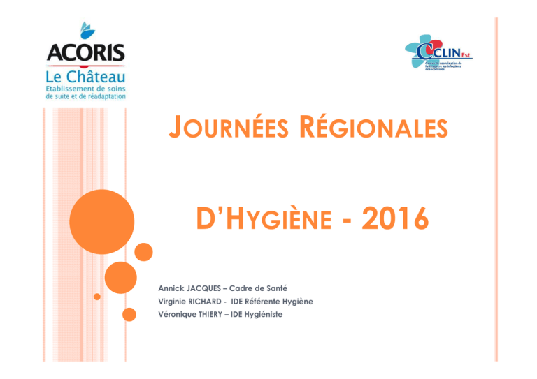 JOURNÉES RÉGIONALES D’HYGIÈNE - 2016 Annick JACQUES – Cadre de Santé Virginie RICHARD - IDE Référente Hygiène Véronique THIERY – IDE Hygiéniste RETOUR D’EXPERIENCE SUR UNE EPIDEMIE DE GRIPPE - FEVRIER 2015 - Etablissement de Soins de Suite et Réadaptation à Baccarat. Situé à 25km de Lunéville et de Saint Dié des Vosges, à 40 km de Sarrebourg et à 60 km de Nancy PRÉSENTATION DE L’ETABLISSEMENT Etablissement privé à but non lucratif créé en 1972 Capacité d’accueil de 90 lits répartis en 4 secteurs de 20 à 25 lits Ets comporte 6 chambres doubles et 78 chambres particulières Objectif SSR : retour à l’autonomie et/ou une rééducation des personnes accueillies Activités principales de l’établissement : Soins de suite polyvalents avec une orientation orthopédique pour 60% de nos patients Pour les 40 % restant: Toute pathologie nécessitant une PEC post MC (cardiaque, urinaire, digestive, neuro, respiratoire, intercure de chimio, Syndromes dépressifs etc.) PEC post chute ou baisse de l’état général pour les patients venant directement du domicile LES PATIENTS ACCUEILLIS Moyenne d'Age : environ 80 ans De + en + poly pathologiques donc - en - autonomes Origine : principalement Meurthe et Moselle mais également de toute la Lorraine (voir au- delà) Etablissements d’origine : → En priorité : CH Lunéville, Clinique Jeanne D’Arc, CH St Dié des Vosges afin de répondre aux besoins du territoire → Domicile envoyé par le MT DESCRIPTIF DE L’ETABLISSEMENT Contexte organisationnel: - 2 médecins à temps plein - 1 médecin rééducateur à 0.25 ETP - 1 médecin gériatre à 0.25 ETP - 2 kiné libéraux à TP dans l’Ets - 1 ergo à TP - 1 cadre de santé - 1 IDE coordinatrice et hygiéniste - 4 IDE de jour + 1 de nuit (en 12 h) - 4 AS de jour + 1 de nuit (en 12 h - 5,8 ASH DESCRIPTIF DE L’ETABLISSEMENT Contexte organisationnel: - 1 Prestataire restauration - 1 Laboratoire de ville - 2 Pharmacies de ville Particularité de l’organisation SSR : Les patients se rendent en salle à manger midi et soir en salle de rééducation pour les séances de kiné et d’ergo → lieux « carrefours » propices à la contamination CONTEXTE GENERAL LE VIRUS DE LA GRIPPE Les épidémies de grippe saisonnière surviennent chaque année en France au cours de l'automne et de l'hiver en raison de la grande contagiosité de cette infection virale. Souvent considérée comme bénigne, la grippe peut cependant entraîner des complications graves chez les personnes fragiles. La grippe au cours de l'hiver 2014-2015 (AMELI- SANTE) - 9 semaines d'épidémie - 2,9 millions de consultations pour syndrome grippal - 3133 hospitalisations dont 1558 en réanimation - 69 % des personnes admises en réanimation n'étaient pas vaccinées. ETUDE DE CAS AU SSR DE BACCARAT DESCRIPTION CHRONOLOGIQUE DE L’EVENEMENT • Survenue d’un syndrome grippal le week-end du 8 février 2015 au sein du SSR. • Lundi matin : 9 patients sur un même secteur de 22 lits sont touchés (soit un taux d’attaque de 41 %). → 1 patient va nécessiter une hospitalisation. • Parallèlement, des signes associés de gastro-entérite sont présents chez 4 patients. ETUDE DE CAS AU SSR DE BACCARAT MESURES MISES EN PLACE DÈS LE LUNDI MATIN (1) 1. Prévention de la transmission croisée ▪ Maintien en chambre des patients contaminés dans 1 premier temps puis de l’ensemble des patients de l’ES dans un 2nd temps ▪ Arrêt des activités communes et des repas en salle à manger pour les patients concernés ▪ Renfort de l’hygiène des mains pour les professionnels et les patients ▪ Mise à disposition du matériel de protection : masques, sur blouses ▪ Modification du protocole de bio nettoyage : détergentdésinfectant tous les jours pour tous les locaux ETUDE DE CAS AU SSR DE BACCARAT MESURES MISES EN PLACE DÈS LE LUNDI MATIN (2) 2. Information et dépistage ▪ Information à l’ensemble des professionnels : oralement puis par mail et note d’information ▪ Rappel sur les mesures d’hygiène (PC) à l’ensemble du personnel de l’Ets ▪ Rappel sur le risque de transmission (idem) ▪ Demande en urgence de tests de dépistage rapide de la grippe, au laboratoire de ville Contact à l’ARLIN ▪ Déclaration aux tutelles (E-Sin) ▪ Informations aux familles et aux visites ( oralement et puis par affichage ) ETUDE DE CAS AU SSR DE BACCARAT DIFFICULTÉS RENCONTRÉES (1) ▪ Pas de personnel dédié par secteur (personnel de nuit est en poste sur tout l’établissement) 1 seul Cadre présent dans l’Ets (vacances scolaires) 1 cellule de crise difficile à activer (dans son intégralité) ▪ Beaucoup d’Informations à donner (aux 90 patients présents + familles : sur le respect du lavage des mains et des mesures mises en place) ▪ Les Activités de rééducation en salle à réorganiser ▪ La Planification des examens /consultations extérieurs à revoir ETUDE DE CAS AU SSR DE BACCARAT DIFFICULTÉS RENCONTRÉES (2) ▪ Suspendre les permissions ▪ Organiser le confinement en chambre des 90 patients Réorganiser la distribution des repas avec le service restauration Mobiliser l’ensemble des équipes pluridisciplinaires ▪ Limiter les visites : mettre en place les affiches d’information ▪ Mettre en place l’activité de rééducation en chambre ▪ Obtenir un nombre importants de tests de dépistage par le laboratoire de ville ETUDE DE CAS AU SSR DE BACCARAT EFFICACITÉ DES MESURES CONFINEMENT EN CHAMBRE Lundi 09/02 9 patients concernés par le syndrome grippal Mardi 10/02 1 cas supplémentaire et 1 patiente hospitalisée Mercredi 11/02 Jeudi 12/02 Vendredi 13/02 sur 8 patients enrhumés 4 présentent des diarrhées sous antibiotiques 5 cas syndrome grippal + 1 diarrhée. Levée du confinement en chambre de tous les patients asymptomatiques → Dépistage P S renforcées + P C gouttelettes Lundi 16/02 2 cas ANALYSE (1) 1) HYPOTHESE ET MECANISME DE TRANSMISSIONS Tr