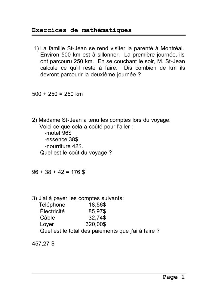 Exercices de mathématiques 1) La famille St-Jean se rend visiter la parenté à Montréal. Environ 500 km est à sillonner. La première journée, ils ont parcouru 250 km. En se couchant le soir, M. St-Jean calcule ce qu’il reste à faire. Dis combien de km ils devront parcourir la deuxième journée ? 500 + 250 = 250 km 2) Madame St-Jean a tenu les comptes lors du voyage. Voici ce que cela a coûté pour l'aller : -motel 96$ -essence 38$ -nourriture 42$. Quel est le coût du voyage ? 96 + 38 + 42 = 176 $ 3) J’ai à payer les comptes suivants : Téléphone 18,56$ Électricité 85,97$ Câble 32,74$ Loyer 320,00$ Quel est le total des paiements que j’ai à faire ? 457,27 $ Page 1 Exercices de mathématiques 4) Combien me coûtera la décoration de ma chambre si je dois acheter : 1 gallon de peinture 26,97$ 1 couvre-lit 48,88$ 1 store 9,75$ 1 tapis 17,24$ 102,84 $ 5) Tu achètes un disque, une cassette et un livre de musique lors d’une vente-réclame. Le disque vaut 6,98$, la cassette 4,89$ et le livre 4,25$. La facture s’élève à 26,12$. Crois-tu que tu devrais la vérifier ? Oui. 16,12 $ 6) Karine désire s’acheter une robe qui coûte 86,24$ (avec les taxes). Elle donne un acompte de 9,75$. Combien doit -elle verser pour avoir sa robe? 76,49 $ Page 2 Exercices de mathématiques 7) Chaque semaine, Véronique gagne 293.65$ Mais à ce montant, on retire 27,69$ pour l’impôt, 5,72$ pour le syndicat et 24,72$ pour les autres déductions. Quel est le montant du chèque de paie de Véronique ? 235,52 $ 8) Combien d’argent Simon avait-il dans ses poches au début de la soirée ? Actuellement, il lui reste 17,68$ et il a payé son entrée au cinéma 8,00$ et s’est acheté un sac de maïs soufflé 2,79$. 28,47 $ 9) Un avion peut transporter 432 passagers. Hier, il n’y en avait que 243 à bord. Combien de places étaient libres ? 189 places Page 3 Exercices de mathématiques 10) Rémi a emprunté 22,25$ à un ami. La semaine dernière, il lui a remboursé 7,55$, et hier autant. Combien doit-il encore à son ami ? 7,15 $ 11) Mon père a 69 ans et il reçoit une pension de 725,39$ par mois. Ma mère a 64 ans et elle reçoit 814,75$. Combien d’argent l’un de mes parents reçoit-il de plus que l’autre ? 89,36 $ 12) Un cultivateur a vendu 385 kg de patates, 78 kg de navets, 269 kg de carottes et 57 kg d’oignons. Combien de kilogrammes de légumes a-t-il vendus ? 789 kg Page 4 Exercices de mathématiques 13) Le camion postal transportait 96 sacs de courrier. La conductrice a laissé 42 sacs dans la salle de tri. Combien de sacs reste-t-il dans le camion ? 54 sacs 14) Le facteur distribue 764 lettres sur la rue Roy et 387 lettres sur la rue Gagné. Combien de lettres a-t-il distribuées de plus sur la rue Roy ? 431 lettres 15) Il est arrivé 126 sacs de courrier par avion, 513 sacs par train et 72 sacs par autobus. Combien cela fait-il de sacs de courrier ? 711 sacs Page 5 Exercices de mathématiques 16) Un commis a vendu 313 timbres, puis 51 timbres et enfin 68 timbres. Combien de timbres a-t-il vendus ? 432 timbres 17) Karine a mis 72 lettres à la poste, Pédro 13 lettres et Maria, 31 lettres. Combien de lettres les trois amis ont ils mises à la poste ? 116 lettres 18) Dans le port, il y a 5 cargos, 12 bateaux de pêche, 28 voiliers et 7 hors-bords. Combien de bateaux y a-t-il en tout ? 52 bateaux Page 6 Exercices de mathématiques 19) Je désire vendre ma maison. Je l’ai payée 53 500$. Je voudrais faire un profit de 5 450$ car je prévois acheter une auto de 8 750$. Quel doit être le prix de vente de ma maison ? 58 950 $ 20) Paul a pêché 64 kg de poissons et Vincent en a pêché 39 kg. Combien de kg de poissons Paul a-t-il pêchés de plus ? Combien de kg de poissons ont-ils pêchés ensemble ? 25 kg 103 kg 21) Un des bateaux de pêche mesure 25 mètres et un des voiliers mesure 8 mètres. Combien de mètres le bateau de pêche mesure-t-il de plus ? 17 m Page 7 Exercices de mathématiques 22) Pour me rendre à Gatineau, je dois parcourir 638 km. J’ai roulé pendant 418 km. Combien me reste-il de kilomètres à faire ? 220 km 23) Gaétan a ramassé 26 coquillages, Ludovic en a ramassé 45 et Nadia 23. Combien de coquillages ont ils ramassés en tout ? 94 coquillages 24) Sur la plage, il y a 39 hommes, 41 femmes et 23 enfants. Combien de personnes y a-t-il en tout ? 103 personnes Page 8 Exercices de mathématiques 25) Pour construire une tour, Gino a besoin de 523 bâton nets. Il en a déjà 317. Combien lui en manque-t-il ? 206 bâtonnets 26) Au bar laitier, Pauline achète 3 dizaines de sucettes glacées et une demi-douzaine de cornets. Combien de douceurs Pauline a-t-elle données à ses élèves ? 36 douceurs 27) En jouant aux sacs de sable, Sylvie a compté 145 points le premier tour, 190 le deuxième tour et 215 au troisième tour. Combien a-t-elle compté de points en tout ? 550 points Page 9 Exercices de mathématiques 28) Un gros bateau de pêche entre au port avec 1 583 beaux poissons. Le propriétaire en livre 1 237 à l’usine de poissons. Combien en garde-t-il pour lui ? 346 poissons 29) À l’église St-Joseph, je compte 594 bancs alors qu’à l’église St-Pierre, on en compte 312. Quelle église compte le plus de bancs et de combien ? L’église St -Joseph 282 bancs 30) Dans son sac, Hélène compte 78 patates. Le sac à Odette en compte 83 et celui de Johanne en a 69. Combien ont-elles de patates ensemble ? 230 patates Page 10