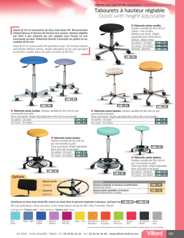 Mobilier pour cabinet de consultation - Examination furniture Tabourets à hauteur réglable Stools with height adjustable ■ Tabourets assise soudée. Hauteur variable de 49 à 69 cm Coloris : noir ou bleu Welded seat stools. Height adjustable from 49 to 69 cm. Colours : black or blue Assises Ø 33 cm recouvertes de tissu vinyl classé M1. Recouvrement intégral (dessus et dessous de l’assise) sans couture. Hauteur réglable par vérin à gaz actionné par une poignée sous l’assise ou une commande au pied. Piétement chromé 5 branches sur patins ou sur roulettes Ø 50 mm. Sur patins - On pads Réf. 318.44 Sur roues - On castors Réf. 318.27 Dosseret - Backrest Réf. 396.32 Seats Ø 33 cm covered with M1 upholstery vinyl. Full recovery (above and below) without sewing. Height adjustable by gar jack operated by handle or pedal. Bases on pads or castros Ø 50 mm. Réf. 318.27 Réf. 318.29 Réf. 318.34 Réf. 318.28 Réf. 318.35 ■ Tabourets assise tendue. Hauteur variable de 49 à 69 cm par commande manuelle Tense seat stools. Height adjustable from 49 to 69 cm by handful ■ Tabourets assise épaisse. Hauteur variable de 48 à 68 cm par commande manuelle Tense seat stools. Height adjustable from 48 to 68 cm by handful Sur patins - On pads Sur roues - On castors Sur patins - On pads Sur roues - On castors Réf. 318.28 Réf. 318.29 Réf. 318.34 Réf. 318.35 ■ Tabourets assise tendue. Hauteur variable de 56 à 66 cm par commande au pied Tense seat stools. Height adjustable from 56 to 66 cm by pedal Réf. 318.32 Sur patins - On pads Réf. 318.31 Sur roues - On castors Réf. 318.30 ■ Tabourets assise épaisse. Hauteur variable de 58 à 68 cm par commande au pied Thick seat stools. Height adjustable from 58 to 68 cm by pedal Réf. 318.31 Réf. 318.33 Options - Repose-pieds - Footrest Sur patins - On pads Réf. 318.32 Sur roues - On castors Réf. 318.33 OPTIONS Dosseret réglable en hauteur et profondeur Backrest for stools Repose-pieds ajustable en hauteur Footrest adjustable in height - Dosseret - Backrest Réf. 396.13 Réf. 396.12 Garnitures en tissu vinyl classé M1, coloris au choix dans la gamme proposée ci-dessous, sauf pour les Réf. 318.27 et Réf. 318.44 M1 vinyl upholstery, choice of colour in the range below, except for Ref. 318.27 and Ref. 318.44 Vinyl gamme “Diabolo club” - Vinyl upholstery “Diabolo club” range Azur Azure Egée - Egee Cobalt Cobalt Glycine Wistain Pétunia Petunia Maïs - Corn Mandarine Mandarin Potiron Pumpkin Poirier Pear tree Rouge Red Anthracite Blade Galet Grey Nous nous réservons le droit d’apporter des modifications sans avis préalable au matériel figurant sur notre catalogue. B.P. 40021 - 72190 COULAINES - FRANCE - Tél. 02 43 82 32 45 - Fax. 02 43 82 35 90 - www.villard-medical.com 183