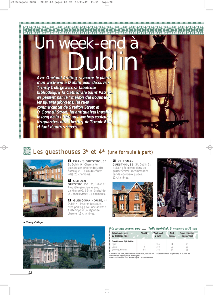WE Escapade 2008 - 22-25:03-pages 22-32 15/11/07 11:57 Page 22 Un week-end à Dublin Avec Gaéland Ashling, savourez le plaisir d'un week-end à Dublin pour découvrir Trinity College avec sa fabuleuse bibliothèque, la Cathédrale Saint Patrick, en passant par la "maison des douanes", les squares géorgiens, les rues commerçantes de Grafton Street et O'Connell Street, les antiquaires installés le long de la Liffey aux sombres couleurs, les quartiers des Liberties, de Temple Bar, et tant d'autres choses... Les guesthouses 3* et 4* 1 EGAN'S GUESTHOUSE, 3*, Dublin 9 : Charmante guesthouse, proche du jardin botanique (1,7 km du centre ville). 23 chambres. (une formule à part) 4 KILRONAN GUESTHOUSE, 3*, Dublin 2 : Maison géorgienne dans un quartier calme, recommandée par de nombreux guides. 12 chambres. 2 CLIFDEN GUESTHOUSE, 3*, Dublin 1 : 1 Propriété géorgienne avec parking privé, à 5 mn à pied de O’Connell Street. 15 chambres. 3 GLENOGRA HOUSE, 4*, Dublin 4 : Proche du centre, avec parking privé, une adresse à retenir pour un séjour de charme. 13 chambres. 2 3 Trinity College Prix par personne en euro Selon hôtel choisi au départ de Paris Guesthouses 3/4 étoiles Egan's Clifden Glenogra, Kilronan Tarifs Week-End : 1er novembre au 31 mars Plan N° Week-end 2 nuits Nuit suppl. Supp. chambre ind. par nuit 1 2 3/4 356 372 382 54 62 67 25 25 25 Ces tarifs ne sont pas valables pour Noël, Nouvel An (15 décembre au 1er janvier), et durant les matches de rugby (nous interroger). Réduction enfant 2-12 ans en triple : nous consulter. 22 WE Escapade 2008 - 22-25:03-pages 22-32 15/11/07 11:57 Page 23 WEEK-END A DUBLIN Les hôtels Les hôtels 2/3 étoiles 3 étoiles 5 MOUNT HERBERT HOTEL, Dublin 4 : Dans le 7 ACADEMY PLAZA HOTEL, Dublin 1 : Entièrement quartier de Ballsbridge, proche du Dart (direct pour le centre), un hôtel typiquement irlandais au charme certain. 172 chambres. rénové et agrandi en 2007, cet hôtel est tout proche de O'Connell Street. 300 chambres. Nous avons aimé : le parking gratuit, la proximité du centre (2 km), la brasserie, le pub. DUBLIN : 115 km 2 1 2 9 Nous avons aimé : la situation au cœur de Dublin, le parking en sous-sol. 7 6 8 ARLINGTON HOTEL, 6 DAYS INN TALBOT STREET, Dublin 1 : A 2 mn à pied de O’Connell Street, près des boutiques et des restaurants, un hôtel idéal pour la découverte de Dublin. 60 chambres. Nous avons aimé : la proximité des pubs et restaurants, dans une ville qui bouge. Dublin 1 : Près de O'Connell Bridge, l'hôtel le plus central de Dublin. 116 chambres. 8 Nous avons aimé : le parking souterrain, le restaurant et le bar avec animation tous les soirs. 10 15 9 CASSIDY’S HOTEL, 14 Dublin 1 : En haut de O'Connell Street, au cœur de la ville, cet hôtel récent a tiré le meilleur parti du bâtiment géorgien. 113 chambres. 13 11 16 17 Nous avons aimé : le quartier et une très bonne qualité pour un 3 étoiles. 10 TEMPLE BAR HOTEL, Dublin 2 : Au cœur de la ville, dans le nouveau quartier à la mode, une localisation idéale pour apprécier Dublin la nuit. 129 chambres. Nous avons aimé : la situation au centre de Dublin, l'aménagement des chambres. 3 5 4 12 11 MERCER HOTEL, Dublin 2 : Au cœur de Dublin, un hôtel au charme irlandais proche de Grafton Street. 41 chambres. Nous avons aimé : le confort des chambres avec vidéo et lecteur CD, le charme de l’ensemble. 5 9 11 Prix par personne en euro 8 Selon hôtel choisi au départ de Paris Le forfait comprend : les vols réguliers Aer Lingus Paris/Dublin (du vendredi au dimanche, classe S), aller et retour les taxes d'aéroport le logement en hôtel selon la catégorie choisie, en chambre double ou triple, petit-déjeuner irlandais inclus sauf au Comfort Inn (2 nuits) l'assurance assistance et rapatriement La « Nuit supplémentaire » comprend : le logement en hôtel selon la catégorie choisie, en chambre double ou triple, petit-déjeuner irlandais inclus (1 nuit) Tarifs Week-End : 1er novembre au 31 mars Plan N° Week-end 2 nuits Nuit suppl. Supp. chambre ind. par nuit Hôtels 2/3 étoiles Mount Herbert Hotel Days Inn Talbot Street 1 5 6 352 376 52 64 38 50 Hôtels 3 étoiles Academy Plaza Hotel 2 Arlington Hotel Cassidy’s Hotel Temple Bar Hotel Mercer Hotel 3 7 8 9 10 11 380 388 400 404 416 66 70 76 78 84 56 42 48 41 56 Ces tarifs ne sont pas valables pour Noël, Nouvel An (15 décembre au 1er janvier), et durant les matches de rugby (nous interroger). Réduction enfant 2-12 ans en triple : nous consulter. Par personne et par nuit : 1 Days Inn Talbot Street : du dimanche au jeudi, réduction de 9 € - En mars, supplément de 7 € 2 Academy Plaza : du dimanche au jeudi, réduction de 7 € - En mars, supplément de 12 € 3 Mercer : du dimanche au jeudi, réduction de 14 € - En mars, supplément de 10 € 23 WE Escapade 2008 - 22-25:03-pages 22-32 15/11/07 11:58 Page 24 Les hôtels 4 étoiles 12 SCHOOL HOUSE HOTEL, Dublin 4 : Ouvert en mars 98, cet hôtel est déjà une adresse qui compte à Dublin. 31 chambres. Nous avons aimé : l’architecture de cet hôtel (superbe école de briques rouges). Dublin 2 : Proche de Merrion Square et de Trinity College, très bel hôtel à la façade somptueuse. 115 chambres. 13 DAVENPORT HOTEL, 14 BROOKS HOTEL, Dublin 2 : Au cœur du quartier à la mode, à 3 mn de Grafton Street, nouvel hôtel de charme. 98 chambres. Nous avons aimé : une oasis au cœur de Dublin, les facilités de parking. Nous avons aimé : le restaurant, la brasserie, la vivacité du quartier. 12 Les hôtels 5 étoiles 15 THE WESTIN HOTEL, Dublin 2 : Face à Trinity College, près de la rue commerçante de Grafton Street, un des plus beaux hôtels d’Irlande. 163 chambres. 16 THE SHELBOURNE HOTEL, Dublin 2 : Sur St 17 THE MERRION HOTEL, Stephen’s Green, c’est l’hôtel le plus mythique de Dublin qui rouvre après 2 ans de rénovation. 265 chambres. Dublin 2 : Entre Merrion Square et St Stephens Green, très bel hôtel dans 4 maisons géor