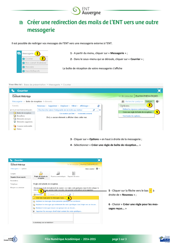 Il est possible de rediriger vos messages de l’ENT vers une messagerie externe à l’ENT. 1 - A partir du menu, cliquer sur « Messagerie » ; 2 - Dans le sous–menu qui se déroule, cliquer sur « Courrier » ; La boîte de réception de votre messagerie s’affiche 3 - Cliquer sur « Options » en haut à droite de la messagerie ; 4 - Sélectionner « Créer une règle de boîte de réception... » 5 - Cliquer sur la flèche vers le bas droite de « Nouveau » ; à 6 - Choisir « Créer une règle pour les messages reçus... » La fenêtre pop-up ci-dessous s’ouvre : 7 - Dans le champ « Lorsque le message arrive et : », Cliquer sur la flèche pour faire apparaître la liste des options. 8 - Dans la liste proposée, choisir [Appliquer à tous les messages]. 9 - Dans le champ « Effectuer les opérations suivantes : », Cliquer sur la flèche pour faire apparaître la liste des options. 10 - Choisir, dans la liste proposée, « Rediriger le message vers... » La fenêtre « Carnet d’adresses » s’ouvre afin de pouvoir sélectionner l’adresse mail de redirection des messages : 11 - L’adresse de messagerie vers laquelle doivent être redirigés les messages est à inscrire dans « Destinataires du message ». 12 - Cliquer sur « OK » pour valider. 1 - Cliquer sur « Autres options... » ; 2 - Cliquer sur « Ajouter une action » ; 3 - Dans "Choisir dans la liste " choisir "Déplacer, Copier ou Supprimer" ; 4 - Par exemple, cliquer sur "Supprimer le message" si vous ne souhaitez pas conserver les messages sur l’ENT après la redirection ; 5 - Cliquer sur « Enregistrer ». 6 - Cliquer sur « Oui » pour valider l’application de la règle à tous les prochains messages. La fenêtre des « Règles de la boîte de réception » indique la règle [Appliquer à tous les messages]. Le cadre de droite résume le contenu de cette règle. Toute règle de messagerie peut être rééditée, modifiée, avec un double-clic sur l’intitulé de cette règle. Une règle peut également être désactivée, simplement en décochant la case correspondant à la ligne de la règle.