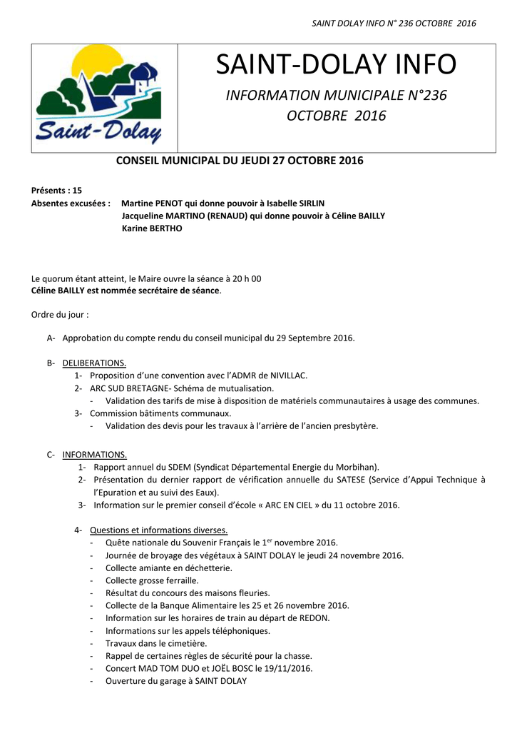 SAINT DOLAY INFO N° 236 OCTOBRE 2016 SAINT-DOLAY INFO INFORMATION MUNICIPALE N°236 OCTOBRE 2016 CONSEIL MUNICIPAL DU JEUDI 27 OCTOBRE 2016 Présents : 15 Absentes excusées : Martine PENOT qui donne pouvoir à Isabelle SIRLIN Jacqueline MARTINO (RENAUD) qui donne pouvoir à Céline BAILLY Karine BERTHO Le quorum étant atteint, le Maire ouvre la séance à 20 h 00 Céline BAILLY est nommée secrétaire de séance. Ordre du jour : A- Approbation du compte rendu du conseil municipal du 29 Septembre 2016. B- DELIBERATIONS. 1- Proposition d’une convention avec l’ADMR de NIVILLAC. 2- ARC SUD BRETAGNE- Schéma de mutualisation. - Validation des tarifs de mise à disposition de matériels communautaires à usage des communes. 3- Commission bâtiments communaux. - Validation des devis pour les travaux à l’arrière de l’ancien presbytère. C- INFORMATIONS. 1- Rapport annuel du SDEM (Syndicat Départemental Energie du Morbihan). 2- Présentation du dernier rapport de vérification annuelle du SATESE (Service d’Appui Technique à l’Epuration et au suivi des Eaux). 3- Information sur le premier conseil d’école « ARC EN CIEL » du 11 octobre 2016. 4- Questions et informations diverses. - Quête nationale du Souvenir Français le 1er novembre 2016. - Journée de broyage des végétaux à SAINT DOLAY le jeudi 24 novembre 2016. - Collecte amiante en déchetterie. - Collecte grosse ferraille. - Résultat du concours des maisons fleuries. - Collecte de la Banque Alimentaire les 25 et 26 novembre 2016. - Information sur les horaires de train au départ de REDON. - Informations sur les appels téléphoniques. - Travaux dans le cimetière. - Rappel de certaines règles de sécurité pour la chasse. - Concert MAD TOM DUO et JOËL BOSC le 19/11/2016. - Ouverture du garage à SAINT DOLAY SAINT DOLAY INFO N° 236 OCTOBRE 2016 A- Approbation du compte rendu du conseil municipal du 29 septembre 2016. Joseph MAHE fait remarquer que pour les points 2 et 3 du compte rendu, il n’y a pas eu de vote car ce sont des informations. Le maire rectifie le compte rendu. Franck FREHEL fait remarquer que pour l’aménagement du cimetière, le 2ième paragraphe prête à confusion. Le maire répond que c’est lui qui a ajouté celui-ci. Accord du conseil avec 12 voix pour, 2 voix contre et 3 abstentions. B- DELIBERATIONS. 1- Proposition d’une convention avec l’ADMR de NIVILLAC. Le maire explique que l’ADMR de NIVILLAC bénéficiait d’une subvention de la communauté de communes ARC SUD BRETAGNE de 30 000 € jusqu’en 2015 au titre d’une convention. La communauté de communes a versé 10 000 € en 2016 mais ne versera plus rien en 2017. Les communes de MARZAN, LA ROCHE BERNARD, NIVILLAC, SAINT DOLAY et THEHILLAC ont versées 10 897 € en 2016. L’ADMR de NIVILLAC propose aux cinq communes une convention de 4 ans jusqu’en 2020 pour assurer un partenariat. Dans cette convention, après s’être mises d’accord, les cinq communes proposent de verser 1,50 € par habitant. Pour la commune de SAINT DOLAY le coût s’élèvera à 3664,50 €. Accord du conseil à l’unanimité. 2- ARC SUD BRETAGNE- Schéma de mutualisation. - Validation des tarifs de mise à disposition de matériels communautaires à usage des communes. Par délibération du 22/09/2015, le conseil communautaire ARC SUD BRETAGNE a approuvé le Schéma de Mutualisation entre la communauté de communes et les communes. Une des actions à court terme, est de favoriser la mutualisation des matériels. Par délibération du 5/07/2016 le conseil communautaire a approuvé les tarifs de mise à disposition pour les 12 communes de la communauté. Une convention va être établie pour préciser les modalités avec les tarifs et la facturation. Un état mensuel de suivi des heures et un bilan annuel sera établi. Accord du conseil à l’unanimité. 3- Commission bâtiments communaux. - Validation des devis pour les travaux à l’arrière de l’ancien presbytère. Patrick GERAUD propose aux élus de valider les devis qui ont été étudiés en commission bâtiments : - Salle polyvalente : un devis de l’entreprise Michel LEFUR, pour refaire entièrement l’éclairage de la salle et de la scène coût 9 221,90 € HT. Accord du conseil à l’unanimité. - Rénovation de la partie arrière de l’ancien presbytère : la commission propose de retenir l’entreprise de peinture JOSSELIN pour un montant de 10856 € TTC. Accord du conseil à l’unanimité. - Pour la partie avant de l’ancien presbytère et la maison BOSSARD près de la mairie, la commission propose de faire appel à un architecte afin de rénover les bâtiments. C- INFORMATIONS. 1- Rapport annuel du SDEM (Syndicat Départemental Energie du Morbihan). Yves BERTHO informe les élus du rapport annuel du SDEM. Il y a 489 468 clients dont 1 464 à SAINT DOLAY. Dans notre commune, actuellement il n’y a pas de client mal alimenté recensé par le SDEM ou ENEDIS (ex Erdf). Il y a 54 km de câble HTA (moyenne tension) et 55 km de BT (basse tension). Le SDEM a financé 199 000 € de travaux sur le réseau électrique de SAINT DOLAY en 2015. SAINT DOLAY INFO N° 236 OCTOBRE 2016 2- Présentation du dernier rapport de vérification annuelle du SATESE (Service d’Appui Technique à l’Epuration et au suivi des Eaux). Le maire présente aux élus le dernier rapport du SATESE. Deux analyses sont effectuées tous les ans. Le fonctionnement du débitmètre est bon. Il y a une bonne corrélation entre les volumes mesurés et les volumes obtenus. En conclusion, le fonctionnement de la station est bon. 3- Information sur le premier conseil d’école « ARC EN CIEL » du 11 octobre 2016. L’école compte actuellement 117 élèves répartis en 5 classes (2 classes de maternelles et 3 classes élémentaires). Les élèves ont la possibilité de pratiquer les temps d’activités périscolaires. Toutes les classes feront de la musique à raison de 6 heures par classe en janvier-févrie