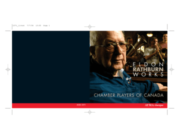 2371_livret 7/7/06 13:05 Page 1 E L D O N RATHBURN W O R K S CHAMBER PLAYERS OF CANADA ACD2 2371 ATMA Classique 2371_livret 7/7/06 13:05 Page 3 ELDON RATHBURN WORKS CHAMBER PLAYERS OF CANADA Jonathan Crow • Manuela Milani VIOLINS | VIOLONS [ 2-25 ] Guylaine Lemaire VIOLA | ALTO [ 2-25 ] Julian Armour CELLO | VIOLONCELLE [ 2-25 ] Murielle Bruneau DOUBLE BASS | CONTREBASSE [ 2-12, 20 ] Joanna G’froerer FLUTE | FLÛTE [ 2-12, 20 ] Kimball Sykes CLARINET | CLARINETTE [ 2-12, 15, 20 ] Roddy Ellias BANJO [ 23-25 ] Karen Donnelly [ 1-12, 20 ] • Manon Lafrance [ 1, 20 ] TRUMPETS | TROMPETTES Jill Kirwan HORN | COR [ 1-12, 20 ] Donald Renshaw TROMBONE [ 1-12, 20 ] Nicholas Atkinson TUBA [ 1-12, 20 ] Jonathan Wade PERCUSSION | PERCUSSIONS [ 2-12, 20 ] Thomas Annand CELESTA, ORGAN | CELESTA, ORGUE [ 2-12 ] Jennifer Swartz HARP | HARPE [ 20 ] Gordon Slater CARILLON [ 16-17 ] LES CHAMBRISTES DU CANADA 2371_livret 1| 7/7/06 13:05 Page 5 FANFARE, for brass quintet (2001) [0:30 ] 2| 3| 4| 5| 6| 7| 8| 9| 10 | 11 | 12 | OTTAWA SUITE (1996 / 2001) [24:53 ] I (Opening) Ottawa Chamber Music Festival II National Arts Centre [1:50 ] III The Senate Sleeps [3:43 ] IV Winterlude [1:23 ] V Byward Market [2:19 ] VI Palladium [2:11 ] VII Civil Servants [2:23 ] VIII National Gallery of Canada [3:45 ] IX Amalgamation [2:27 ] X Boom City [1:28 ] XI Parliament Hill [2:36 ] 13 | ANDANTE (1938) [4:20 ] 14 | SCHERZO HUMOURESQUE, for string quartet (1939) [2:49 ] 15 | A FAREWELL TO LOU, for clarinet and string quartet (2000) [4:50 ] 16 | 17 | TWO PIECES, for celesta and string quartet (2001) [6:24 ] Summer Nocturne, for celesta and string quartet [3:47 ] The Cats on Parliament Hill, for celesta and string quartet [2:37 ] 18 | SCOTTISH MELODY, for string quartet (1933) [3:25 ] 19 | REVERIE ON A THEME OF BEETHOVEN, for string quartet (1998) [3:47 ] 20 | HARBOUR NOCTURNE (2001) [7:17 ] 21 | THE GREEN SHORES OF FOGO, for string quartet (2002) [5:06 ] 22 | SUBWAY THOUGHTS, for string quartet (1993) [6:17 ] 23 | 24 | 25 | CONCERTINO FOR BANJO AND STRING QUARTET (1999) [6:59 ] I Allegro con brio [1:50 ] II Lento [3:34 ] III Moderato [1:24 ] [0:28 ] 2371_livret 7/7/06 13:05 Page 7 CHAMBER MUSIC OF ELDON RATHBURN ldon Rathburn may not yet be a household name but I am certain that every single Canadian and many millions of people around the world have heard his music. Besides the substantial amount of music written for concert performance, he has also written scores for over 300 films, including some of the most interesting experimental art-film music in the history of film, collaborations which he made with the legendary filmmaker, Norman McLaren. Eldon Rathburn was born on April 21, 1916 in Queenstown, New Brunswick. His musical life has taken many fascinating turns, involving many different styles of music. Although studying to be an organist in his native New Brunswick, he was highly active in various dance bands and, in fact, played with Don Messer for three years starting at the age of 15. He received his Licentiate of Music from McGill University in 1937 and the following year won the Canadian Performing Rights Society Scholarship Competition. In 1938 and 1939 he studied composition at the Toronto Conservatory of Music with Healey Willan. In 1944, he won first prize in the Los Angeles Philharmonic Competition, where the jury was chaired by arguably the most influential composer of the 20th century, Arnold Schoenberg. Also on the jury were Alexander Tansman and the film composer Arthur Lange. As a result of winning this prize, he had the opportunity to visit Los Angeles and have a composition lesson with Schoenberg. Other composers he has met read like a who’s who of 20th-century music and include Ives, Copland, Varèse, Krenek, Walton, Percy Grainger, Healey Willan of course, and countless others. In 1947, he took a position with the National Film Board, which was one of the only ways a composer could make a living in Canada in those days. This led to hundreds of superb film scores for the NFB and also opened up opportunities to write scores for IMAX, OMNIMAX, television and other productions. Given this huge amount of film activity, music lovers are fortunate indeed that Mr. Rathburn has been able to find the time to write a substantial amount of music for concert performance. In my opinion, Eldon Rathburn’s music deserves to endure, to be listened to and performed by future generations. I have always found it to be immediately appealing, not just to audiences but also to those members of the music community who have a strong predisposition to much more avant-garde styles of music. There are very few composers who have been able to win over both of these “camps” so thoroughly. His compositions are all that great music should be. They are well-crafted and concise, and display the complete spectrum of human emotions. They have always encountered total respect from musicians who perform them (a rare feat, indeed!) and have always been extremely well received by audiences. Eldon Rathburn has his own unique and immediately identifiable style. Eldon Rathburn is one of the few Canadian composers to have received the Order of Canada, and the National Film Board of Canada has made a film about his life called “They Shoot… He Scores!” In 1996, the City of Ottawa declared April 21 “Eldon Rathburn Day.” 6 7 E 2371_livret 7/7/06 13:05 Page 9 This recording features a wide variety of music written over a period of almost 70 years. The opening Fanfare was written in 2001 to open a concert celebrating his 85th birthday. A mere 30 seconds long, it remains one of my favourite fanfares and is the perfect opening to this disc. The Ottawa Suite ranks as the single most popular work that the Ottawa Chamber Music Society has programmed in the over 1,000 concerts of its twelve-year history. Humour in music is always a great challenge and very few composers have succeeded in composing music that is truly funny, especially afte