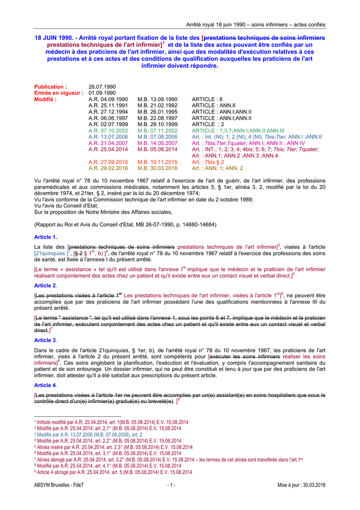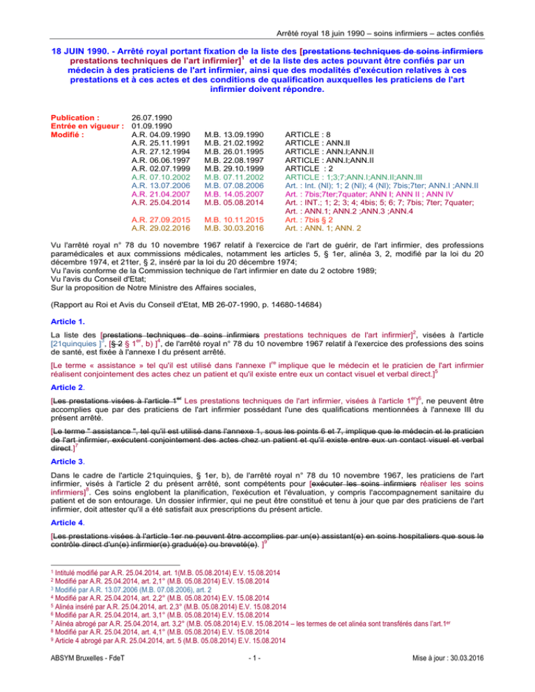 Arrêté royal 18 juin 1990 – soins infirmiers – actes confiés 18 JUIN 1990. - Arrêté royal portant fixation de la liste des [prestations techniques de soins infirmiers prestations techniques de l'art infirmier]1 et de la liste des actes pouvant être confiés par un médecin à des praticiens de l'art infirmier, ainsi que des modalités d'exécution relatives à ces prestations et à ces actes et des conditions de qualification auxquelles les praticiens de l'art infirmier doivent répondre. Publication : 26.07.1990 Entrée en vigueur : 01.09.1990 Modifié : A.R. 04.09.1990 A.R. 25.11.1991 A.R. 27.12.1994 A.R. 06.06.1997 A.R. 02.07.1999 A.R. 07.10.2002 A.R. 13.07.2006 A.R. 21.04.2007 A.R. 25.04.2014 M.B. 13.09.1990 M.B. 21.02.1992 M.B. 26.01.1995 M.B. 22.08.1997 M.B. 29.10.1999 M.B. 07.11.2002 M.B. 07.08.2006 M.B. 14.05.2007 M.B. 05.08.2014 A.R. 27.09.2015 A.R. 29.02.2016 M.B. 10.11.2015 M.B. 30.03.2016 ARTICLE : 8 ARTICLE : ANN.II ARTICLE : ANN.I;ANN.II ARTICLE : ANN.I;ANN.II ARTICLE : 2 ARTICLE : 1;3;7;ANN.I;ANN.II;ANN.III Art. : Int. (Nl); 1; 2 (Nl); 4 (Nl); 7bis;7ter; ANN.I ;ANN.II Art. : 7bis;7ter;7quater; ANN I; ANN II ; ANN IV Art. : INT.; 1; 2; 3; 4; 4bis; 5; 6; 7; 7bis; 7ter; 7quater; Art. : ANN.1; ANN.2 ;ANN.3 ;ANN.4 Art. : 7bis § 2 Art. : ANN. 1; ANN. 2 Vu l'arrêté royal n° 78 du 10 novembre 1967 relatif à l'exercice de l'art de guérir, de l'art infirmier, des professions paramédicales et aux commissions médicales, notamment les articles 5, § 1er, alinéa 3, 2, modifié par la loi du 20 décembre 1974, et 21ter, § 2, inséré par la loi du 20 décembre 1974; Vu l'avis conforme de la Commission technique de l'art infirmier en date du 2 octobre 1989; Vu l'avis du Conseil d'Etat; Sur la proposition de Notre Ministre des Affaires sociales, (Rapport au Roi et Avis du Conseil d'Etat, MB 26-07-1990, p. 14680-14684) Article 1. 2 La liste des [prestations techniques de soins infirmiers prestations techniques de l'art infirmier] , visées à l'article 3 er 4 [21quinquies ] , [§ 2 § 1 , b) ] , de l'arrêté royal n° 78 du 10 novembre 1967 relatif à l'exercice des professions des soins de santé, est fixée à l'annexe I du présent arrêté. [Le terme « assistance » tel qu'il est utilisé dans l'annexe Ire implique que le médecin et le praticien de l'art infirmier 5 réalisent conjointement des actes chez un patient et qu'il existe entre eux un contact visuel et verbal direct.] Article 2. [Les prestations visées à l'article 1er Les prestations techniques de l'art infirmier, visées à l'article 1er]6, ne peuvent être accomplies que par des praticiens de l'art infirmier possédant l'une des qualifications mentionnées à l'annexe III du présent arrêté. [Le terme " assistance ", tel qu'il est utilisé dans l'annexe 1, sous les points 6 et 7, implique que le médecin et le praticien de l'art infirmier, exécutent conjointement des actes chez un patient et qu'il existe entre eux un contact visuel et verbal direct.]7 Article 3. Dans le cadre de l'article 21quinquies, § 1er, b), de l'arrêté royal n° 78 du 10 novembre 1967, les praticiens de l'art infirmier, visés à l'article 2 du présent arrêté, sont compétents pour [exécuter les soins infirmiers réaliser les soins infirmiers]8. Ces soins englobent la planification, l'exécution et l'évaluation, y compris l'accompagnement sanitaire du patient et de son entourage. Un dossier infirmier, qui ne peut être constitué et tenu à jour que par des praticiens de l'art infirmier, doit attester qu'il a été satisfait aux prescriptions du présent article. Article 4. [Les prestations visées à l'article 1er ne peuvent être accomplies par un(e) assistant(e) en soins hospitaliers que sous le contrôle direct d'un(e) infirmier(e) gradué(e) ou breveté(e). ]9 Intitulé modifié par A.R. 25.04.2014, art. 1(M.B. 05.08.2014) E.V. 15.08.2014 Modifié par A.R. 25.04.2014, art. 2,1° (M.B. 05.08.2014) E.V. 15.08.2014 3 Modifié par A.R. 13.07.2006 (M.B. 07.08.2006), art. 2 4 Modifié par A.R. 25.04.2014, art. 2,2° (M.B. 05.08.2014) E.V. 15.08.2014 5 Alinéa inséré par A.R. 25.04.2014, art. 2,3° (M.B. 05.08.2014) E.V. 15.08.2014 6 Modifié par A.R. 25.04.2014, art. 3,1° (M.B. 05.08.2014) E.V. 15.08.2014 7 Alinéa abrogé par A.R. 25.04.2014, art. 3,2° (M.B. 05.08.2014) E.V. 15.08.2014 – les termes de cet alinéa sont transférés dans l’art.1er 8 Modifié par A.R. 25.04.2014, art. 4,1° (M.B. 05.08.2014) E.V. 15.08.2014 9 Article 4 abrogé par A.R. 25.04.2014, art. 5 (M.B. 05.08.2014) E.V. 15.08.2014 1 2 ABSYM Bruxelles - FdeT -1- Mise à jour : 30.03.2016 Arrêté royal 18 juin 1990 – soins infirmiers – actes confiés [Article 4bis Il est seulement autorisé au praticien de l'art infirmier de réaliser les prestations techniques de l'art infirmier et les actes pouvant être confiés par un médecin lorsqu'il dispose de la compétence, de la formation et/ou de l'expérience qui est nécessaire pour les exécuter correctement et en toute sécurité.]10 Article 5. [La liste des actes visés à l'article 5, § 1er, alinéa 3, 2, La liste des actes pouvant être confiés par un médecin, visés à l'article 5, § 1er, alinéas 2 et 3, et à l'article 21quinquies, § 1er, c),]11 de l'arrêté royal n° 78 du 10 novembre 1967 est fixée à l'annexe II du présent arrêté. Article 6. [Les actes visés à l'article 5 Les actes pouvant être confiés par un médecin, visés à l'article 5, ne peuvent être accomplis réalisés]12 que par les praticiens de l'art infirmier possédant l'une des qualifications mentionnées sous les points a) et b) de l'annexe III du présent arrêté. Article 7. Dans le cadre de l'article 21quinquies, § 1er, c), de l'arrêté royal n° 78 du 10 novembre 1967, les praticiens de l'art infirmier, visés à l'article 6 du présent arrêté, sont compétents pour [exécuter réaliser les soins infirmiers les actes pouvant être confiés par un médecin]13. Ces soins englobent la planific