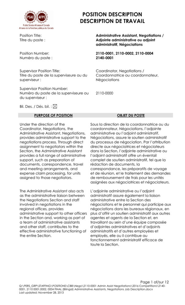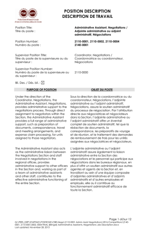 POSITION DESCRIPTION DESCRIPTION DE TRAVAIL Position Title: Titre du poste : Administrative Assistant, Negotiations / Adjointe administrative ou adjoint administratif, Négociations Position Number: Numéro du poste : 2110-0001, 2110-0002, 2110-0004 2140-0001 Supervisor Position Title: Titre du poste de la superviseure ou du superviseur : Coordinator, Negotiations / Coordonnatrice ou coordonnateur, Négociations Supervisor Position Number: Numéro du poste de la superviseure ou du superviseur : 2110-0000 Bil. Des. / Dés. bil. : PURPOSE OF POSITION OBJET DU POSTE Under the direction of the Coordinator, Negotiations, the Administrative Assistant, Negotiations, provides administrative support to the negotiations process. Through direct assignment to negotiators within the Section, the Administrative Assistant provides a full range of administrative support, such as preparation of documents, correspondence, travel and meeting arrangements, and expense claim processing, for units assigned to those negotiators. Sous la direction de la coordonnatrice ou du coordonnateur, Négociations, l’adjointe administrative ou l’adjoint administratif, Négociations, assure le soutien administratif du processus de négociation. Par l’attribution directe aux négociatrices et négociateurs dans la Section, l’adjointe administrative ou l’adjoint administratif offre un éventail complet de soutien administratif, tel que la rédaction de documents, la correspondance, les préparatifs de voyage et de réunion, et le traitement des demandes de remboursement de frais pour les unités assignées aux négociatrices et négociateurs. The Administrative Assistant also acts as the administrative liaison between the Negotiations Section and staff involved in negotiations in the regional offices, provides administrative support to other officers in the Section and, working as part of a team of administrative assistants and other staff, contributes to the effective administrative functioning of the entire Section. L’adjointe administrative ou l’adjoint administratif assure également la liaison administrative entre la Section des négociations et le personnel qui participe aux négociations dans les bureaux régionaux, en plus d’offrir un soutien administratif aux autres agentes et agents de la Section et, en travaillant au sein d’une équipe composée d’adjointes administratives et d’adjoints administratifs et d’autres employées et employés, elle ou il contribue au fonctionnement administratif efficace de toute la Section. Page 1 of/sur 12 Q:\PERS_GRP\STAFFING\POSITIONS\CBB\Nego\2110-0001 Admin Assist Negotiations\2016 Competitions\21400001, 2110 0001,0002, 0004 FINAL (Bilingal) Administrative Assistants, Negotiations Job Description.docx Last updated: November 28, 2013 POSITION DESCRIPTION DESCRIPTION DE TRAVAIL Position Title: Titre du poste : Administrative Assistant, Negotiations / Adjointe administrative ou adjoint administratif, Négociations Position Number: Numéro du poste : 2110-0001, 2110-0002, 2110-0004 2140-0001 STATEMENT OF RESPONSIBILITIES Provides general administrative support to staff officers : ÉNONCÉ DES FONCTIONS Offrir un soutien administratif général au personnel de la Section : The position will be assigned by the Coordinator to provide general administrative support to a number of negotiators, research officers or other staff officers, and will carry out a range of functions for those officers by: La ou le titulaire offre un soutien administratif général aux négociatrices et négociateurs, aux agentes et agents de recherche ou à d’autres membres du personnel en exécutant un ensemble de tâches, c’est-à-dire : making travel arrangements (booking travel and accommodations, calculating and requesting advances) and completing administrative forms (overtime, leave, etc.); voir aux préparatifs de voyage (réserver les billets et les chambres d’hôtel, calculer les avance de fonds et soumettre les demandes) et remplir les formulaires administratifs (heures supplémentaires, congés, etc.); distributing mail and field messages; distribuer le courrier et les messages des régions; preparing documents, such as correspondence, forms and spreadsheets; rédiger des documents, tels que la correspondance, remplir des formulaires et préparer des chiffriers; filing general correspondence. classer la correspondance générale; The position will also provide back-up to other staff officers in the absence of the Administrative Assistant regularly assigned to that officer. remplacer les autres adjointes administratives ou adjoints administratifs de la Section lorsqu’ils sont absents; Update on a daily basis the G drive agenda, make sure negotiators, research officers, classification officers and other staff you are assigned to have entered their events, leaves, etc. mettre à jour quotidiennement l’agenda sur le lecteur G; vérifier que les permanents syndicaux qui lui sont assignés (négociateurs, agents de recherche, agents de classification, etc.) ont entré l’information demandée (rendez-vous, congés, etc.) Verify and code the expense claims and ensure that they are complete and accurate, accompanied by the required vérifier et coder les demandes de remboursement; s’assurer qu’elles sont remplies correctement et Page 2 of/de 12 Q:\PERS_GRP\STAFFING\POSITIONS\CBB\Nego\2110-0001 Admin Assist Negotiations\2016 Competitions\21400001, 2110 0001,0002, 0004 FINAL (Bilingal) Administrative Assistants, Negotiations Job Description.docx Last updated: November 28, 2013 POSITION DESCRIPTION DESCRIPTION DE TRAVAIL Position Title: Titre du poste : Administrative Assistant, Negotiations / Adjointe administrative ou adjoint administratif, Négociations Position Number: Numéro du poste : 2110-0001, 2110-0002, 2110-0004 2140-0001 documentation, prepare for signature. accompagnées des documents requis; les préparer aux fins de signature; Process leave forms, overtime requ