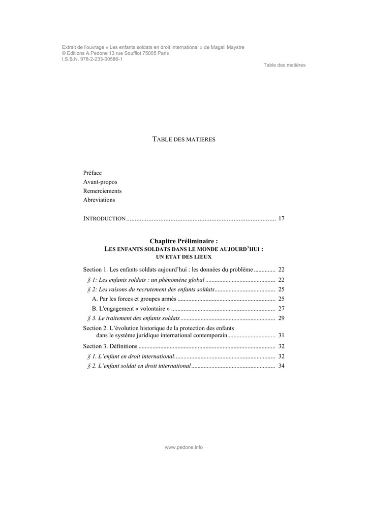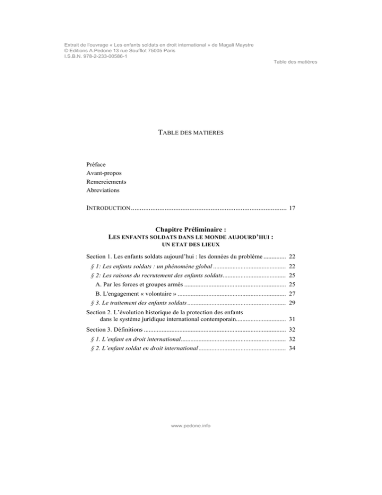Extrait de l’ouvrage « Les enfants soldats en droit international » de Magali Maystre © Editions A.Pedone 13 rue Soufflot 75005 Paris I.S.B.N. 978-2-233-00586-1 Table des matières TABLE DES MATIERES Préface Avant-propos Remerciements Abreviations INTRODUCTION ........................................................................................ 17 Chapitre Préliminaire : LES ENFANTS SOLDATS DANS LE MONDE AUJOURD’HUI : UN ETAT DES LIEUX Section 1. Les enfants soldats aujourd’hui : les données du problème .............. 22 § 1: Les enfants soldats : un phénomène global ............................................. 22 § 2: Les raisons du recrutement des enfants soldats....................................... 25 A. Par les forces et groupes armés ............................................................... 25 B. L'engagement « volontaire » ................................................................... 27 § 3. Le traitement des enfants soldats ............................................................. 29 Section 2. L’évolution historique de la protection des enfants dans le système juridique international contemporain............................... 31 Section 3. Définitions ........................................................................................ 32 § 1. L’enfant en droit international................................................................. 32 § 2. L’enfant soldat en droit international ...................................................... 34 www.pedone.info Extrait de l’ouvrage « Les enfants soldats en droit international » de Magali Maystre © Editions A.Pedone 13 rue Soufflot 75005 Paris I.S.B.N. 978-2-233-00586-1 Table des matières LES ENFANTS SOLDATS EN DROIT INTERNATIONAL Première Partie INSTRUMENTS JURIDIQUES RÉGISSANT LE RECRUTEMENT ET L’UTILISATION D’ENFANTS SOLDATS, STATUT ET MÉCANISME DE CONTRÔLE Chapitre I DROIT APPLICABLE AU REGARD DU RECRUTEMENT ET DE L’UTILISATION D’ENFANTS SOLDATS DANS LES HOSTILITES Section 1. En droit international conventionnel................................................. 40 § 1. Les normes de droit international humanitaire........................................ 40 A. Les Conventions de Genève de 1949 ...................................................... 40 B. L'article 77 (2) du Protocole additionnel I............................................... 42 C. L'article 4 (3) (c) du Protocole additionnel II .......................................... 48 § 2. Les normes en droit international des droits de l’homme........................ 51 A. L'article 38 de la Convention relative aux droits de l'enfant ................... 52 B. Le Protocole facultatif à la Convention relative aux droits de l'enfant, concernant l'implication d'enfants dans les conflits armés ............. 55 C. L'article 22 de la Charte africaine des droits et du bien-être de l'enfant ..................................................................................................... 64 § 3. La Convention de l’Organisation internationale du travail (No 182) concernant l’interdiction des pires formes de travail des enfants et l’action immédiate en vue de leur élimination ................................................ 66 Section 2. En droit international coutumier ....................................................... 68 § 1. Existence d’une norme coutumière ? ....................................................... 68 § 2. Quelles obligations pour les acteurs non-étatiques ? .............................. 73 Chapitre II LE STATUT ET LE TRAITEMENT DES ENFANTS SOLDATS DANS LES CONFLITS ARMES INTERNATIONAUX ET NON INTERNATIONAUX Section 1. En tant que combattants .................................................................... 77 Section 2. Lorsqu’ils sont hors de combat et au pouvoir de la partie adverse ...... 79 § 1. Dans les conflits armés internationaux.................................................... 79 § 2. Dans les conflits armés non internationaux............................................. 85 200 www.pedone.info Extrait de l’ouvrage « Les enfants soldats en droit international » de Magali Maystre © Editions A.Pedone 13 rue Soufflot 75005 Paris I.S.B.N. 978-2-233-00586-1 Table des matières TABLE DES MATIERES Chapitre III LES MECANISMES CONCERNANT LES ENFANTS SOLDATS INSTAURES AU SEIN DES NATIONS UNIES Section 1. La réponse des organes onusiens à la problématique des enfants soldats..................................................................................... 87 Section 2. Le mécanisme de contrôle mis en place par le conseil de sécurité....... 90 Deuxième Partie ENFANTS SOLDATS ET RESPONSABILITÉ PÉNALE INTERNATIONALE : VICTIMES ET/OU BOURREAUX ? Chapitre I BOURREAUX ? LA RESPONSABILITE PENALE INTERNATIONALE INDIVIDUELLE DES ENFANTS SOLDATS POUR CRIMES INTERNATIONAUX Section 1. Les enfants et la responsabilité pénale en droit international – une limite d’âge pour la responsabilité pénale internationale ?............... 104 § 1. Le Protocole additionnel I aux Conventions de Genève ........................ 108 § 2. La Convention relative aux droits de l’enfant de 1989 .......................... 110 § 3. Les problèmes liés à la responsabilité pénale internationale des enfants dans le Statut de Rome de la Cour pénale internationale .......... 111 § 4. Le Statut du Tribunal spécial pour la Sierra Leone............................... 115 Section 2. Garanties juridiques et droits fondamentaux dont jouissent les enfants en vertu du droit international..................................................... 122 § 1 En ce qui concerne la procédure. ........................................................... 123 § 2. En ce qui concerne la peine ................................................................... 125 Section 3. Moyens de défense et circonstances atténuantes............................. 127 § 1. La contrainte..