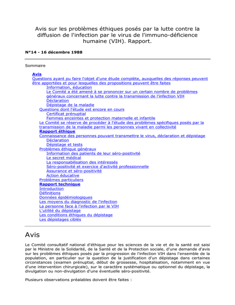 Avis sur les problèmes éthiques posés par la lutte contre la diffusion de l'infection par le virus de l'immuno-déficience humaine (VIH). Rapport. N°14 - 16 décembre 1988 Sommaire Avis Questions ayant pu faire l'objet d'une étude complète, auxquelles des réponses peuvent être apportées et pour lesquelles des propositions peuvent être faites Information, éducation Le Comité a été amené à se prononcer sur un certain nombre de problèmes généraux concernant la lutte contre la transmission de l'infection VIH Déclaration Dépistage de la maladie Questions dont l'étude est encore en cours Certificat prénuptial Femmes enceintes et protection maternelle et infantile Le Comité se réserve de procéder à l'étude des problèmes spécifiques posés par la transmission de la maladie parmi les personnes vivant en collectivité Rapport éthique Connaissance des personnes pouvant transmettre le virus, déclaration et dépistage Déclaration Dépistage et tests Problèmes éthique généraux Information des patients de leur séro-positivité Le secret médical La responsabilisation des intéressés Séro-positivité et exercice d'activité professionnelle Assurance et séro-positivité Action éducative Problèmes particuliers Rapport technique Introduction Définitions Données épidémiologiques Les moyens du diagnostic de l'infection La personne face à l'infection par le VIH L'utilité du dépistage Les conditions éthiques du dépistage Les dépistages ciblés Avis Le Comité consultatif national d'éthique pour les sciences de la vie et de la santé est saisi par le Ministre de la Solidarité, de la Santé et de la Protection sociale, d'une demande d'avis sur les problèmes éthiques posés par la progression de l'infection VIH dans l'ensemble de la population, en particulier sur la question de la justification d'un dépistage dans certaines circonstances (examen prénuptial, début de grossesse, hospitalisation, notamment en vue d'une intervention chirurgicale), sur le caractère systématique ou optionnel du dépistage, la divulgation ou non-divulgation d'une éventuelle séro-positivité. Plusieurs observations préalables doivent être faites : 1) Les problèmes posés, pris dans toute leur ampleur, sont considérables. Compte-tenu des contraintes du temps qui lui ont été imposées, le Comité n'a pu examiner que certains aspects de ces problèmes et se réserve de poursuivre son étude au cours des prochains mois. 2) Les données des problèmes sont essentiellement évolutives. Les observations formulées ne sont donc valables qu'en l'état actuel de la situation. 3) Sur le plan juridique, le gouvernement tient de la législation en vigueur, notamment de l'article L.18 et des articles L.355-22 et suivants du Code de la Santé publique, de très larges pouvoirs, et est en mesure de prendre toute mesure efficace pour prévenir la maladie et en éviter ou limiter la diffusion. Ces pouvoirs ne trouvent leur limite que dans les règles résultant de la jurisprudence générale en matière de police, à savoir l'obligation où se trouvent les pouvoirs publics de réaliser un équilibre entre les contraintes qu'exige l'ordre public, ici la lutte contre la maladie, et là, la garantie des libertés individuelles et collectives. A cet égard, comme du point de vue éthique, la légitimité des mesures prises ou à prendre repose sur un arbitrage permanent commandé par le degré de gravité que représente l'épidémie à combattre. Le Comité a constaté qu'un important effort a déjà été entrepris par les pouvoirs publics pour lutter contre la diffusion de l'infection VIH avec des résultats qui, pour être encore limités, sont loin d'être négligeables et qui vont dans le sens souhaitable. L'on est en présence d'une épidémie dont la gravité est manifeste par les perspectives inquiétantes que présente sa diffusion en l'absence actuelle de toute thérapeutique, situation appelée à se prolonger pendant encore au moins plusieurs années, et qui peut donc justifier des contraintes exceptionnelles. L'effort à entreprendre doit naturellement, en l'état de cette situation, porter sur la limitation de la transmission de la maladie et justifier une action soutenue pour prévenir cette transmission, action légitimant des sacrifices importants, tant sur le plan financier que par les limitations qu'elle pourrait apporter aux libertés individuelles et collectives. 4) Sur le plan scientifique, la pandémie mondiale d'infection par le VIH, apparue dans les années 1970, groupe trois épidémies : - La première épidémie concerne les personnes infectées : environ 5 à 10 millions de personnes dans le monde, 200 000 à 400 000 personnes en France. Le seul critère d'infection aisément disponible est la recherche de la séro-positivité anti-VlH. En l'absence de thérapeutique curative, prévenir la transmission est le seul objectif à la portée des sociétés humaines. L'efficacité des mesures de prévention se traduit par l'infléchissement de la courbe de croissance du nombre de personnes séro-positives. - La deuxième épidémie concerne les cas de SIDA avérés, phase terminale de l'infection : environ 250 000 à 300 000 personnes dans le monde et environ 5 000 en France. Le nombre de cas double actuellement tous les six à neuf mois, et cette croissance se poursuivra pendant plusieurs années, quelle que soit l'efficacité des mesures de prévention, car elle traduit l'histoire naturelle de l'infection chez les personnes déjà contaminées ; le SIDA est précédé d'une incubation de six mois à quinze ans probablement plus. - La troisième épidémie est celle des conséquences sociales, culturelles, économiques et politiques, engendrées par les deux premières épidémies et la peur qu'elles provoquent, elle sera alimentée par les statistiques de la deuxième épidémie, celle des SIDA avérés. L'infection par le VIH est transmissible par inoculation de s