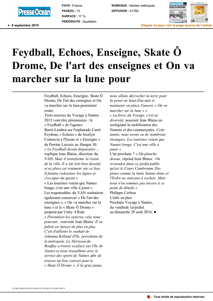 PAYS : France RUBRIQUE : Nantes métropole PAGE(S) : 13 DIFFUSION : 31780 SURFACE : 17 % PERIODICITE : Quotidien 8 septembre 2015 Cliquez ici pour voir la page source de l’article Feydball, Echoes, Enseigne, Skate Ô Drome, De l'art des enseignes et On va marcher sur la lune pour Feydball, Echoes, Enseigne, Skate Ô Drome, De l'art des enseignes et On va marcher sur la lune pourraient rester. Trois oeuvres du Voyage à Nantes 2015 vont être pérennisées : le « Feydball » de l'agence Barré-Lambot sur l'esplanade Carré Feydeau, « Echoes » de Jocelyn Cottencin à l'Ensan et « Enseigne » de Perrine Lacroix au Hangar 30. « Le Feydball devait disparaître , explique Jean Blaise, directeur du VAN. Mais il transforme la vision de la ville. Il a été très bien dessiné et sa place est vraiment sur ce lieu. Il faudra redessiner les lignes et s'occuper du gazon » « Les touristes voient que Nantes bouge, c'est une ville à jouer » Les responsables du VAN souhaitent également conserver « De l'art des enseignes », « On va marcher sur la lune » et le « Skate Ô Drome » proposé par Unity 4 Ride. « Pérenniser les oeuvres, cela nous poursuit , convient Jean Blaise. Il va falloir en laisser de plus en plus. C'est d'ailleurs le souhait de Johanna Rolland (PS), présidente de la métropole. Le Hérisson du Bouffay a trouvé sa place sur l'île de Nantes et nous travaillons avec le service des sports de Nantes afin de trouver un lieu couvert pour le « Skate Ô Drome ». À la grue jaune, nous allons décrocher la terre pour la poser en haut d'un mat et maintenir en place l'oeuvre « On va marcher sur la lune » » « La force du Voyage, c'est sa diversité, poursuit Jean Blaise en soulignant la mobilisation des Nantais et des commerçants. Cette année, nous avons eu de nombreux étrangers. Les touristes voient que Nantes bouge. C'est une ville à jouer » L'an prochain ? « On planche dessus, répond Jean Blaise . On reviendra dans ce jardin public qu'est le Cours Cambronne Des pistes comme la butte Sainte-Anne et l'Erdre ne sont pas à exclure. Mais nous n'en sommes pas encore à ce point de détails » Philippe Corbou L'info en plus Prochain Voyage à Nantes, du vendredi 1erjuillet au dimanche 28 août 2016. ■ 0272B8C558B07302F0E507630D0C05E72EE5B01711835D9E109B17F Tous droits de reproduction réservés