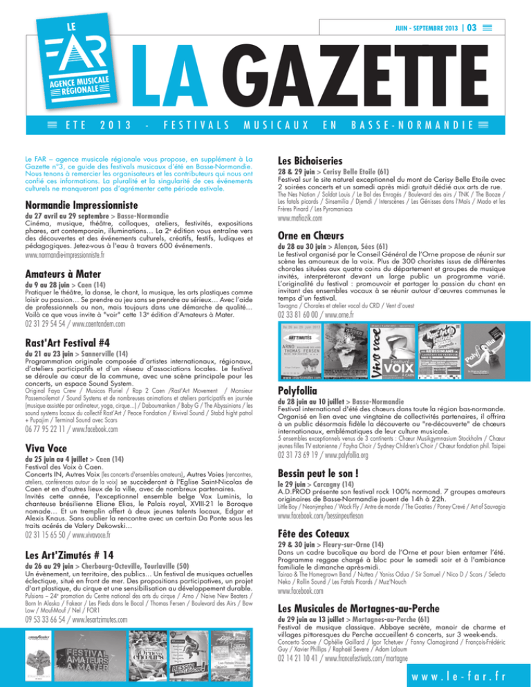 LE JUIN - SEPTEMBRE 2013 CALE AGENCE MUSI LE A N IO ÉG R ETE 03 LA GAZETTE 2013 - FESTIVALS MUSICAUX Le FAR – agence musicale régionale vous propose, en supplément à La Gazette n°3, ce guide des festivals musicaux d’été en Basse-Normandie. Nous tenons à remercier les organisateurs et les contributeurs qui nous ont confié ces informations. La pluralité et la singularité de ces événements culturels ne manqueront pas d’agrémenter cette période estivale. Normandie Impressionniste du 27 avril au 29 septembre > Basse-Normandie Cinéma, musique, théâtre, colloques, ateliers, festivités, expositions phares, art contemporain, illuminations… La 2e édition vous entraîne vers des découvertes et des événements culturels, créatifs, festifs, ludiques et pédagogiques. Jetez-vous à l'eau à travers 600 événements. www.normandie-impressionniste.fr Amateurs à Mater du 9 au 28 juin > Caen (14) Pratiquer le théâtre, la danse, le chant, la musique, les arts plastiques comme loisir ou passion… Se prendre au jeu sans se prendre au sérieux… Avec l’aide de professionnels ou non, mais toujours dans une démarche de qualité… Voilà ce que vous invite à "voir" cette 13e édition d’Amateurs à Mater. 02 31 29 54 54 / www.caentandem.com EN BASSE-NORMANDIE Les Bichoiseries 28 & 29 juin > Cerisy Belle Etoile (61) Festival sur le site naturel exceptionnel du mont de Cerisy Belle Etoile avec 2 soirées concerts et un samedi après midi gratuit dédié aux arts de rue. The Nes Nation / Soldat Louis / Le Bal des Enragés / Boulevard des airs / TNK / The Booze / Les fatals picards / Sinsemilia / Djemdi / Interscènes / Les Génisses dans l'Maïs / Mado et les Frères Pinard / Les Pyromaniacs www.mafiozik.com Orne en Chœurs du 28 au 30 juin > Alençon, Sées (61) Le festival organisé par le Conseil Général de l’Orne propose de réunir sur scène les amoureux de la voix. Plus de 300 choristes issus de différentes chorales situées aux quatre coins du département et groupes de musique invités, interpréteront devant un large public un programme varié. L’originalité du festival : promouvoir et partager la passion du chant en invitant des ensembles vocaux à se réunir autour d’œuvres communes le temps d’un festival. Tavagna / Chorales et atelier vocal du CRD / Vent d’ouest 02 33 81 60 00 / www.orne.fr Rast'Art Festival #4 du 21 au 23 juin > Sannerville (14) Programmation originale composée d’artistes internationaux, régionaux, d’ateliers participatifs et d’un réseau d’associations locales. Le festival se déroule au cœur de la commune, avec une scène principale pour les concerts, un espace Sound System. Original Faya Crew / Musicos Pluriel / Rap 2 Caen /Rast'Art Movement / Monsieur Passemoilemot / Sound Systems et de nombreuses animations et ateliers participatifs en journée (musique assistée par ordinateur, yoga, cirque...) / Daboumankan / Baby G / The Abyssinians / les sound systems locaux du collectif Rast’Art / Peace Fondation / Rivival Sound / Stabd hight patrol + Pupajim / Terminal Sound avec Scars 06 77 95 22 11 / www.facebook.com Viva Voce du 25 juin au 4 juillet > Caen (14) Festival des Voix à Caen. Concerts IN, Autres Voix (les concerts d'ensembles amateurs), Autres Voies (rencontres, ateliers, conférences autour de la voix) se succèderont à l'Eglise Saint-Nicolas de Caen et en d'autres lieux de la ville, avec de nombreux partenaires. Invités cette année, l'exceptionnel ensemble belge Vox Luminis, la chanteuse brésilienne Eliane Elias, le Palais royal, XVIII-21 le Baroque nomade… Et un tremplin offert à deux jeunes talents locaux, Edgar et Alexis Knaus. Sans oublier la rencontre avec un certain Da Ponte sous les traits acérés de Valery Dekowski... 02 31 15 65 50 / www.vivavoce.fr Les Art'Zimutés # 14 du 26 au 29 juin > Cherbourg-Octeville, Tourlaville (50) Un évènement, un territoire, des publics... Un festival de musiques actuelles éclectique, situé en front de mer. Des propositions participatives, un projet d'art plastique, du cirque et une sensibilisation au développement durable. Pulsions – 24e promotion du Centre national des arts du cirque / Arno / Naive New Beaters / Born In Alaska / Fakear / Les Pieds dans le Bocal / Thomas Fersen / Boulevard des Airs / Bow Low / Mouf-Mouf / Nel / FOR1 09 53 33 66 54 / www.lesartzimutes.com Polyfollia du 28 juin au 10 juillet > Basse-Normandie Festival international d'été des chœurs dans toute la région bas-normande. Organisé en lien avec une vingtaine de collectivités partenaires, il offrira à un public désormais fidèle la découverte ou "re-découverte" de chœurs internationaux, emblématiques de leur culture musicale. 5 ensembles exceptionnels venus de 3 continents : Chœur Musikgymnasium Stockholm / Chœur jeunes filles TV estonienne / Fayha Choir / Sydney Children’s Choir / Chœur fondation phil. Taipei 02 31 73 69 19 / www.polyfollia.org Bessin peut le son ! le 29 juin > Carcagny (14) A.D.PROD présente son festival rock 100% normand. 7 groupes amateurs originaires de Basse-Normandie jouent de 14h à 22h. Little Boy / Neonÿmphea / Wack Fly / Antre de monde / The Goaties / Poney Crevé / Art of Sauvagia www.facebook.com/bessinpeutleson Fête des Coteaux 29 & 30 juin > Fleury-sur-Orne (14) Dans un cadre bucolique au bord de l’Orne et pour bien entamer l’été. Programme reggae chargé à bloc pour le samedi soir et à l'ambiance familiale le dimanche après-midi. Tairao & The Homegrown Band / Nuttea / Yaniss Odua / Sir Samuel / Nico D / Scars / Selecta Neko / Rollin Sound / Les Fatals Picards / Muz'Nouch www.facebook.com Les Musicales de Mortagnes-au-Perche du 29 juin au 13 juillet > Mortagnes-au-Perche (61) Festival de musique classique. Abbaye secrète, manoir de charme et villages pittoresques du Perche accueillent 6 concerts, sur 3 week-ends. Concerto Soave / Ophélie Gaillard / Igor Tchetuev / Fanny Clamagirand / François-Frédéric Guy / Xavie