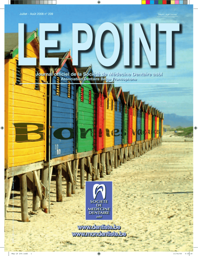 LE POINT Editeur responsable : Didier Eycken - Maison des Dentistes - Avenue De Fré 191 - 1180 Bruxelles - Journal Officiel de la Société de Médecine Dentaire asbl - Association Dentaire Belge Francophone. Juillet - Août 2008 n° 209 Mep LP 209.indd Dépôt Légal Leuven Journal officiel de la Société de Médecine Dentaire asbl Association Dentaire Belge Francophone www.dentiste.be www.mondentiste.be 1 13/06/08 9:05:38 Mep LP 209.indd 2 13/06/08 9:05:45 A l’aide ! En ces mois de mars et d’avril, nous avons été informés de trois agressions menées dans des cabinets dentaires de la capitale (Dent@l-Infos n°61 du 17 avril et n°62 du 23 avril). Après une dernière agression d’un médecin généraliste, les deux malfrats responsables de cette triste série ont été appréhendés. Grâce à la présence d’esprit d’une patiente. J’ai été personnellement choqué et écoeuré d’apprendre que l’on s’en prenne aussi lâchement à des professionnels de la santé, tout dévoués au bien-être des autres. Que ces crapules relèguent une bonne fois pour toutes leurs fantasmes aux oubliettes ! Un dentiste n’est pas riche. Un cabinet dentaire n’est pas une banque. On ne trouve de coffre-fort, ni au cabinet, ni au privé. Et puis, ça fait des lustres que nous n’utilisons plus d’or ; lequel d’ailleurs n’a aucune valeur en bijouterie. A la Société de Médecine Dentaire, nous avons pris ces faits très au sérieux. Nous sommes entrés en contact avec les autorités policières, afin que ces faits délictueux soient traités avec tout le sérieux voulu et pour envisager des mesures préventives. Nous avons aussi décidé de faire de la sécurité un sujet de nos peer-reviews. Ce genre d’agressions, violentes, graves, suscite aussi une réflexion particulière concernant les gardes dentaires. Il me paraît inconcevable, pour notre sécurité, pour celle de nos patients, d’assurer un rôle de garde nocturne. Et raisonnable de limiter celui-ci vers 22h00 en semaine (à Bruxelles) et aux matinées des week-ends et jours fériés. Avec une signalisation du cabinet de garde au bureau de police le plus proche, espérant obtenir une surveillance attentive ou une intervention rapide en cas de nécessité. Encore une fois, et dans ce domaine-ci aussi, réflexion et prévention prévalent. Didier Eycken Président de la Société de Médecine Dentaire é d i to Comme dans le pire des cauchemars, de ceux où vous hurlez sans voix, où personne ne vous entend, ne vous voit, vous devez vous rendre à l’évidence : vous aurez beau crier, nul ne viendra vous libérer. Vous êtes séquestré, pieds et poings liés, dans votre cabinet ! D’abord, ne pas céder à la panique. Respirer, le plus calmement possible. Réfléchir, vite. Mais que faire ? Vous résigner ? Ce n’est pas dans votre tempérament. Vous battre ? De la folie pure. Vous êtes seul. Qui plus est : ligoté et bâillonné. Ils sont deux. Peut-être plus. Déterminés. Peut-être drogués. Fuir ? Si seulement… Soudain, d’un mouvement, vous réussissez à défaire vos liens et n’écoutant que votre courage, vous sautez par la fenêtre. Pour vous retrouver quelques mètres plus bas, bras et cheville cassés. Mais libre. Dignement libre. Mep LP 209.indd 3 13/06/08 9:05:48 Le point - 209 - 2008 sommaire sommaire 7 3 Edito Didier EYCKEN - Président 7 Succès de foule à la journée de chirurgie 11 Journée de cours pour dentistes-stagiaires 11 13 Mission humanitaire au centre du Viêt-Nam, Da Nang Emmanuelle LERAT 15 Sommaire articles scientifiques 17 Composite à faible taux de rétraction Ramin ATTASH 21 IDEM Singapore Emmanuelle LERAT 27 Optimisez la communication interne au sein de votre équipe 13 Dr Edmond BINHAS 29 Activités accréditées en 2008 Mep LP 209.indd 4 13/06/08 9:06:12 Le point - 209 - 2008 sommaire 31 Sommaire formation continue 33 Vaincre l’épuisement professionnel Dr P MESTERS, F AZDIHMED 35 36 40 41 42 33 Peer-review - 20 septembre Parodontologie - 27 septembre Cours pratiques d’ergonomie Nouveautés - 18 octobre Médecine - 15 novembre 45 Sommaire Infos professionnelles 47 Nomenclature : de GRANDES modifications en ce 1er juillet Michel DEVRIESE 48 Pages culturelles Patricia MATHIEU 48 50 Study-Clubs 52 Study-Club de Namur - Ste Apolline 2008 F. GOOSSENS, C. HOSSAY 54 Petites annonces 50 58 Agenda Mep LP 209.indd 5 13/06/08 9:06:14 Mep LP 209.indd 6 13/06/08 9:06:24 SUCCÈS DE FOULE À LA JOURNÉE DE CHIRURGIE ! C’est dans le cadre élégantissime du Cercle de Wallonie, à Namur, que s’est déroulée la journée de chirurgie du mois d’avril. Les membres du service du Professeur Rompen (Université de Liège) se sont succédés pour aborder tous les aspects de la chirurgie buccale. De l’avis général, confirmé lors du dépouillement des évalua- tions, ce fut une belle journée d’informations cliniques bien utiles au praticien généraliste : de la préparation de l’acte chirurgical à la gestion post-opératoire. Et lorsque le soleil nous fait le plaisir de sa présence, la terrasse, qui offre une vue imprenable sur la vallée de la Meuse, est prise d’assaut. Pour des pauses aussi conviviales que méritées ! Mep LP 209.indd 7 13/06/08 9:06:55 Le lendemain matin, c’est la salle des travaux pratiques de l’Université de Liège qui accueillait des participants très appliqués, pour mettre la théorie en pratique : lambeaux, sutures, extractions, allongement coronaire,… Dans une ambiance toute liégeoise ! Mep LP 209.indd 8 13/06/08 9:07:25 Mep LP 209.indd 9 13/06/08 9:08:04 10 Mep LP 209.indd 10 13/06/08 9:08:30 Journée de cours pour dentistes-stagiaires Le vendredi 25 avril dernier, en parallèle au cours théorique de chirurgie qui se tenait à Namur, nous avons animé une journée de cours à thématique professionnelle à l’attention des jeunes consoeurs et confrères qui pour la première fois suivent une année de stage complémentaire dans leur