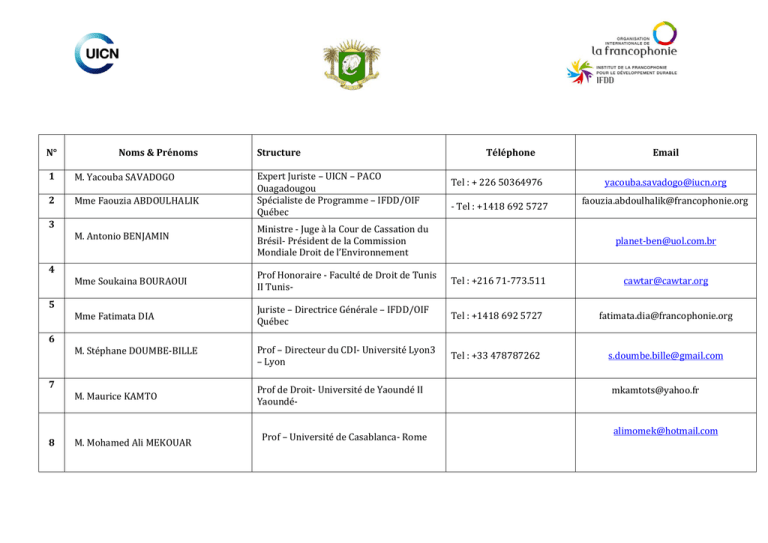 N° 1 2 3 4 5 6 7 8 Noms & Prénoms M. Yacouba SAVADOGO Mme Faouzia ABDOULHALIK M. Antonio BENJAMIN Mme Soukaina BOURAOUI Mme Fatimata DIA M. Stéphane DOUMBE-BILLE M. Maurice KAMTO M. Mohamed Ali MEKOUAR Structure Expert Juriste – UICN – PACO Ouagadougou Spécialiste de Programme – IFDD/OIF Québec Ministre - Juge à la Cour de Cassation du Brésil- Président de la Commission Mondiale Droit de l’Environnement Téléphone Tel : + 226 50364976 - Tel : +1418 692 5727 Email [email protected] [email protected] [email protected] Prof Honoraire - Faculté de Droit de Tunis II Tunis- Tel : +216 71-773.511 [email protected] Prof – Directeur du CDI- Université Lyon3 – Lyon Tel : +1418 692 5727 [email protected] Tel : +33 478787262 [email protected] Juriste – Directrice Générale – IFDD/OIF Québec Prof de Droit- Université de Yaoundé II Yaoundé- Prof – Université de Casablanca- Rome [email protected] [email protected] 9 10 11 12 13 14 15 16 M. Michel PRIEUR Prof Emérite - Université de Limoges Faculté de Droit et de Sciences Economiques Limoges Mme Patricia Kamerie-Mbote Prof – Université de Nairobi & Haute Cour de justice- Nairobi M. Vincent ZAKANE M. Robert A. WABUNOHA Mme Haddy JALLOW GUISSE M. Bougonou K. DJERI - ALASSANI Ministre de la Fonction Publique du travail et Sécurité Sociale du Burkina Faso Ouagadougou Juriste – Bureau Régional Afrique & Division Droit de l’Environnement et Conventions – PNUE- Nairobi- Associate Legal officer MEAs- Division of Environmental Law and ConventionsNairobi - PNUE Environment Law and Environment Management -CEDEAO M. Vladimir FAGBOHOUM African Development Bank | Legal Services Department | Public Sector Operations M. Drissa Naman KEITA Conseiller Juridique Autorité du Bassin du Niger – ABN Tel: (33) 05 55 34 97 24 [email protected] [email protected] [email protected] [email protected] Tel. + 254 20 7625068 Tel: (254-20) 762 5290 [email protected] [email protected] Tel: + 234 80 67 13 01 59 / +228 9018 13 15 [email protected] [email protected] Tel: +216 7110 3635 [email protected] Tel: (+227) 91 91 91 72/ 96 52 74 77 [email protected] [email protected] 17 Honorable M. Kapouné KARFO 18 M. Amidou GARANE 19 M. Aimé NIANOGO 20 M. Racine KANE 21 M. Ibrahima LY 22 M. Brice Séverin PONGUI 23 M. Michel TESSOH TENE 24 25 Mme Euphrasie Françoise ATENGUENA née NGONO M. Saadou ALADOUA Député - Assemblée Nationale du Burkina Faso –Réseau des Parlementaires Burkinabé pour le Sahel - Tel : +226 70211246 [email protected] [email protected] Prof – Directeur Régional de l’UICN Afrique de l’Ouest et du Centre – Ouagadougou Tel : + 226 76676518 [email protected] Tel : + 226 50364976 [email protected] Tel : +221338690280 [email protected] Enseignant Chercheur Juriste de l’Environnement- Université Ouaga II Ouagadougou- Chef de Programme UICN – Sénégal Enseignant Chercheur – Directeur Laboratoire Droit de l’Environnement et de la Santé – UCAD – Dakar Tel :+221 776324826 [email protected] Juriste Observatoire satellital des forêts d’Afrique centrale et World ressource Institute - OSFAC -WRI Tél : 00242 06 665 77 35 Etudiant – Université Yaoundé I Tel : + 237 74611036 [email protected] [email protected] Juriste, Chef Service contentieux Ministère de l’Environnement, de la Protection de la Nature & DD, Yaoundé Tél : +237 22 23 68 85 [email protected] [email protected] Magistrat - Directeur Foncier Rural, Ministère de la Justice Niamey Tél : + 227 96995079/ 20722094 [email protected] [email protected] [email protected] [email protected] 26 27 28 29 30 31 32 33 34 37 M. Ahoahome AGBEMELO TSOMAFO M. Nicolas BIRON Mme Cécile DUCLAUX MONTEIL. Mme Khadidiatou née DRAME M. Hafizou BONCANA Tél : +228 90344374 Enseignante- Consultante Droit Env Tél : +33 67255473/+241 04871762 Spécialiste de programme Bureau Régional Afrique de l’Ouest – OIF- Lomé Etudiant- Ecole Nationale des Eaux & Forêts Libreville M. Bob Hermann DOMBOLO M. Taméon Benoit DANVIDE Consultant JAT- Consulting (Environnement & doit) Lomé - Coordonnatrice - Cellule Affaires Juridiques - Ministère Environnement Dakar Assistant de Recherche – Ecole Africaine des Métiers de l’Architecture et de l’Urbanisme (EAMAU) - Cotonou Enseignant – Université de Bamako Juriste- Direction des Affaires Juridiques et M. Firmin Wen-Pagnagdé OUEDERAOGO du Contentieux- Ministère Environnement & DD -Ouagadougou Mlle. Anaïs VORON Mlle Marie BONNIN Chargée de la valorisation et de la capitalisation scientifique - Fondation 2iEOuagadougou Tél : (228) 2 221 63 50 [email protected] [email protected] [email protected] [email protected] Tel :+241 04381252 [email protected] Tél: 221 776563860 [email protected] Tél :+229 94 140 069 [email protected] [email protected] Tel : 00223 76197677 Tél : +226 78190087 Tél : +226 76 42 88 63 Chercheur Institut de recherche pour le Tél : +33611193482 Développement - IRD [email protected] [email protected] [email protected] [email protected] [email protected] 38 39 40 41 42 43 44 45 46 47 48 49 50 51 M. Michel CARRIE M. Aenza KONATE M. Martin YELKOUNI Mme Salamatou Ouceiny HAMAN née BAKO M. Mady Emmanuel A. GOGOUA Mme Marina Céline BAYEBA M. Ange David Emmanuel BAIMEY M. Prosper KOUAME Mlle Marie Ella Opportune DESSIE M. Parfait OUMBA Patricia ZAGRE M. Léon Koffi AKESSEY M. Lassana KONE M. Yannick Alain TROUPAH Spécialiste de programme DDPDH –OIF Paris Tél : +33 1 44 37 32 90 Directeur Deprt Environnement – Université Senghor Alexandrie - Tel : +201284318758 Avocat Barreau de la Cote d’Ivoire Tél : +225 02 02 01 90 Conseiller Juridique au Minist. Env DD et Energie - Paris Expert Environnement - Directeur Général H&B Consulting – Bureau d’Etude Juriste Chef du service Juridique- Ministère Env. Salubrité Urbaine et DD - Abidjan Directeur Exécutif de Jeune Volontaire pour l’Environnement –JVE Cote d’IvoireJuriste – Assistant Chef du Service Juridique- Minist Env. Sa