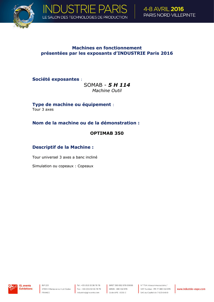 Machines en fonctionnement présentées par les exposants d’INDUSTRIE Paris 2016 Société exposantes : SOMAB - 5 H 114 Machine Outil Type de machine ou équipement : Tour 3 axes Nom de la machine ou de la démonstration : OPTIMAB 350 Descriptif de la Machine : Tour universel 3 axes a banc incliné Simulation ou copeaux : Copeaux Machines en fonctionnement présentées par les exposants d’INDUSTRIE Paris 2016 Société exposantes : SOMAB - 5 H 114 Machine Outil Type de machine ou équipement : Centre multifonctions 5 axes Nom de la machine ou de la démonstration : GENYMAB 400 Descriptif de la Machine : Centre de tournage et fraisage Simulation ou copeaux : Copeaux Machines en fonctionnement présentées par les exposants d’INDUSTRIE Paris 2016 Société exposantes : SOMAB - 5 H 114 Machine Outil Type de machine ou équipement : Centre d'usinage 5 axes Nom de la machine ou de la démonstration : DIAM 620 5 axes Descriptif de la Machine : Centre d'usinage vertical 5 axes Simulation ou copeaux : Copeaux Machines en fonctionnement présentées par les exposants d’INDUSTRIE Paris 2016 Société exposantes : DATRON France SAS - J20 Machine Outil Type de machine ou équipement : Centre UGV Nom de la machine ou de la démonstration : DATRON MLCube LS Descriptif de la Machine : fraiseuse à commande numérique Démonstration avec copeaux 1ère présentation en Europe Machines en fonctionnement présentées par les exposants d’INDUSTRIE Paris 2016 Société exposantes : DELTA MACHINES - A57 Machine Outil Type de machine ou équipement : Centre d'usinage Nom de la machine ou de la démonstration : VB1650 Descriptif de la Machine : Centre d'usinage FEELER type VB1650 Simulation et copeaux 1ère présentation en France Machines en fonctionnement présentées par les exposants d’INDUSTRIE Paris 2016 Société exposantes : DELTA MACHINES - A57 Machine Outil Type de machine ou équipement : Centre d'usinage Nom de la machine ou de la démonstration : VMP45A Descriptif de la Machine : Centre d'usinage FEELER type VMP45A Simulation et copeaux 1ère présentation en France Machines en fonctionnement présentées par les exposants d’INDUSTRIE Paris 2016 Société exposantes : DELTA MACHINES - A57 Machine Outil Type de machine ou équipement : Centre d'usinage Nom de la machine ou de la démonstration : HV40 Descriptif de la Machine : Centre d'usinage FEELER type HV40 Simulation et copeaux 1ère présentation en France Machines en fonctionnement présentées par les exposants d’INDUSTRIE Paris 2016 Société exposantes : DELTA MACHINES - A57 Machine Outil Type de machine ou équipement : Centre de tournage fraisage Nom de la machine ou de la démonstration : TMA8E-IV Descriptif de la Machine : Centre de tournage fraisage TSUGAMI type TMA8E-IV Simulation et copeaux Machines en fonctionnement présentées par les exposants d’INDUSTRIE Paris 2016 Société exposantes : DELTA MACHINES - A57 Machine Outil Type de machine ou équipement : Tour à poupée mobile Nom de la machine ou de la démonstration : BW290 Descriptif de la Machine : Tour à poupé mobile TSUGAMI type BW290 Simulation et copeaux Machines en fonctionnement présentées par les exposants d’INDUSTRIE Paris 2016 Société exposantes : DELTA MACHINES - A57 Machine Outil Type de machine ou équipement : Tour robotissé Nom de la machine ou de la démonstration : KNC50 FA Descriptif de la Machine : Tour robotisé type KNC50 FA Simulation ou/et copeaux : Simulation Machines en fonctionnement présentées par les exposants d’INDUSTRIE Paris 2016 Société exposantes : DELTA MACHINES - A57 Machine Outil Type de machine ou équipement : Centre d'usinage Nom de la machine ou de la démonstration : C12 Descriptif de la Machine : Centre d'usinage 5 axes HEMRLE type C12 Simulation ou/et copeaux : Simulation Machines en fonctionnement présentées par les exposants d’INDUSTRIE Paris 2016 Société exposantes : DELTA MACHINES - A57 Machine Outil Type de machine ou équipement : Centre d'usinage Nom de la machine ou de la démonstration : C400 Descriptif de la Machine : Centre d'usinage 5 axes HEMRLE type C400 Simulation ou/et copeaux : Simulation Machines en fonctionnement présentées par les exposants d’INDUSTRIE Paris 2016 Société exposantes : DELTA MACHINES - A57 Machine Outil Type de machine ou équipement : Tour multi axes Nom de la machine ou de la démonstration : CT1 Descriptif de la Machine : Centre de tournage fraisgae multi axes CCM type CT1 Simulation et copeaux Machines en fonctionnement présentées par les exposants d’INDUSTRIE Paris 2016 Société exposantes : DELTA MACHINES - A57 Machine Outil Type de machine ou équipement : Centre d'usinage Nom de la machine ou de la démonstration : VCC1200 Descriptif de la Machine : Centre d'usinage AXA type VCC1200 Simulation et copeaux Machines en fonctionnement présentées par les exposants d’INDUSTRIE Paris 2016 Société exposantes : DELTA MACHINES - A57 Machine Outil Type de machine ou équipement : Tour à commande numérique Nom de la machine ou de la démonstration : M06SY Descriptif de la Machine : Tour à commande numérique TSUGAMI type M06SY Simulation ou/et copeaux : Simulation Machines en fonctionnement présentées par les exposants d’INDUSTRIE Paris 2016 Société exposantes : DELTA MACHINES - A57 Machine Outil Type de machine ou équipement : Machine électroérosion à fil Nom de la machine ou de la démonstration : MV2400R Descriptif de la Machine : Machine électroérosion à fil MITSUBISHI type MV2400R Simulation et copeaux Machines en fonctionnement présentées par les exposants d’INDUSTRIE Paris 2016 Société exposantes : TOYODA - P50 Machine Outil Type de machine ou équipement : CENTRE D'USINAGE PAR TAILLAGE SKIVING Nom de la machine ou de la démonstration : GS300H Descriptif de la Machine : Machine d'usinage combiné des engrenages par unification des process de taillage, tournage, fraisage, percage, taraudage. Simulation ou/et copeaux : O