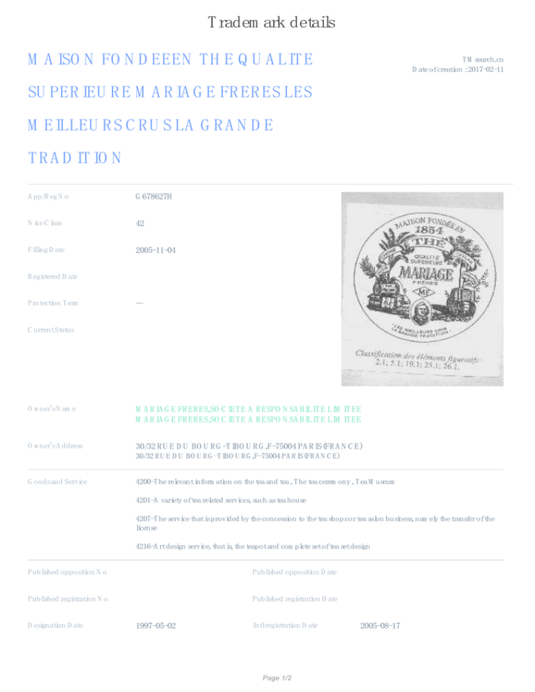 Trademark details MAISON FONDEEEN THE QUALITE TMsearch.cn Date of creation : 2017-02-11 SUPERIEURE MARIAGE FRERES LES MEILLEURS CRUS LA GRANDE TRADITION App/Reg No G678627H Nice Class 42 Filling Date 2005-11-04 Registered Date Protection Term -- Current Status Owner's Name MARIAGE FRERES,SOCIETE A RESPONSABILITE LIMITEE MARIAGE FRERES,SOCIETE A RESPONSABILITE LIMITEE Owner's Address 30/32 RUE DU BOURG-TIBOURG,F-75004 PARIS(FRANCE) 30/32 RUE DU BOURG-TIBOURG,F-75004 PARIS(FRANCE) Goods and Service 4200-The relevant information on the tea and tea , The tea ceremony , Tea Museum 4201-A variety of tea related services, such as tea house 4207-The service that is provided by the concession to the tea shops or tea salon business, namely the transfer of the license 4216-Art design service, that is, the teapot and complete set of tea set design Published opposition No Published opposition Date Published registration No Published registration Date Designation Date 1997-05-02 Intl registration Date Page 1/2 2005-08-17 Prority Date Type of Mark Attorney Name General mark Coownership Records History Page 2/2 Powered by TCPDF (www.tcpdf.org) No