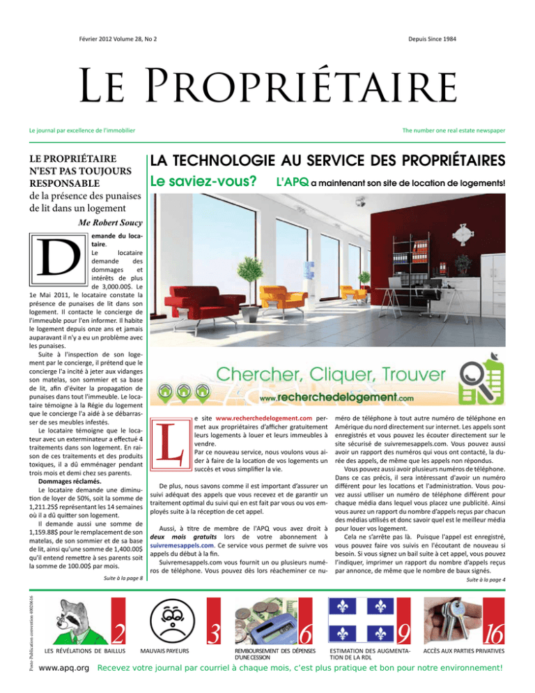 Février 2012 Volume 28, No 2 Depuis Since 1984 Le Propriétaire Le journal par excellence de l’immobilier The number one real estate newspaper LE PROPRIÉTAIRE N'EST PAS TOUJOURS RESPONSABLE de la présence des punaises de lit dans un logement LA TECHNOLOGIE AU SERVICE DES PROPRIÉTAIRES Le saviez-vous? L'APQ a maintenant son site de location de logements! Me Robert Soucy D emande du locataire. Le locataire demande des dommages et intérêts de plus de 3,000.00$. Le 1e Mai 2011, le locataire constate la présence de punaises de lit dans son logement. Il contacte le concierge de l'immeuble pour l'en informer. Il habite le logement depuis onze ans et jamais auparavant il n'y a eu un problème avec les punaises. Suite à l'inspection de son logement par le concierge, il prétend que le concierge l'a incité à jeter aux vidanges son matelas, son sommier et sa base de lit, afin d'éviter la propagation de punaises dans tout l'immeuble. Le locataire témoigne à la Régie du logement que le concierge l'a aidé à se débarrasser de ses meubles infestés. Le locataire témoigne que le locateur avec un exterminateur a effectué 4 traitements dans son logement. En raison de ces traitements et des produits toxiques, il a dû emménager pendant trois mois et demi chez ses parents. Dommages réclamés. Le locataire demande une diminution de loyer de 50%, soit la somme de 1,211.25$ représentant les 14 semaines où il a dû quitter son logement. Il demande aussi une somme de 1,159.88$ pour le remplacement de son matelas, de son sommier et de sa base de lit, ainsi qu'une somme de 1,400.00$ qu'il entend remettre à ses parents soit la somme de 100.00$ par mois. Poste-Publication convention 40020616 Suite à la page 8 2 LES RÉVÉLATIONS DE BAILLUS www.apq.org L e site www.recherchedelogement.com permet aux propriétaires d’afficher gratuitement leurs logements à louer et leurs immeubles à vendre. Par ce nouveau service, nous voulons vous aider à faire de la location de vos logements un succès et vous simplifier la vie. De plus, nous savons comme il est important d’assurer un suivi adéquat des appels que vous recevez et de garantir un traitement optimal du suivi qui en est fait par vous ou vos employés suite à la réception de cet appel. Aussi, à titre de membre de l'APQ vous avez droit à deux mois gratuits lors de votre abonnement à suivremesappels.com. Ce service vous permet de suivre vos appels du début à la fin. Suivremesappels.com vous fournit un ou plusieurs numéros de téléphone. Vous pouvez dès lors réacheminer ce nu- MAUVAIS PAYEURS méro de téléphone à tout autre numéro de téléphone en Amérique du nord directement sur internet. Les appels sont enregistrés et vous pouvez les écouter directement sur le site sécurisé de suivremesappels.com. Vous pouvez aussi avoir un rapport des numéros qui vous ont contacté, la durée des appels, de même que les appels non répondus. Vous pouvez aussi avoir plusieurs numéros de téléphone. Dans ce cas précis, il sera intéressant d'avoir un numéro différent pour les locations et l'administration. Vous pouvez aussi utiliser un numéro de téléphone différent pour chaque média dans lequel vous placez une publicité. Ainsi vous aurez un rapport du nombre d’appels reçus par chacun des médias utilisés et donc savoir quel est le meilleur média pour louer vos logement. Cela ne s’arrête pas là. Puisque l'appel est enregistré, vous pouvez faire vos suivis en l'écoutant de nouveau si besoin. Si vous signez un bail suite à cet appel, vous pouvez l’indiquer, imprimer un rapport du nombre d’appels reçus par annonce, de même que le nombre de baux signés. Suite à la page 4 3 6 REMBOURSEMENT DES DÉPENSES D'UNE CESSION 9 ESTIMATION DES AUGMENTATION DE LA RDL 16 ACCÈS AUX PARTIES PRIVATIVES Recevez votre journal par courriel à chaque mois, c’est plus pratique et bon pour notre environnement! 2 Le Propriétaire LES RÉVÉLATIONS DE BAILLUS BAILLUS VOUS DIT COMBIEN DE TEMPS VOUS POURRIEZ ATTENDRE ET POURQUOI C vous attendre. hers propriétaires, si vous avez l’intention de déposer une demande à la Régie du logement sous peu, voici les délais auxquels vous devez (Basé sur le rapport annuel de la Régie du logement 2010-2011 et sur nos expériences personnelles) Délais Demande de non paiement: 5 à 7 semaines Fixation de loyer: 10 mois Reprise de logement: - 2 mois si la demande est déposée un autre mois que Décembre - Janvier - 3 à 5 mois si la demande est déposée au mois de Décembre - Janvier La majorité du temps, les causes de reprises sont entendues avant la fin du bail. Sauf si, en raison d'une remise ou Pour la mise au rôle des causes autres que mentionné ci-haut, il y a 3 types de niveau de priorité: générale, prioritaire et urgente. Urgente étant la catégorie qui est entendue le plus rapidement soit plus ou moins 1 à 4 mois de délai et les causes civiles générales peuvent aller de 15 à 17 mois de délai. Les causes prioritaires varient entre ces délais. Autres informations pertinentes: La liste des causes entendues dans la même journée s’appels «un rôle». La Régie du logement dispose d'une équipe spécifiquement attitrés pour déterminer dans quel ordre les dossiers vont être entendus et dans quel délai. Ces employés se nomment «Maître des rôles». Ils disposent d’un barème comme une infirmière au triage dans une urgence. Ce barème n’est pas connu du public. En fonction de ce qui est écrit dans chaque demande, les maîtres des rôles trient les dossiers et les classent dans les 3 catégories décrites plus haut et dressent les rôles pour audience. Il est donc utile d’inscrire dans votre demande des informations sur la gravité de la situation pour ainsi aider le personnel de la Régie du logement à mieux interpréter Janvier 2012 Volume 28, No 1 votre d e mande. P o u r les causes urgentes, il serait souhaitable de détailler le temps nécessaire po
